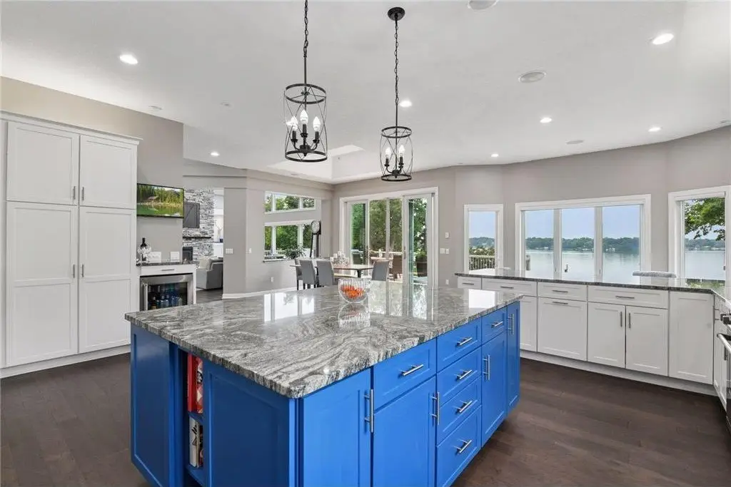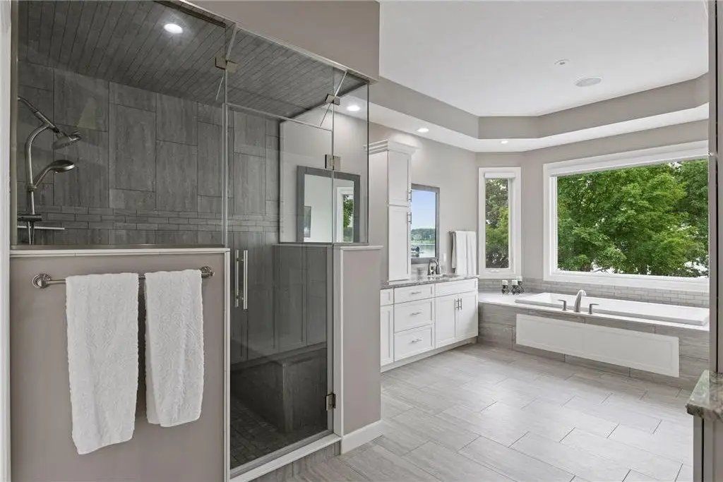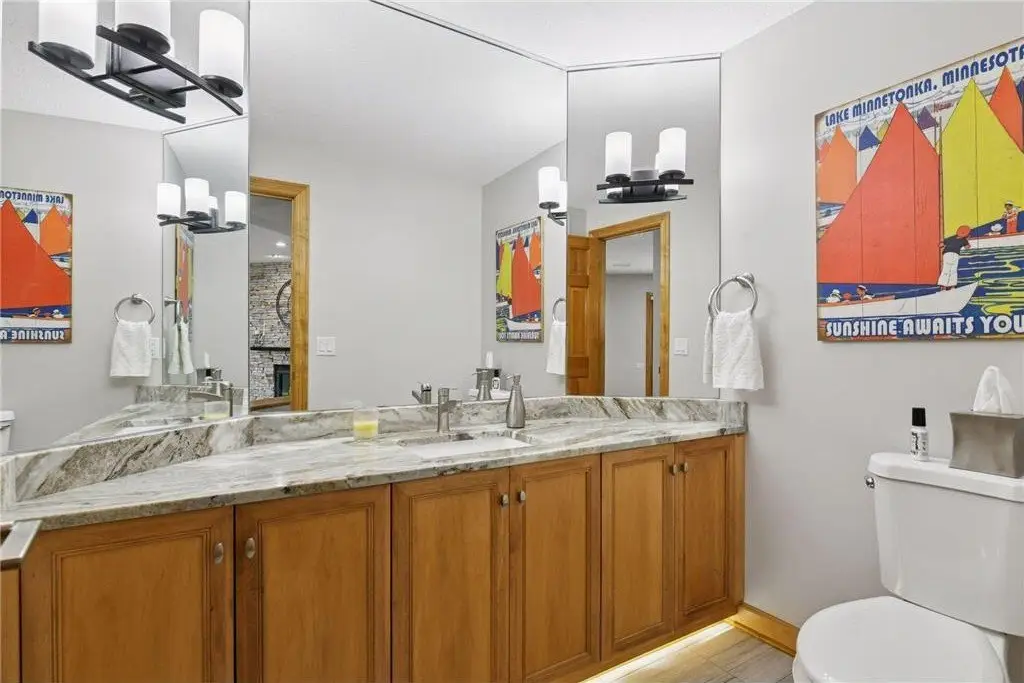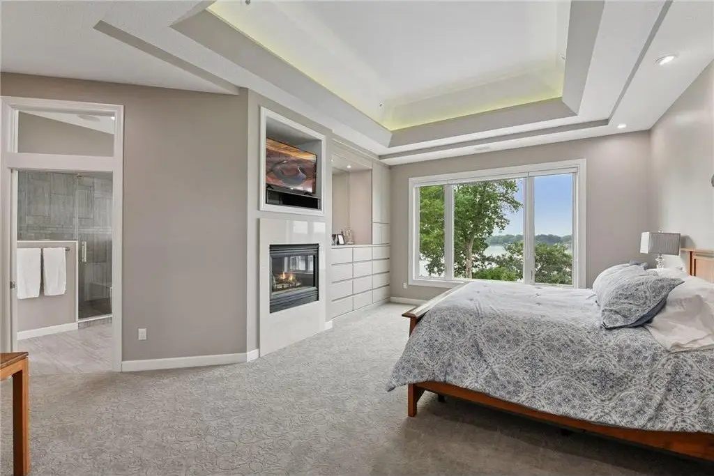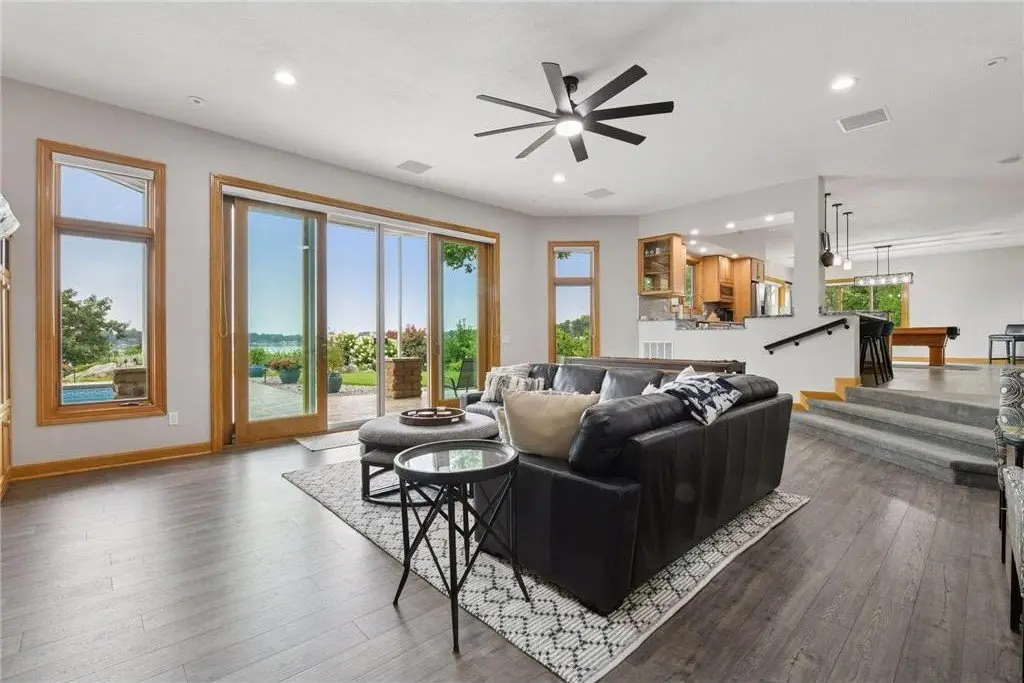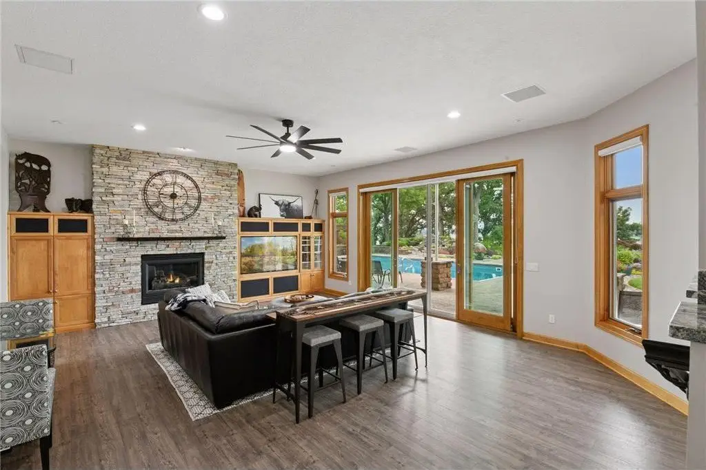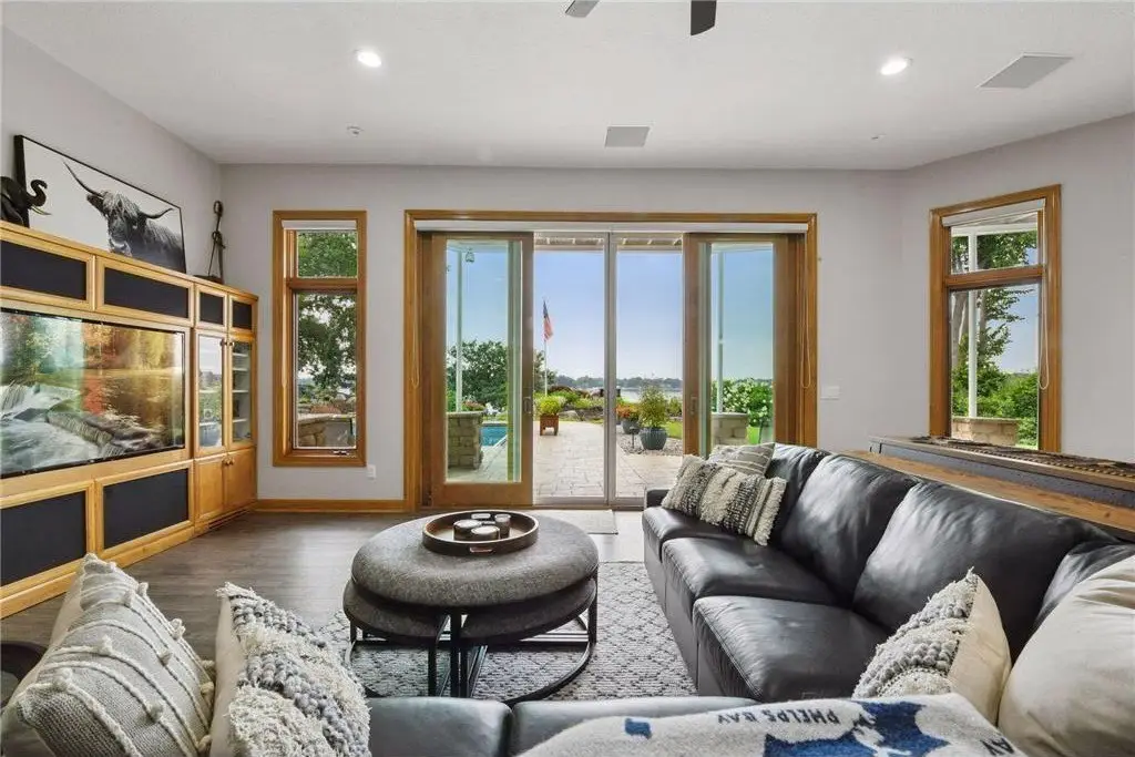 This amazing Lake Minnetonka home sits on 128 feet of south-facing shoreline overlooking Jennings Bay. A refreshing 20 x 40-foot saltwater pool and tranquil waterfall feature and beautifully manicured landscaping seamlessly connects the pool area to the lakefront. This exceptional home is filled with natural light, dramatic vaults, stunning lake views, hardwood floors, and amazing updates throughout. A vaulted wall of windows showcasing long lake views takes center stage. The redesigned chef’s kitchen - well-appointed with premium amenities, an informal dining area with deck access + bayed sitting area are the heart of the home. Main level living convenience includes the primary suite with stunning bath with steam shower and soaker tub, a walk-in primary closet with center island, a vaulted office, laundry, mudroom and two additional baths on this main level. The walk-out lower level is entertainment ready with its large family room offering a gas fireplace with stone surround & large doors which slide open to connect to the pool area + an adjoining 2nd kitchen and billiards/game area. Also find three bedrooms and three baths, and a huge workshop and second laundry and storage areas. Geothermal heating and cooling and sound system throughout the house. Incredible curb appeal with circular concrete drive, mature landscaping, and room for six cars between the upper and lower garages.
