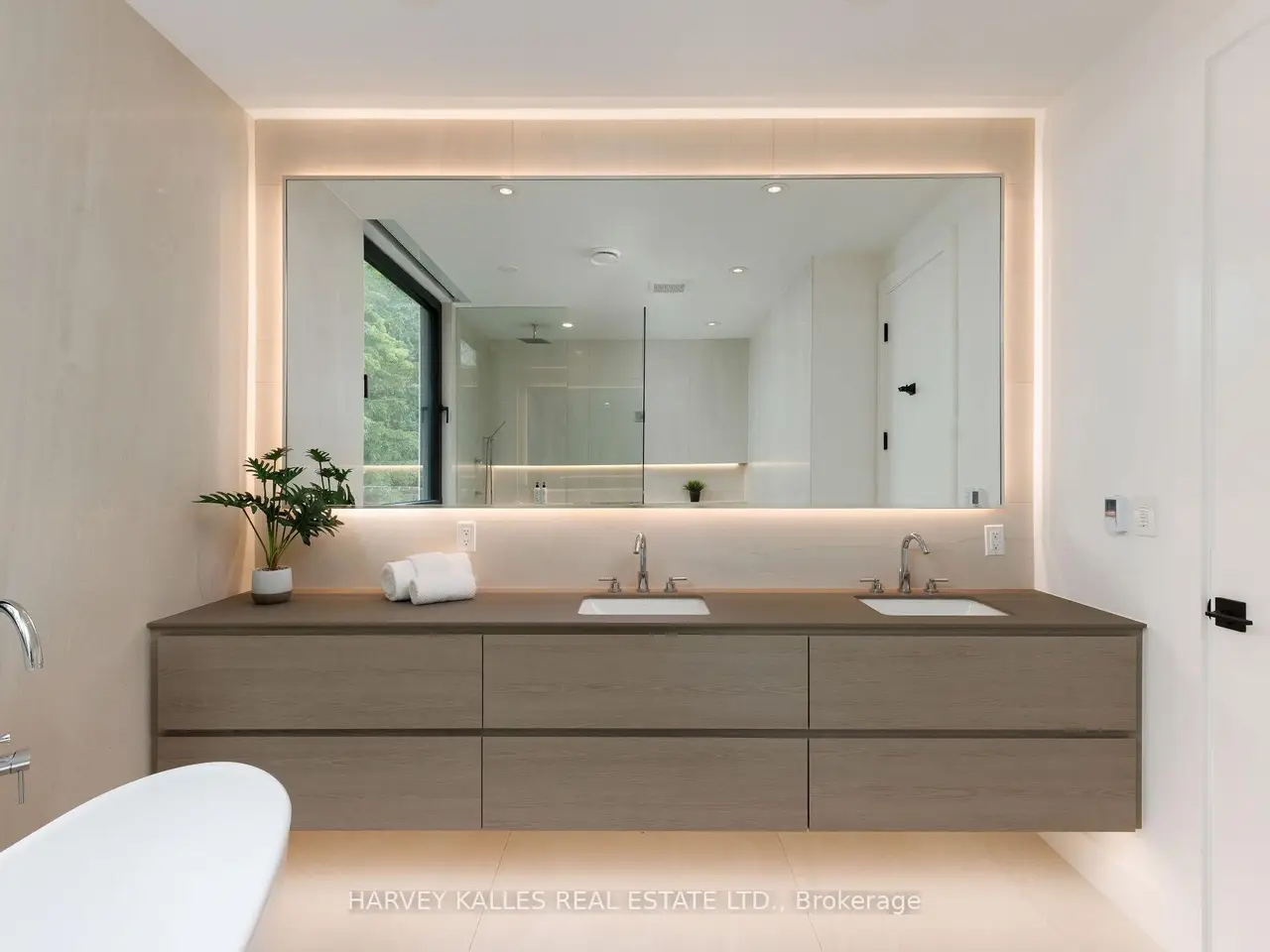 Exceptional custom residence with a masterful fusion of contemporary design with serene Zen influences. 6600+ sq. ft. of finished living space, carefully crafted over four years. Dramatic 20-foot foyer with its illuminated glass pivot door, with expansive light-filled spaces highlighted by a floating staircase, architectural feature panel walls, and warm custom millwork. On the main level, a modern family room with a striking two-sided linear fireplace provides both comfort and sophistication, while the bespoke executive office offers custom millwork and gorgeous treetop views. The chef's kitchen is a true showpiece, featuring Miele appliances, a PITT gas counter range, and a separate catering kitchen. A stylish powder room, skylights, heated floors, and refined cabinetry complete the main level. The primary suite is your private retreat with a spa-inspired ensuite, custom walnut and glass walk-in closets, and a cozy lounge complete with 3-sided fireplace ambiance. Additional bedrooms feature en-suite baths and built-in cabinetry, with a flexible fourth bedroom suite that provides versatility. Your laundry room with full custom millwork completes the upper level. The lower level is an entertainment and wellness oasis: 15-seat soundproof theatre, glass-walled temperature-controlled wine cantina, open-concept gym, and a sleek wet bar create the ultimate space for relaxation and hosting. A nanny or guest suite with a spa-like ensuite and direct walkout to the landscaped grounds ensures comfort and privacy for extended stays. The exterior showcases modern brick and aluminum cladding, beautifully landscaped grounds with irrigation, and sleek architectural lighting. Technology is seamlessly integrated with a Control4 smart home automation system, delivering comfort, convenience, and efficiency at your fingertips. This is more than a home, it is a contemporary Zen oasis, where design, technology, and tranquility converge to create a sanctuary for modern living.