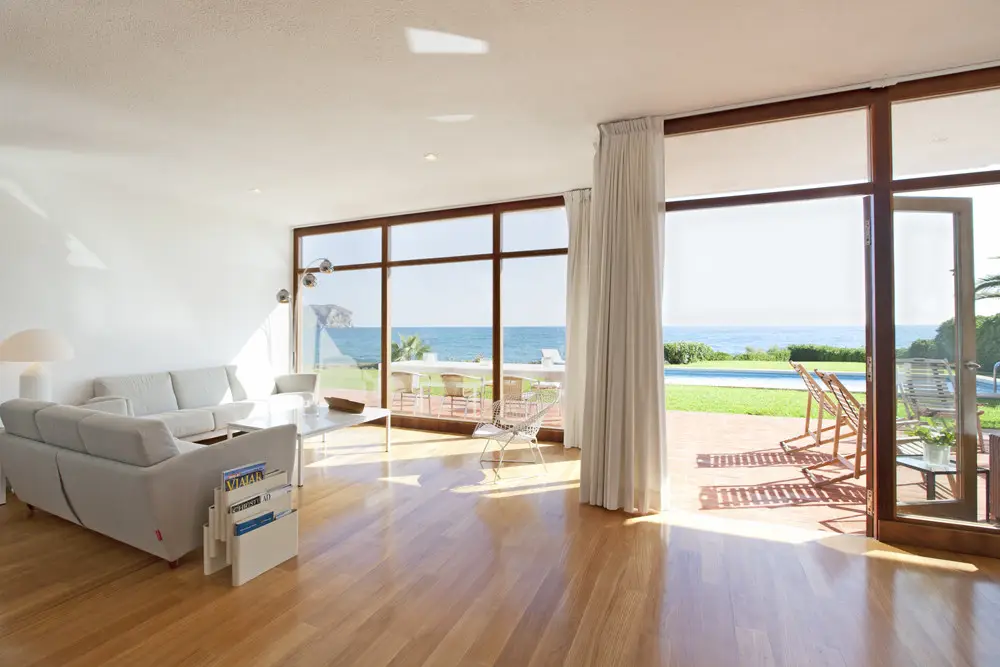 Exclusive villa with a front-line position in the prestigious area of Montañar II, with direct access to the sea and with fantastic views over Jávea Bay. The property stands on a 1,800 sq.m plot and the living space is spread over one floor. Of modern style, with straight lined design, the home comprises of very comfortable and practical living spaces, at only a few minutes stroll from all amenities and several leisure facilities at Jávea's Arenal beach. The villa features a dining room with tall panoramic windows which frame fantastic views of the sea. Outdoors there is a swimming pool and a BBQ area. The property further comprises 4 double bedrooms with walk-in wardrobes, 3 family bathrooms, a fully-equipped kitchen with an office area and with access onto the outdoor patio and the utility room. The residence enjoys a privileged location, surrounded by beautiful gardens filled with Mediterranean plants and palm trees. Next to the pool there is an outdoor terrace with awnings, from which one can enjoy the unbeatable views and the Mediterranean sea breeze. Other notable features include; A/C, a large garage and an alarm system. All the rooms have wooden flooring and the lounge has stone walls, a feature typical of properties in Jávea, creating a very welcoming atmosphere. From the terrace one can enjoy the impressive views over the sea. This is one of the most exclusive front-line homes in Jávea with direct access to the sea.