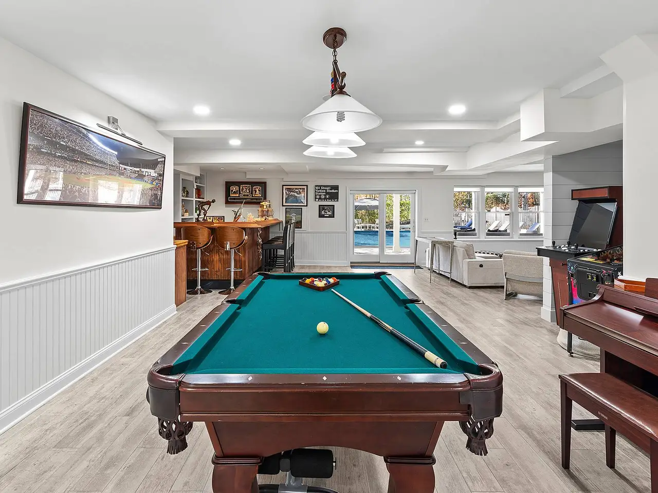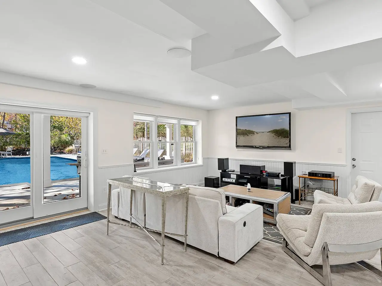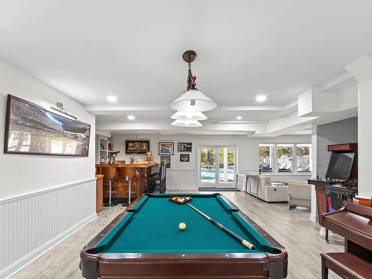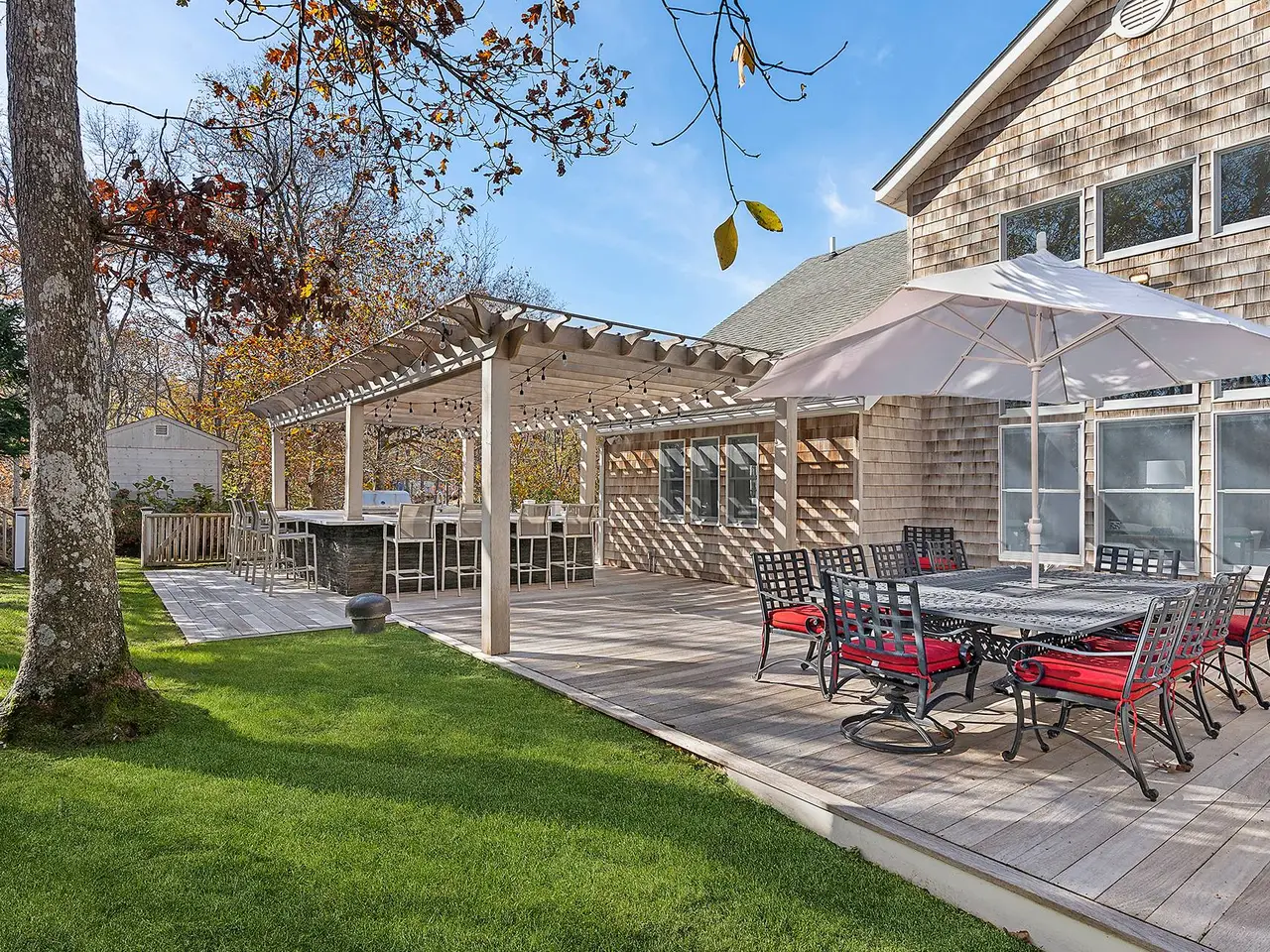 Nestled on an acre in Montauk's Hither Woods, adjacent to over a thousand acres of pristine reserve, this extraordinary home is a private, amenity-filled oasis perfect for both entertaining and luxurious relaxation. The meticulously landscaped property boasts a 4-bedroom (plus bonus room) home, a heated gunite pool, a spectacular outdoor kitchen, and over 3,500 square feet of decks and terraces. Just three blocks from the ocean beach, it's rare to find a turnkey home with such an array of amenities so close to both the ocean and preserved land in Montauk. Spanning over 4,600 square feet across three levels, the home includes an incredible finished walkout lower level designed for entertainment. This space features a professional bar, game room with a full entertainment system, arcade, billiards, a gym, an office, and more-all opening out to the pool area, creating a seamless indoor/outdoor flow. On the first floor, expansive living spaces include a music room, dedicated movie theater, multiple living rooms, a formal dining room, a cozy den, and a gourmet kitchen equipped with state-of-the-art appliances from Wolf and Sub-Zero, plus a spacious breakfast area. This level also hosts a gorgeous primary en-suite with luxurious bath. The second floor houses 3 bedroom suites. The home showcases marble tile, hardwood floors in a herringbone pattern, expert millwork, and masonry throughout---all arranged in perfect harmony. The entire home, along with the exterior lounging spaces and pool, features a Sonos Audio System. Every inch carefully designed for comfort, convenience, and luxury. The outdoor areas are crafted for social gatherings and thoughtfully integrated with the interiors. A 20' x 40' pool is surrounded by an expansive bluestone terrace flanked by a gorgeous stone wall. A custom pergola adorned with wisteria shelters the stunning professional outdoor kitchen, which features Cambria countertops and stainless steel Lynx appliances. A koi pond with a waterfall lies farther beyond. Extensive landscape lighting adds to the overall ambiance. Endless terraces and decks provide ample seating and gathering spaces for parties of up to 200 guests. Privacy is ensured with a full privet hedge and electronic gate. Additional amenities include a generator, a brand-new septic system (larger than needed anticipating future expansion) four heating/AC zones, and new state-of-the-art boilers. There is also a permit in place to expand the home, including adding a garage, office, and expanding one of the second-floor bedrooms to become another primary suite with its own bathroom. Expansion plans in place. This turnkey oasis is just moments from the ocean in Hither Hills, offering unparalleled luxury in Montauk. Listing ID: 917717