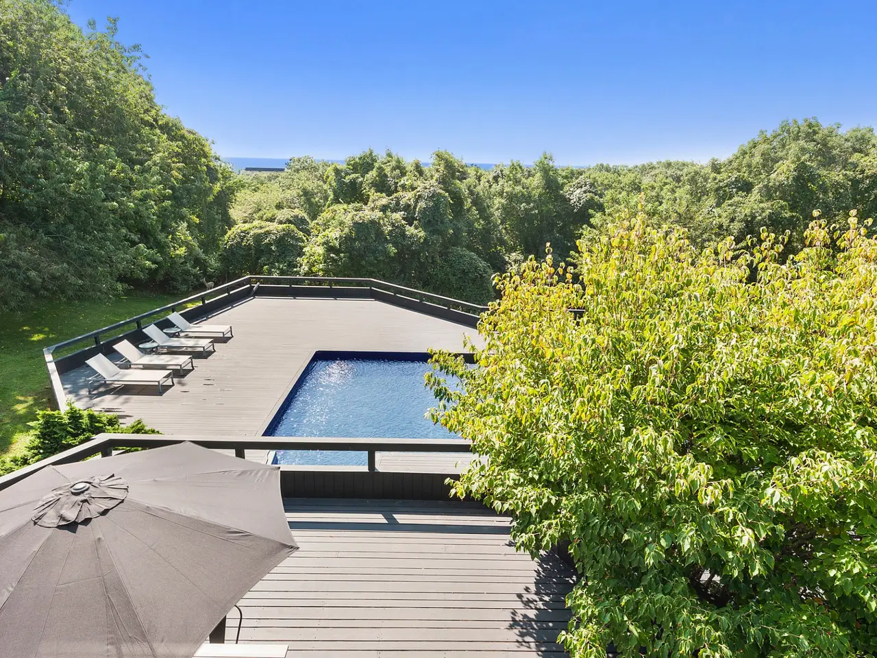 Stylish and hip contemporary homes offer distant Atlantic Ocean views. The residence has 3,400 square feet of designer decorated living space. The entry foyer leads into a spacious, light-filled living room and an open chef's kitchen and dining area. The master suite, located on the second floor, has a private outdoor deck overlooking the pool, property and views of the ocean. Entertain outside on multiple decks surrounding the oversized heated pool. Sited on 3/4 acre, this Montauk gem is the perfect summer spot!