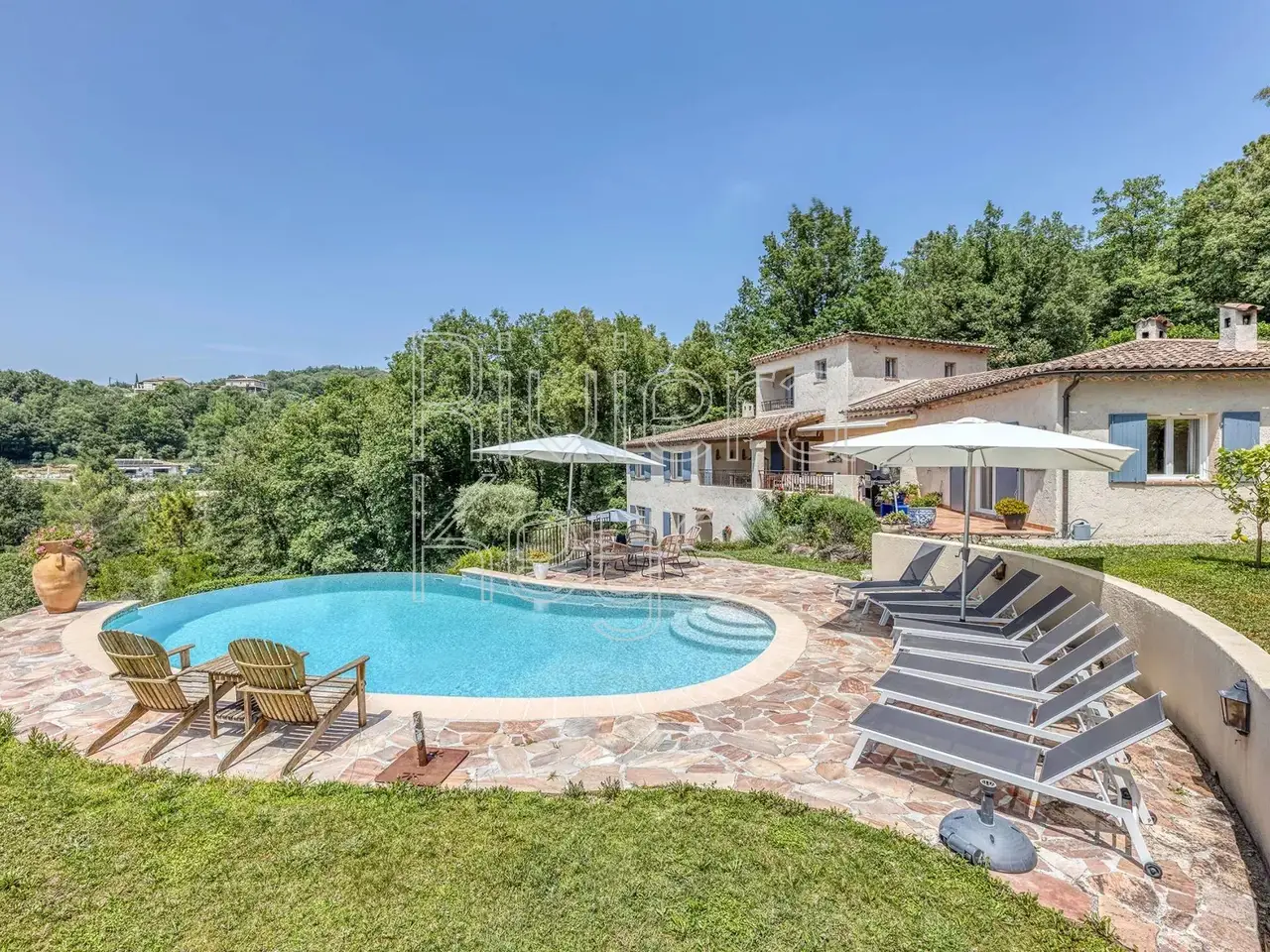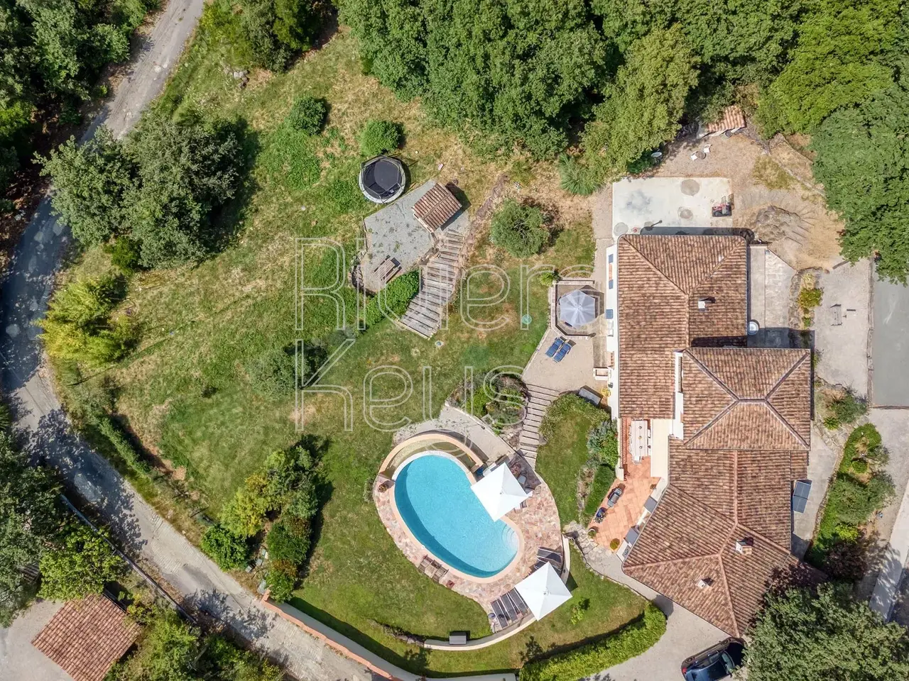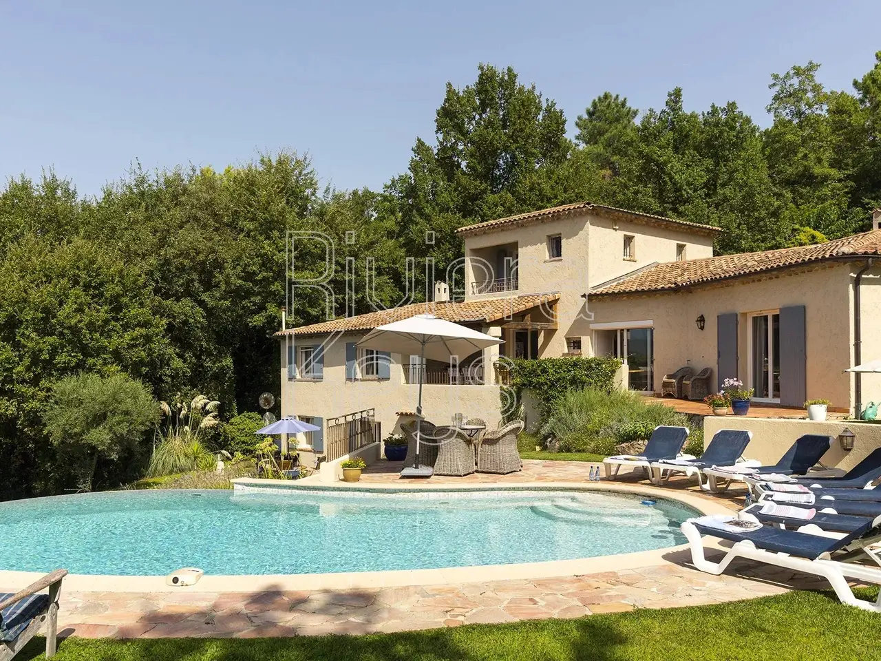 Elegance, solid craftsmanship, and harmony define this magnificent property. Located about a ten-minute walk from the charming village of Montauroux, the villa is surrounded by its delightful garden. The property, with a living area of 237 m², features a welcoming entrance hall, a spacious and bright living room with a fireplace, a dining room that opens onto the terrace, and an open-plan kitchen. There is also an office, a WC, a bathroom, and 3 bedrooms on the ground floor. On the upper floor, there is a bedroom that opens onto a covered terrace, along with a shower room and a WC. The lower floor includes a studio with an entrance hall, a cellar, a fully equipped kitchen that connects to the dining area, and a small workshop. The studio also offers 2 bedrooms, a shower room, a WC, and a lovely terrace. At the entrance to the property, there is a carport and space for parking up to four additional cars. The carpentry throughout the house is crafted from solid light oak of the highest quality. The 2,500 m² plot boasts beautiful landscaping, with roses, lavender, and olive trees enhancing the surroundings as they slope gently toward the pool area. The pool, measuring 10 x 5 meters, is surrounded by ample space for dining, swimming, and leisure. Adjacent to the pool, there is a large summer kitchen and a boules court. This exceptional property provides tranquility, relaxation, and harmony, offering an ideal setting for both intimate and larger gatherings.