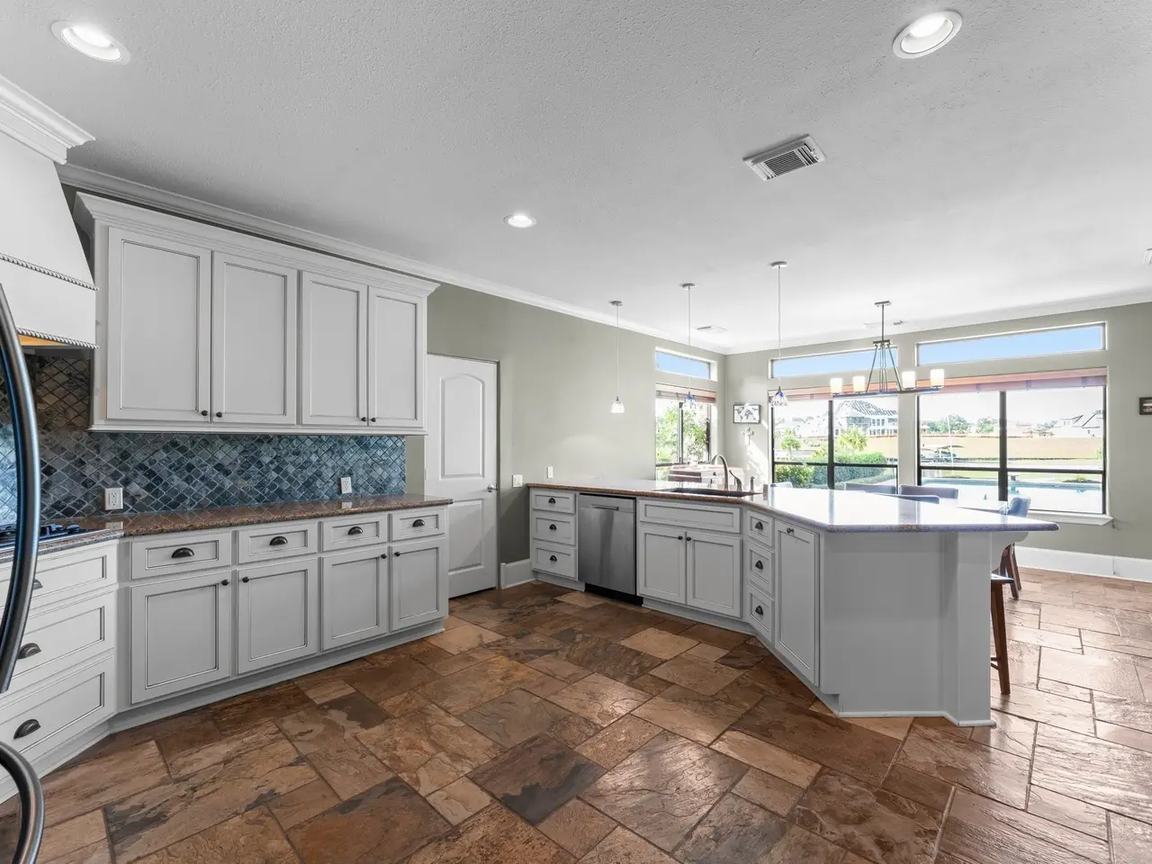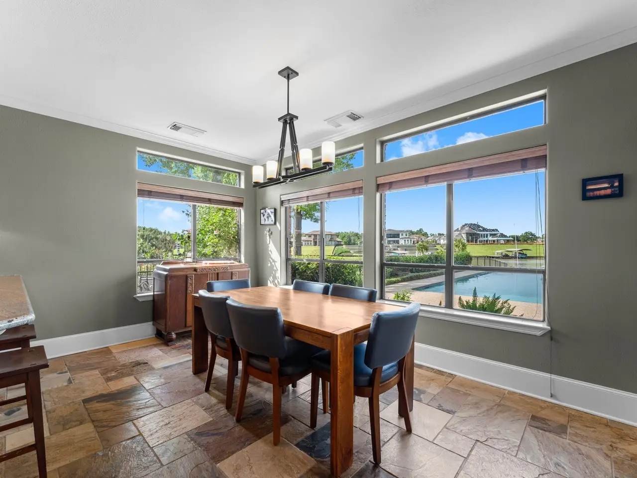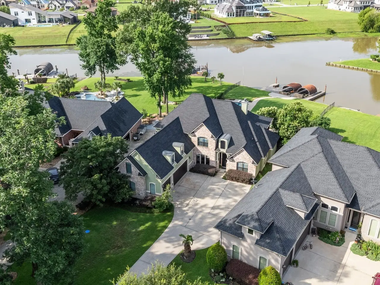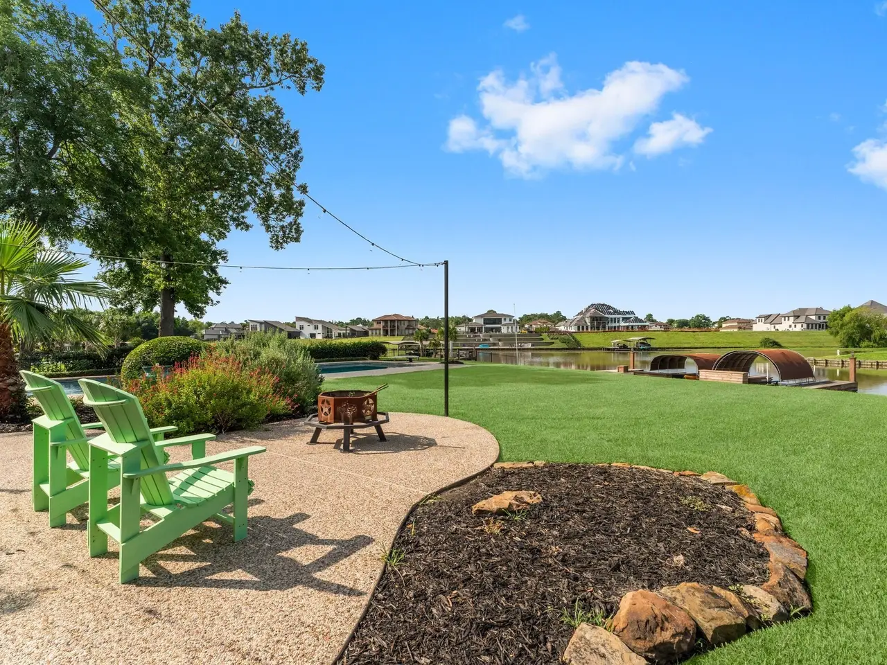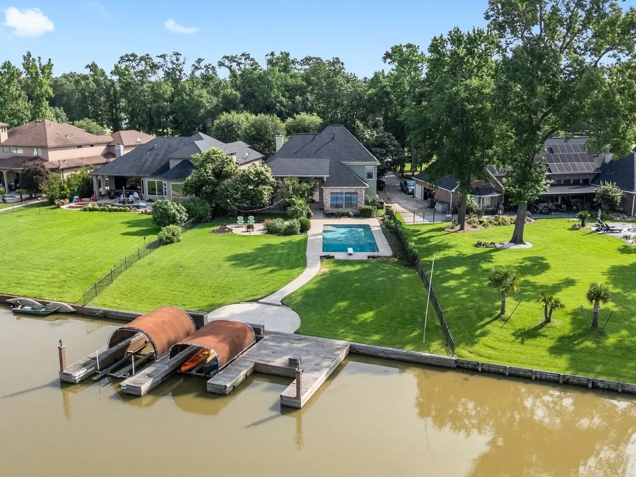Welcome to your new Waterfront home with panoramic views from the beautiful, level back yard! Imagine relaxing by the inground pool, the covered back patio & by the firepit while watching the boats go by. Home sits on one of the widest canals with a short boat ride to the lake. Once you walk in the front door, you'll be WOWED by the scenery that the soaring ceilings/grand windows provide. This well-kept home with an open floor plan has five bedrooms, four baths & a three-car garage. Ample storage throughout including two pantries & huge linen closet. The spacious gourmet kitchen also provides amazing canal views with plenty of cabinet space, granite counter tops, large island with breakfast bar & all stainless steel appliances. This space is perfect for entertaining! Upstairs there's an oversized game room ideal for a pool table or ping pong & TV viewing area. The large backyard is gently sloped, perfect for any/all lawn games! Lawn overlooks two covered boat slips & swim pier. Manned, gated neighborhood!