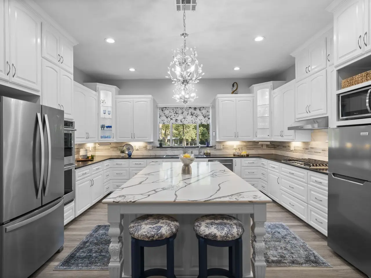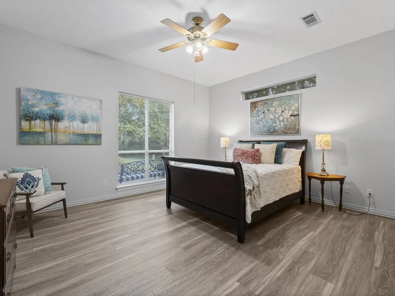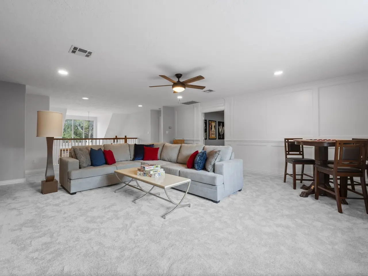 Gorgeous 3.19-acre estate in highly sought-after GATED Crown Oaks, just north of The Woodlands. This expansive property comprises a 5,496 sq ft main residence beautifully updated plus a 797 sq ft renovated garage apartment. Main house features 4 bedrooms and 4.5 baths, including TWO PRIMARY suites on the main level for convenient single-floor living. Completely renovated, chef-inspired kitchen with a large island, quartz and granite countertops, white cabinetry, and new appliances with adjacent hearth room and breakfast room. Generous family room with a wall of windows flooding the space with natural light, complemented by new LVP flooring throughout much of the downstairs. Upstairs includes a large game room and media room, plus two spacious bedrooms with private baths. Renovated upstairs garage apartment: two bedrooms, full kitchen, living room, and bathroom. Fully fenced back yard with a large covered back porch, perfect for entertaining and soaking in the serene 3.19-acre setting.