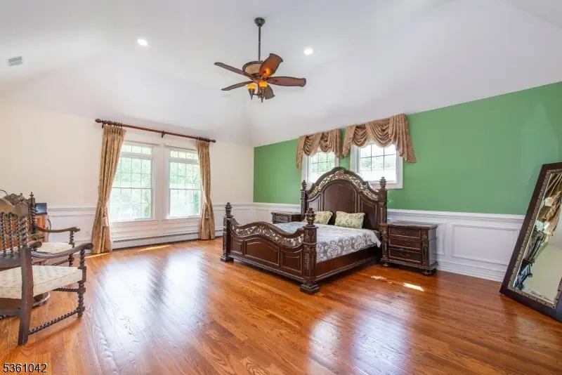 WOW factor! Discover this stunning 6-bedroom, 5.5-bath, 5.6 acre home, featuring a full brick/ stucco exterior, w/solar power, soundproof construction, circular driveway, and a 3-car garage. Built in 2010, this East-facing residence offers luxurious living with 9-foot ceilings on every floor and hardwood floors throughout, including inlaid wood accents. The two-story foyer, with chandelier adds a dramatic touch. The home includes two laundry rooms, spacious kitchen with granite countertops, a Viking 6-burner range, Sub-Zero fridge/freezer, heated tile floors, custom cabinetry, pot filler, large center island with eat-in area and formal dining room.. The family room features fireplace, custom moldings, inlaid wood floors, and coffered ceilings. A two-story living room is adorned with custom moldings, fireplace and an elegant chandelier. Additional den with double French doors and coffered ceiling and 1st fl primary suite with sitting area, walk-in closets and full en suite bathroom. Upstairs, the en suite bedroom includes an attached bath, while two additional bedrooms share a Jack-and-Jill bathroom. The bridge offers access to the 2nd fl primary suite offers high ceilings, hardwood floors, a wet bar, walk-in closet, and a luxurious custom bath with a Jacuzzi tub, double sinks, and a stand-up shower. access to a Trex deck overlooking fenced yard. The finished walkout basement has additional bath, a bedroom (currently a gym), a large rec room, and a home theater room. Four-zone AC/heat.