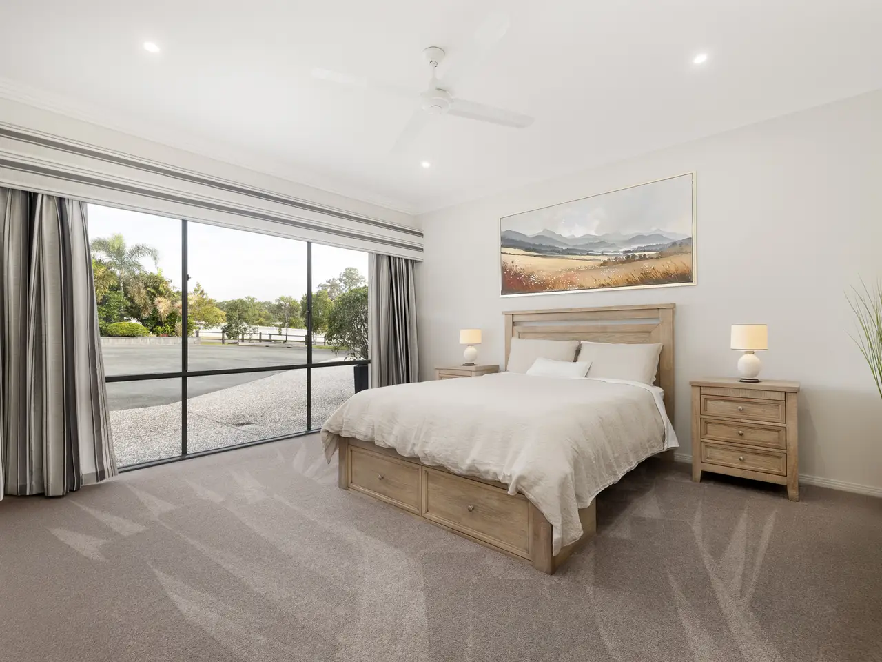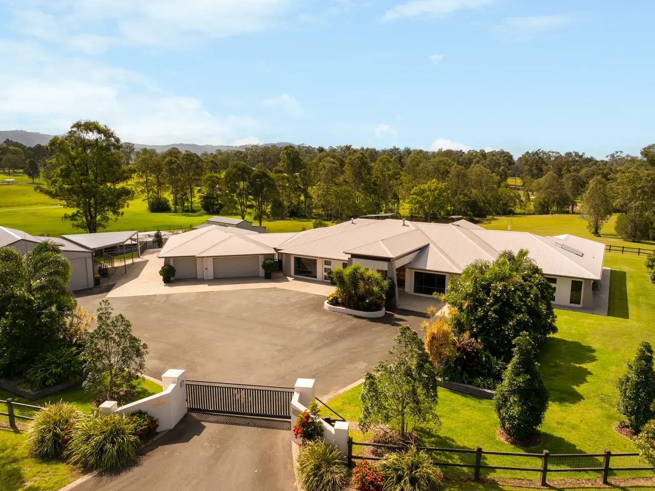 Discover the ultimate blend of country ambience and modern convenience in this treasured, private location! Presiding over prestigious acreage with exceptional sizing and sophisticated design, this idyllic lifestyle is enhanced by a prized position between the city of Brisbane and the beaches of the Sunshine Coast, allowing you a true escape without compromising on the convenience modern life demands. Crowning just under 10 acres of lush, green land, this executive home unfolds over a colossal footprint with meticulous presentation and a focus on easy entertaining. Beyond a grand entry with double-sided fireplace, considered design brings those magnificent acreage views into every corner of the expansive footprint, with beautiful light enhanced by high ceilings and wall to wall glazing. Exceptional in scale, the home offers a large plush media room with open-plan dining, living and games connecting seamlessly to a colossal entertainer's kitchen. Displaying an incredible amount of storage complemented by a butler's pantry, this sleek zone also offers quality appliances and expansive stone. Overlooking paradise, a huge alfresco zone is appointed with a premium outdoor kitchen and sits under a large timber-lined gabled roof. A huge fenced house yard provides safe play for children whilst the expansive fenced parcel also offers plenty of space to accommodate animals as well as a large dam with over-water entertainer's deck! Formal accommodation is comprised of five large bedrooms with four including walk-in storage. The palatial master enjoys a private retreat and huge ensuite with spa bath whilst two additional bathrooms are equally pristine; one serving as an ensuite to a second bedroom. Finishing the residence in style are a range of features including a huge home office, two laundries, guest powder room, ducted air-conditioning, secure gated entry and 15kw solar electricity with individual inverters. In addition the property includes 200,000L of water storage, biocycle system, extensive security camera network, large chicken coop, massive rear triple bay barn shed with solar panels, second over height triple-bay barn shed with attached carport and solar, triple remote garage and additional triple bay car showroom! An idyllic escape leaving you wanting for nothing, this location gives you the best of all worlds. Schools, shops, dining and large business districts are under ten minutes away whilst a location halfway between Brisbane and the Sunshine Coast ensures you have easy access to both the bustling city and majestic beaches! - 9.8 acres (40,000m2) - Incredible acreage parcel and executive residence - Expansive open-plan layout including huge games room, living and dining with double-sided fireplace - Massive cinema/media room - Colossal chef's kitchen with butler's pantry, premium appliances and stone - Outdoor entertaining overlooking acreage parcel and including outdoor kitchen - Large dam with over-water entertaining deck - Fenced house yard plus fully fenced property for large animals - Five oversized built-in bedrooms; four including walk-in wardrobes - Palatial master with private retreat and luxurious ensuite - Two additional large bathrooms plus guest powder room - Ducted air-conditioning/two laundries/chicken coop/multiple water tanks with 200,000L - 15kw solar electricity with individual inverters - Two massive triple-bay barn sheds with solar panels. - Carport with high vehicle access - Triple remote garage - Triple remote car showroom - Secure gated entry and extensive security camera network - Positioned halfway between Brisbane and the Sunshine Coast - Under ten minutes to extensive shopping, dining and schooling
