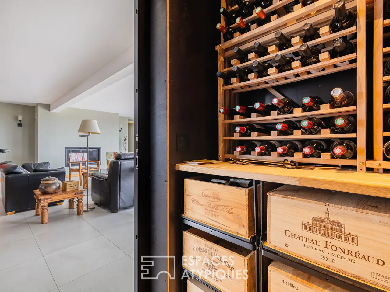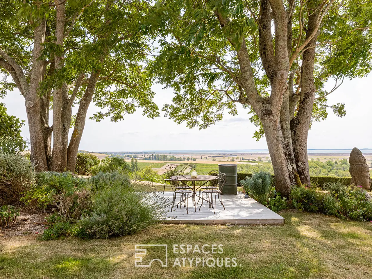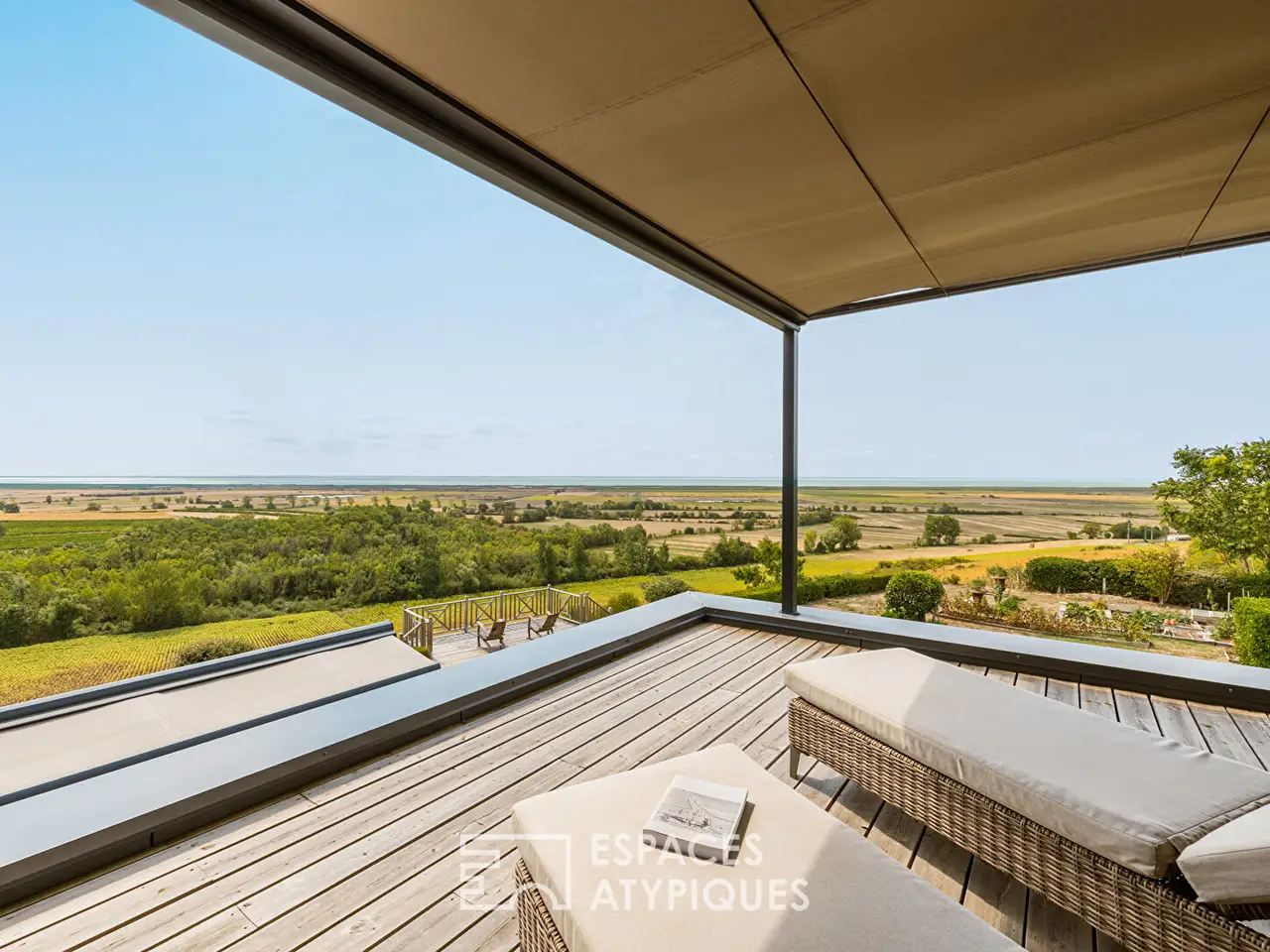 Nestled on the heights of Mortagne-sur-Gironde, an emblematic town on the Gironde estuary, an exceptional property is revealed. Born from the bold transformation of an old estuary house, this contemporary residence, built mainly with a timber frame, offers a unique living environment, where nature and design harmonize. This unique property, located on a plot of over 9,300 m2, including a wooded garden of approximately 1,900 m2 and a leisure plot of over 7,400 m2, enjoys an exceptional 180° panoramic view of the Gironde. The high-end design and quality construction add a subtle blend that conveys a particularly soothing atmosphere. The front door opens onto a bright and modular interior. The vast living room, the true heart of the house, is designed to adapt to all desires, combining a reception room, a TV corner, and an office. This space is designed to be open to the outside thanks to more than 10 meters of bay windows, but pleasure and comfort are not left out inside either: the real wine cellar, the large insert fireplace, the functional kitchen overlooking the estuary are all indications that life there is sweet and epicurean. The sleeping areas are functional and also modular. A bedroom on the ground floor has an individual shower room and allows for single-story living. Upstairs, a large master suite offers a vast independent space including a bathroom and a dressing room. Also upstairs, an additional bedroom equipped with a shower room and an office, which can become an additional bedroom if necessary, completes a well-designed floor equipped with a solarium overlooking the estuary. The magnetic view is never far away. All the rooms of the house benefit from a view of the estuary and its very special light, giving each of them a particular identity and softness. Modern and visionary, this house combines design and technology for comfort. Designed bioclimatically and equipped with high-performance materials, its photovoltaic panels produce more energy than it consumes. Outside, the landscaped grounds invite relaxation. The wooded garden offers several spaces that allow you to fully enjoy the iconic view and absolute peace and quiet. The property enjoys a dominant and privileged position that ensures total tranquility. Located just minutes from shops and services, this house offers a perfect balance between country living and practicality. This residence is a unique product, a successful marriage of environmentally friendly architecture and resolutely contemporary design. This atypical property, with its sublime view and absolute comfort, represents a rare opportunity to enjoy an exceptional property and an unparalleled view. ENERGY CLASS: A / CLIMATE CLASS: A Estimated average amount of annual energy expenditure for standard use, established from the average energy prices for the years 2021, 2022 and 2023: between EUR910 and EUR1290. REF. EALR2153 Additional information * 5 rooms * 4 bedrooms * 2 bathrooms * 1 bathroom * Floor : 1 * 1 floor in the building * Outdoor space : 9300 SQM * Property tax : 1 355 € Energy Performance Certificate Primary energy consumption a : 51 kWh/m2.year High performance housing