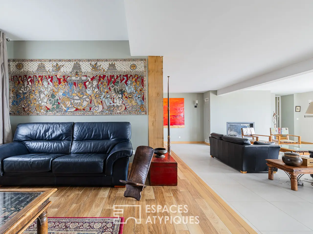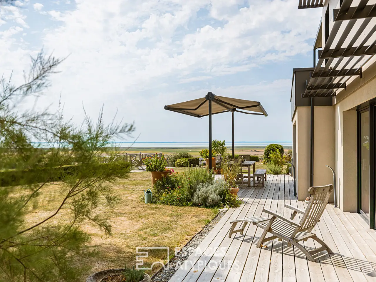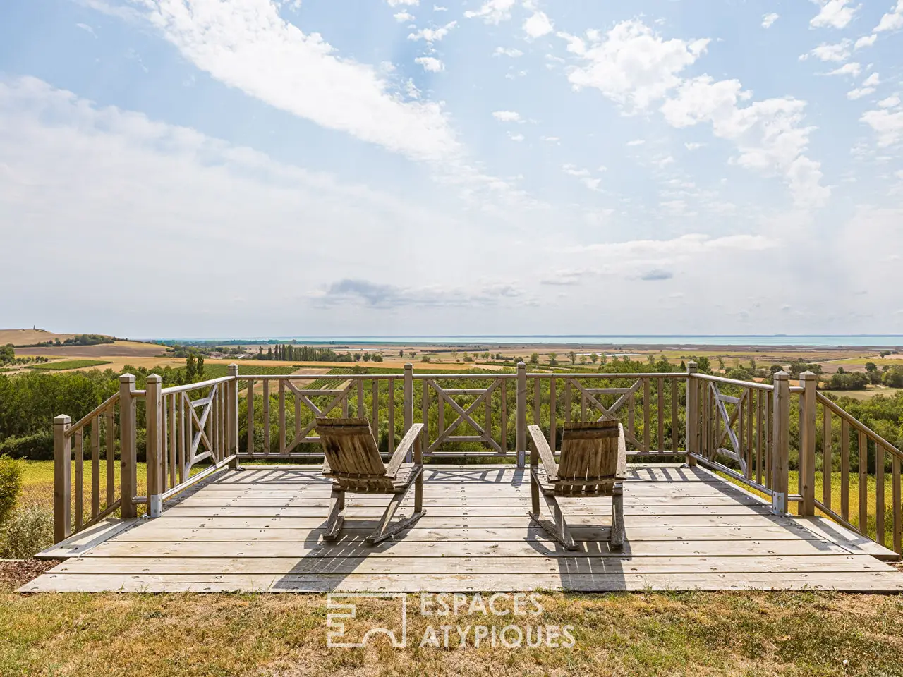 Nestled on the heights of Mortagne-sur-Gironde, an emblematic town on the Gironde estuary, an exceptional property is revealed. Born from the bold transformation of an old estuary house, this contemporary residence, built mainly with a timber frame, offers a unique living environment, where nature and design harmonize. This unique property, located on a plot of over 9,300 m2, including a wooded garden of approximately 1,900 m2 and a leisure plot of over 7,400 m2, enjoys an exceptional 180° panoramic view of the Gironde. The high-end design and quality construction add a subtle blend that conveys a particularly soothing atmosphere. The front door opens onto a bright and modular interior. The vast living room, the true heart of the house, is designed to adapt to all desires, combining a reception room, a TV corner, and an office. This space is designed to be open to the outside thanks to more than 10 meters of bay windows, but pleasure and comfort are not left out inside either: the real wine cellar, the large insert fireplace, the functional kitchen overlooking the estuary are all indications that life there is sweet and epicurean. The sleeping areas are functional and also modular. A bedroom on the ground floor has an individual shower room and allows for single-story living. Upstairs, a large master suite offers a vast independent space including a bathroom and a dressing room. Also upstairs, an additional bedroom equipped with a shower room and an office, which can become an additional bedroom if necessary, completes a well-designed floor equipped with a solarium overlooking the estuary. The magnetic view is never far away. All the rooms of the house benefit from a view of the estuary and its very special light, giving each of them a particular identity and softness. Modern and visionary, this house combines design and technology for comfort. Designed bioclimatically and equipped with high-performance materials, its photovoltaic panels produce more energy than it consumes. Outside, the landscaped grounds invite relaxation. The wooded garden offers several spaces that allow you to fully enjoy the iconic view and absolute peace and quiet. The property enjoys a dominant and privileged position that ensures total tranquility. Located just minutes from shops and services, this house offers a perfect balance between country living and practicality. This residence is a unique product, a successful marriage of environmentally friendly architecture and resolutely contemporary design. This atypical property, with its sublime view and absolute comfort, represents a rare opportunity to enjoy an exceptional property and an unparalleled view. ENERGY CLASS: A / CLIMATE CLASS: A Estimated average amount of annual energy expenditure for standard use, established from the average energy prices for the years 2021, 2022 and 2023: between EUR910 and EUR1290. REF. EALR2153 Additional information * 5 rooms * 4 bedrooms * 2 bathrooms * 1 bathroom * Floor : 1 * 1 floor in the building * Outdoor space : 9300 SQM * Property tax : 1 355 € Energy Performance Certificate Primary energy consumption a : 51 kWh/m2.year High performance housing