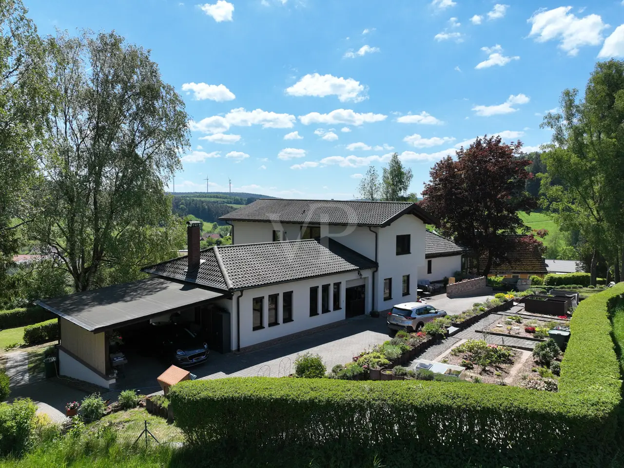 This exceptional property offers you the rare opportunity to acquire a two-family house with extensive features on an impressive plot of approx. 3000 sqm. The house is of a high quality and has been continuously maintained and renovated to meet the demands of comfortable living. The property is in a well-kept, partially modernized condition. As part of extensive modernization measures, the spacious terrace was completely renovated in 2024 - with investments of around €100,000. In addition, the façade renovation was completed in 2025 to maintain the high-quality and attractive appearance of the exterior. The living space is divided into two separate residential units, each with its own entrance - perfect for family concepts or renting out a unit. Three bathrooms, a well thought-out room concept and bright window fronts ensure a pleasant living atmosphere. Electric shutters offer additional living quality and security. In the basement there is a sauna and a party room with a bar, both of which invite you to spend your leisure time in an appealing way. The outdoor area is harmoniously complemented by two garden sheds and offers a variety of uses. A lovingly designed raised bed in the front garden creates ideal conditions for hobby gardeners. Irrigation is conveniently provided by an existing cistern, which is operated by a pump. An idyllic outdoor seating area in the garden behind the house invites you to linger and enjoy quiet hours in the greenery. The practical carport, which offers ample parking space, also deserves a special mention. Furthermore, a modern workshop (approx. 11.3m x 7.5m) belongs to the house, which additionally underlines the functionality of this property. This property combines spaciousness, quality and a high degree of privacy - a prestigious residence for people with high standards.