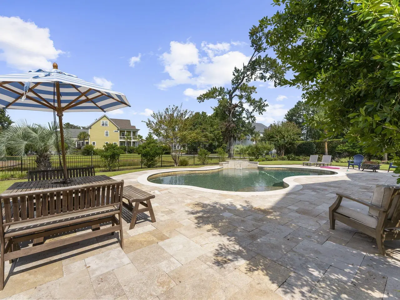 Enjoy resort-style living in The Harbour section of Dunes West, Mount Pleasant's only neighborhood with a gated entrance staffed by a security guard, offering an extra sense of comfort and privacy in a serene, island club-caliber setting--where the focus is on relaxation, recreation, and community. 2991 River Vista Way is an elegant seven bedroom five bathroom home offering over 4,200 square feet of refined living on an expansive pond-view corner lot. The first floor features a home office/sitting room, spacious kitchen, breakfast room, separate dining room, large living room, and guest bedroom and bath. On the second floor are five additional bedrooms and three bathrooms, including a spacious primary bedroom with sitting area and spa-like primary bath. And on the third floor are the huge seventh bedroom and fifth bathroom, with abundant walk-in attic storage. The home's spectacular outdoor space features a screened porch overlooking a sparkling saltwater pool with a waterfall feature and travertine decking. A large two-car garage rounds out the offering. Beyond the home itself, the Dunes West neighborhood offers an unmatched lifestyle with secured entry, walkable access to exceptional amenities including a golf course, swimming pool, tennis courts, walking and jogging trails and a clubhouse with fitness center--and proximity to award-winning public schools. Combining spacious design, convenience, and a setting of natural beauty, this home embodies the very best of Mount Pleasant living.