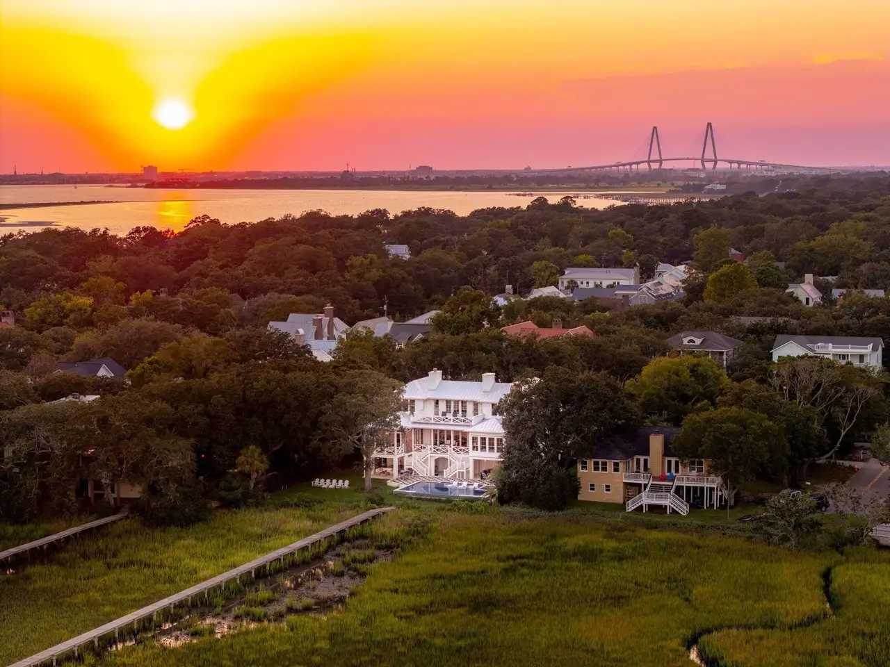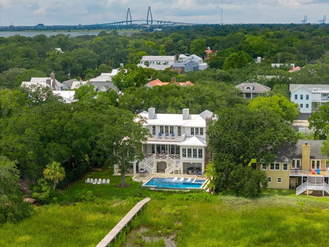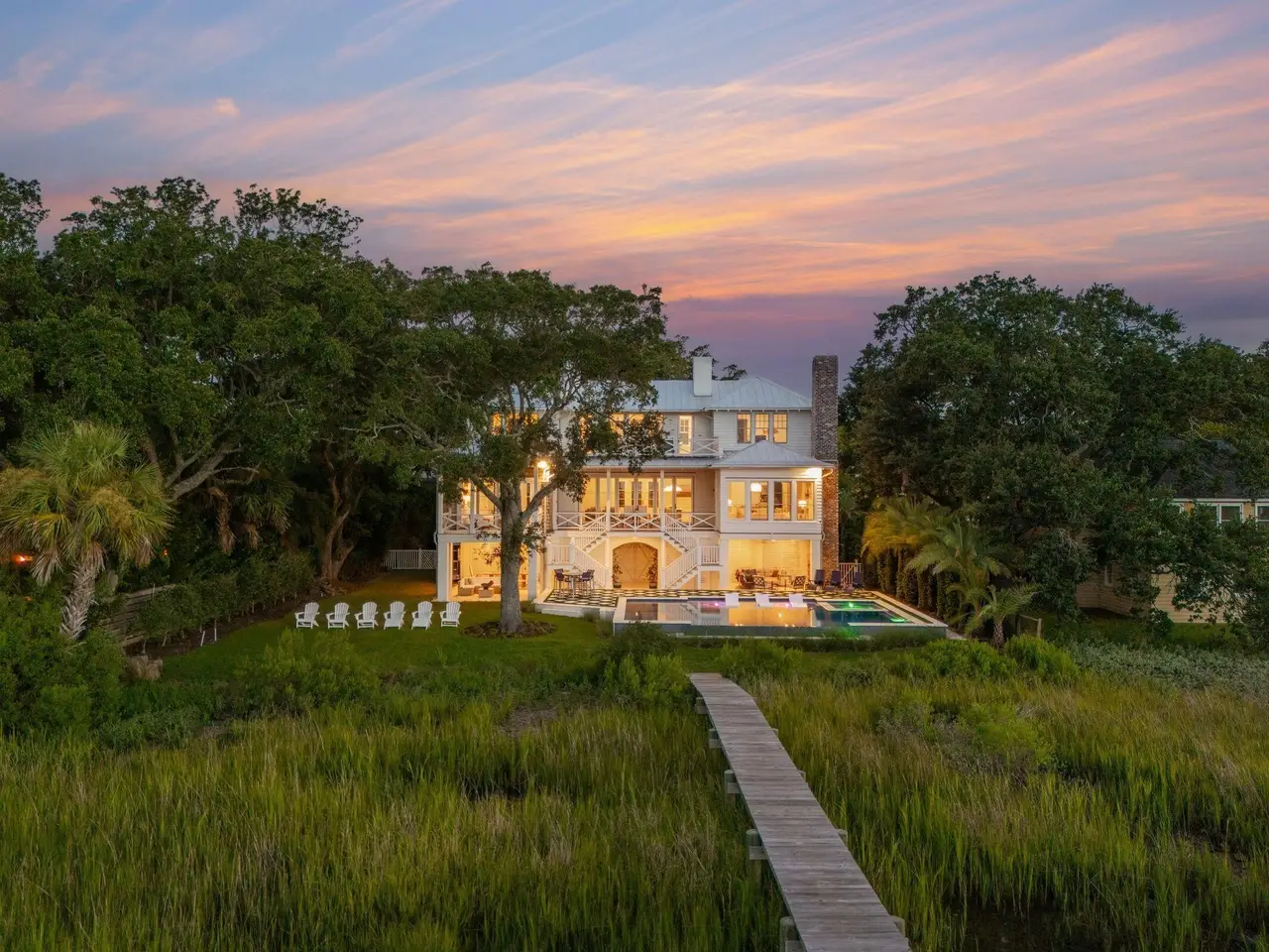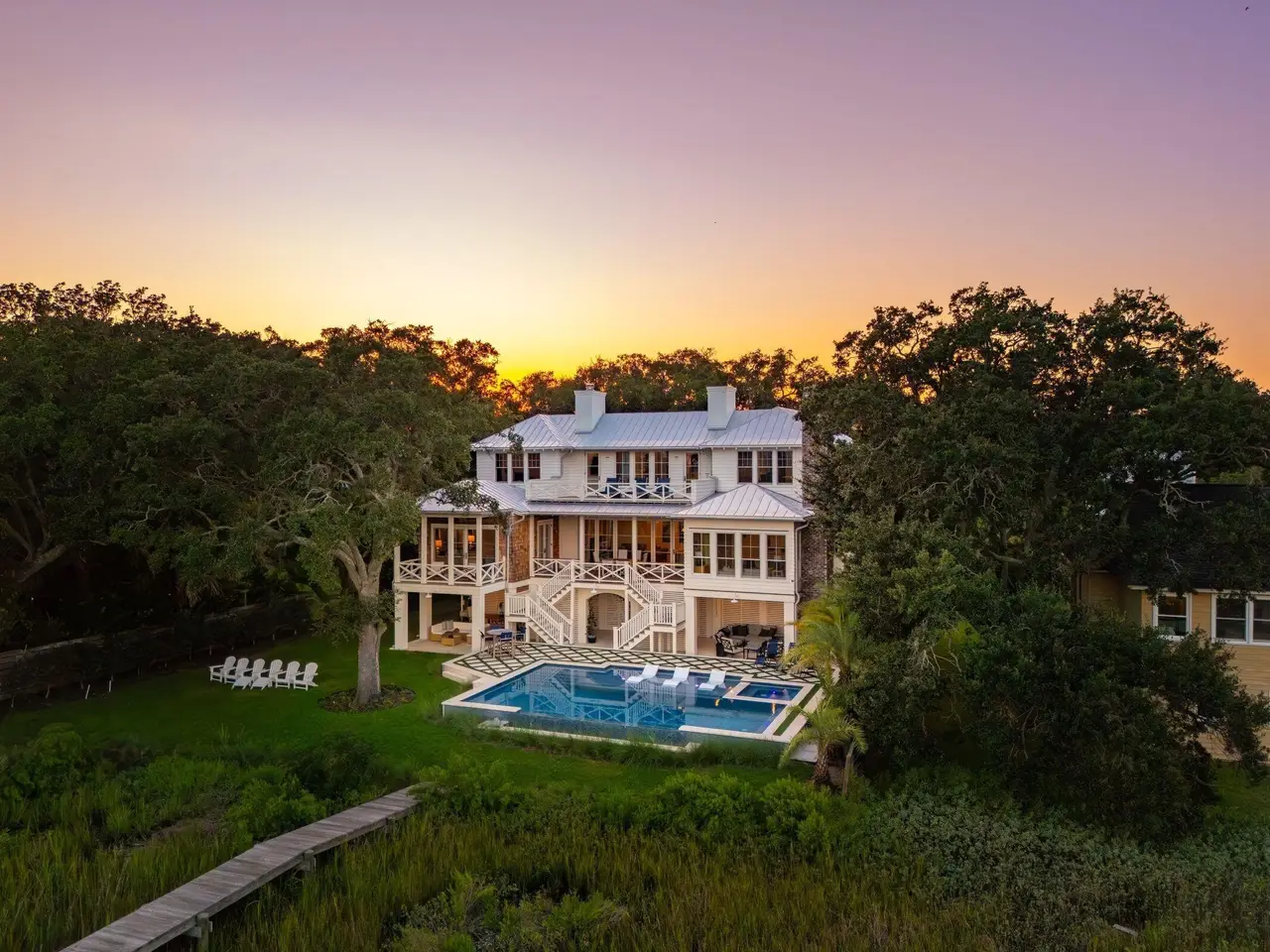 Welcome to Seven Oaks -- a newly completed (2024) generational estate tucked away on one of the most private lots in the Historic Old Village. Designed by Eric Daffron Architect, this waterfront retreat was crafted to capture sweeping views of Sullivan's Island, the Lighthouse, and the Intracoastal Waterway from nearly every room. A palm tree-lined drive sets the tone as you arrive at this sanctuary, where expansive marsh sunrises and timeless Lowcountry scenery surround you. Perfect for boaters, kayakers, and fishermen, the property offers rare direct water access from its private dock. At home, enjoy a resort-style infinity pool and multiple porches and terraces across three levels, all designed for outdoor living.Inside, the residence spans nearly 5,000 sq. ft. with 5 bedrooms, 5.5 baths, and an additional 2,300 sq. ft. of covered porches and decks. The main level centers on a light-filled open plan: living, dining, kitchen with scullery, and a keeping room. The vaulted primary suite offers its own private porch and spa-like bath. Also on the main floor are a study, mudroom/laundry, powder room, and a detached guest suite with ensuite bath. Upstairs, find a dreamy second living room with an expansive entertaining porch, three bedrooms, two baths, and a secondary laundry. An elevator connects every level, including the three-plus car garage. Throughout, the craftsmanship is unmatched herringbone white oak floors, bespoke millwork, and custom stonework elevate every detail. Set on an unusually large, high lot, Seven Oaks combines privacy, luxury, and rare deep-water access into one extraordinary Old Village offering.