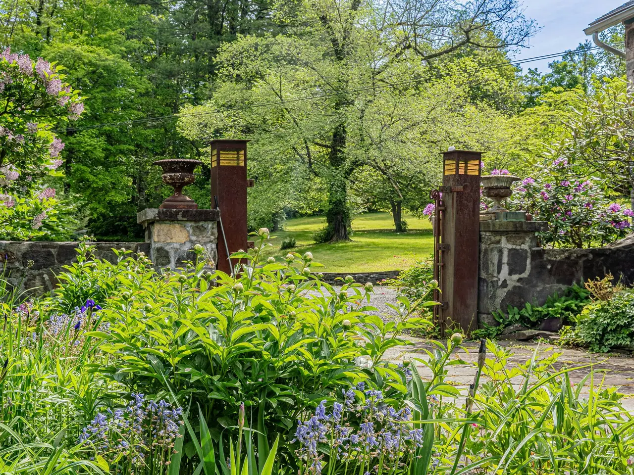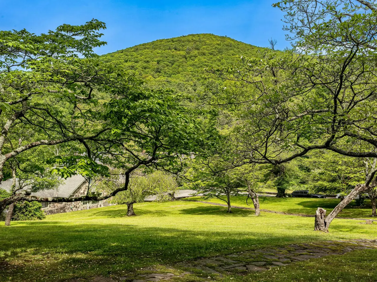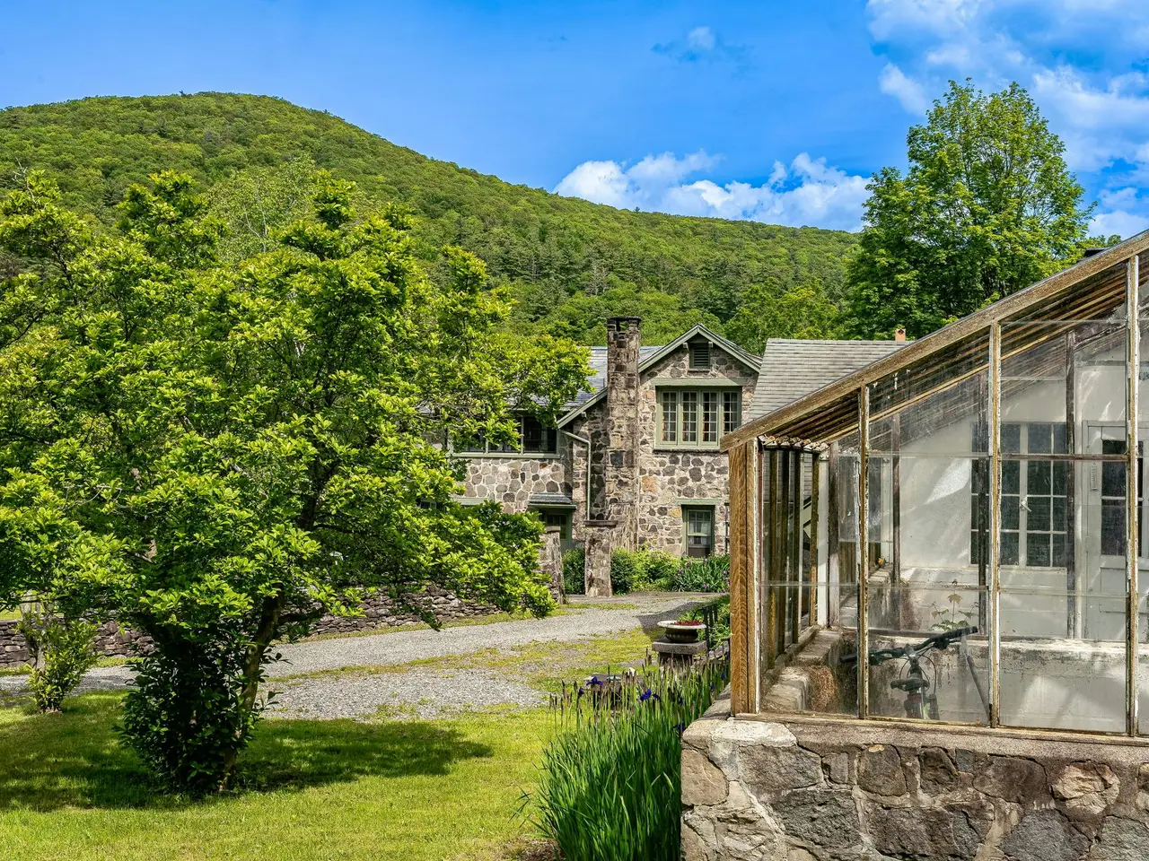 Welcome to Happy Brooks, the much-loved compound for many years of Woodstock Festival co-founder and legendary music industry icon Michael Lang, this mythic Mt. Tremper property boasts true style, along with a creative pedigree that dates back to the 1920s. Originally built for the artist G. Adolph Anderson, the 17 acre estate features three architecturally significant & historic structures designed by prominent architect A.M. Bedell; the original main house was built in 1928, with the two additional & alluring buildings following soon after. The grandly scaled double-height great room of the primary residence has played host to renowned artists of every stripe through the decades, with the inspired design detail easily matched by the world-class art and music created within its impressive walls. In this wing you will also find an office, two powder rooms, upper-level bedroom, and a library. Past a massive bluestone fireplace on the ground floor a central foyer leads into a formal dining room with long-range mountain views, a cooks" kitchen with breakfast area, and an open-plan media room (and another massive fireplace with wood stove & built-in bread oven). A light-filled hallway brings you to three oversized bedroom suites, including the romantic, beautifully scaled primary. Behind magnificent stained glass doors you will find a reading room with window seats that overlook the verdant, rolling lawn below. Connecting this wing of the home is a spectacular conservatory with a 24-foot glass ceiling - the perfect place to cultivate plants (or plans), paint a masterpiece, or simply dream. Across the central courtyard, and framed by a wide, mature birch tree is a two bedroom storybook guesthouse that holds true design treasure. An oversized living room leads into a den with bluestone fireplace and a striking collection of built-in Fu dogs and wood-carvings on gilded plaques collected from travels to China that depict an epic story (like the one you can create here). There is also a charming dining area and full kitchen. The third stone and wood structure is a two bedroom cottage that is connected to a three-bay garage, and has a greenhouse ready to be restored or turned into a Romanesque walled garden. Additional structures include a tool shed, three-stall barn, as well as an enchanting picnic pavilion sited up on a knoll with views of Slide Mountain, the tallest peak of the Catskills. From the moment you enter the gates there is a feeling of being in your own private village, and the park-like land is a natural wonder, with winding paths, stone walls, orchards, fields of wildflowers and a large centerpiece pond with its own art island showcasing a sculpture by Michael Lang. On sultry summer days you can enjoy a swim in the 53 x 40 oval lined cement pool while gazing at the peaks and valley's in the distance. Mt. Tremper is located just minutes from main street Woodstock, and Happy Brooks itself is approximately two hours from NYC. This rare Hudson Valley treasure, so full of possibilities, is ready for its next refresh and adventurous steward. So come on and get Happy.