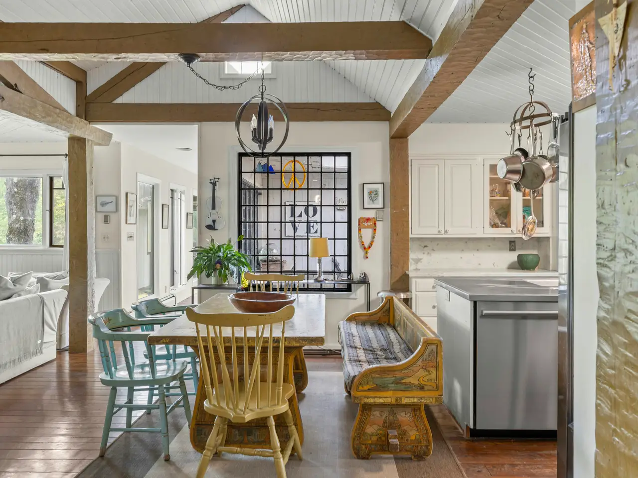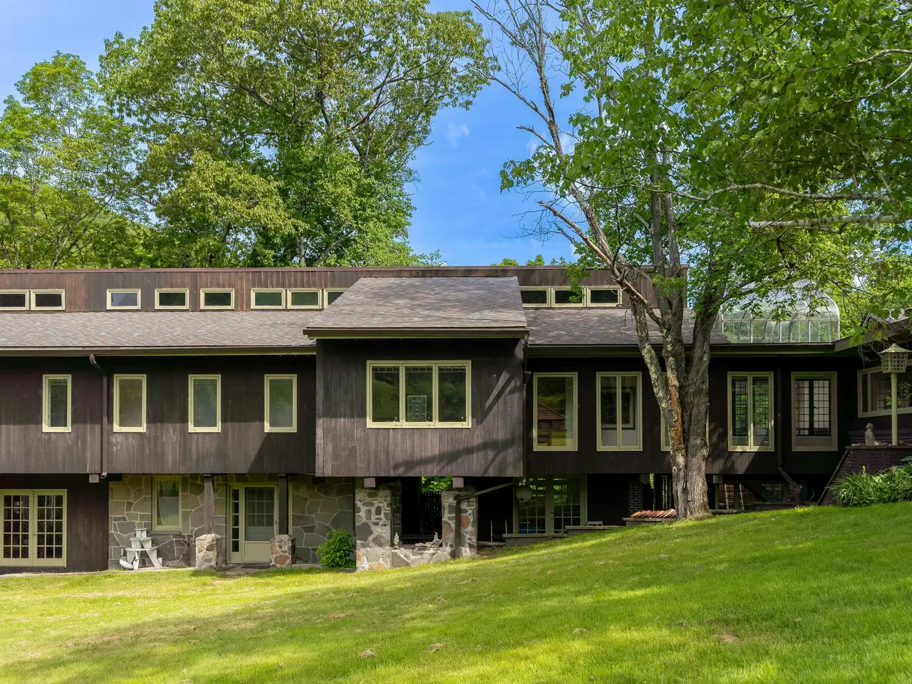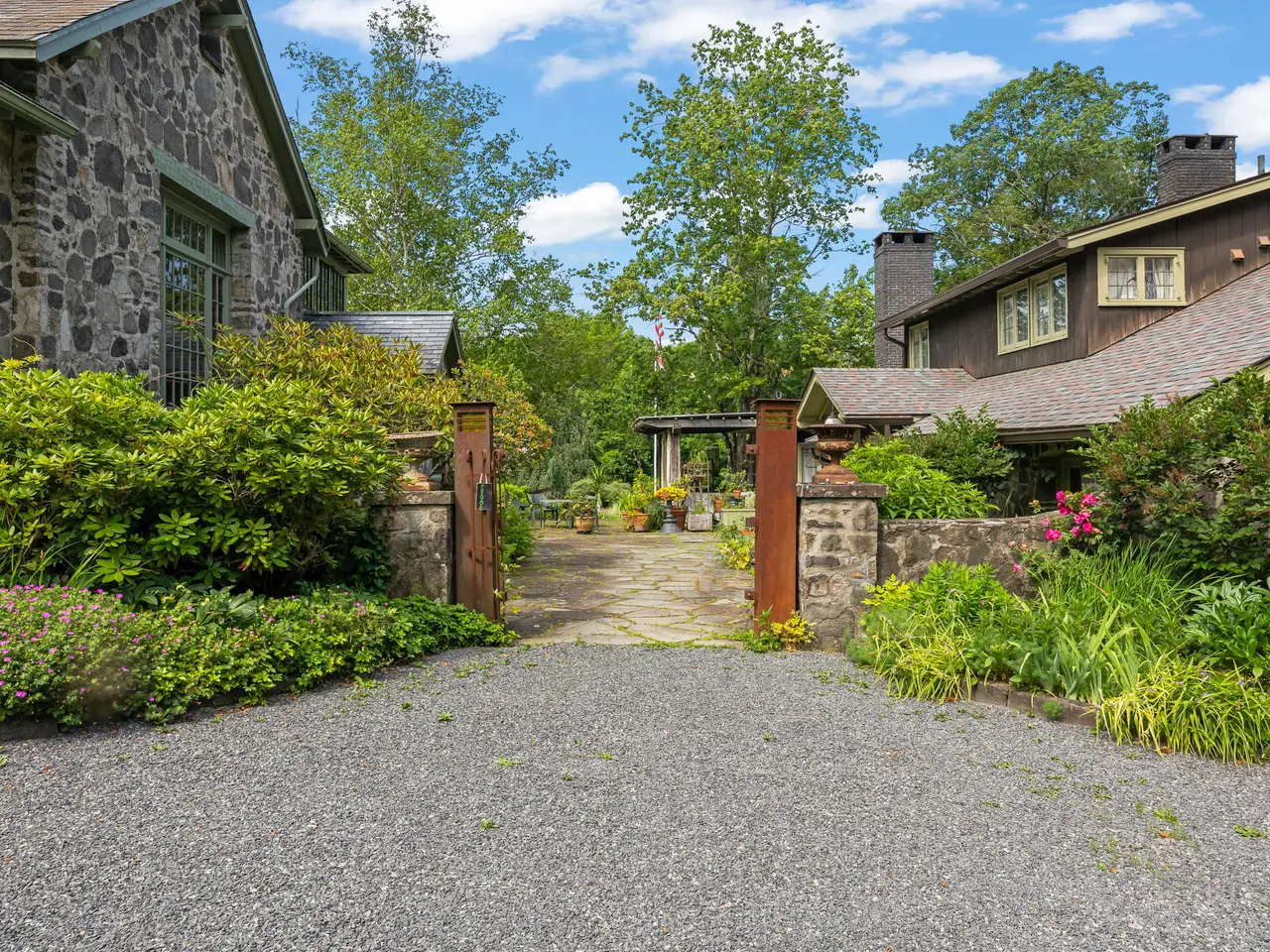 Welcome to Happy Brooks, the much-loved compound for many years of Woodstock Festival co-founder and legendary music industry icon Michael Lang, this mythic Mt. Tremper property boasts true style, along with a creative pedigree that dates back to the 1920s. Originally built for the artist G. Adolph Anderson, the 17 acre estate features three architecturally significant & historic structures designed by prominent architect A.M. Bedell; the original main house was built in 1928, with the two additional & alluring buildings following soon after. The grandly scaled double-height great room of the primary residence has played host to renowned artists of every stripe through the decades, with the inspired design detail easily matched by the world-class art and music created within its impressive walls. In this wing you will also find an office, two powder rooms, upper-level bedroom, and a library. Past a massive bluestone fireplace on the ground floor a central foyer leads into a formal dining room with long-range mountain views, a cooks" kitchen with breakfast area, and an open-plan media room (and another massive fireplace with wood stove & built-in bread oven). A light-filled hallway brings you to three oversized bedroom suites, including the romantic, beautifully scaled primary. Behind magnificent stained glass doors you will find a reading room with window seats that overlook the verdant, rolling lawn below. Connecting this wing of the home is a spectacular conservatory with a 24-foot glass ceiling - the perfect place to cultivate plants (or plans), paint a masterpiece, or simply dream. Across the central courtyard, and framed by a wide, mature birch tree is a two bedroom storybook guesthouse that holds true design treasure. An oversized living room leads into a den with bluestone fireplace and a striking collection of built-in Fu dogs and wood-carvings on gilded plaques collected from travels to China that depict an epic story (like the one you can create here). There is also a charming dining area and full kitchen. The third stone and wood structure is a two bedroom cottage that is connected to a three-bay garage, and has a greenhouse ready to be restored or turned into a Romanesque walled garden. Additional structures include a tool shed, three-stall barn, as well as an enchanting picnic pavilion sited up on a knoll with views of Slide Mountain, the tallest peak of the Catskills. From the moment you enter the gates there is a feeling of being in your own private village, and the park-like land is a natural wonder, with winding paths, stone walls, orchards, fields of wildflowers and a large centerpiece pond with its own art island showcasing a sculpture by Michael Lang. On sultry summer days you can enjoy a swim in the 53 x 40 oval lined cement pool while gazing at the peaks and valley's in the distance. Mt. Tremper is located just minutes from main street Woodstock, and Happy Brooks itself is approximately two hours from NYC. This rare Hudson Valley treasure, so full of possibilities, is ready for its next refresh and adventurous steward. So come on and get Happy.