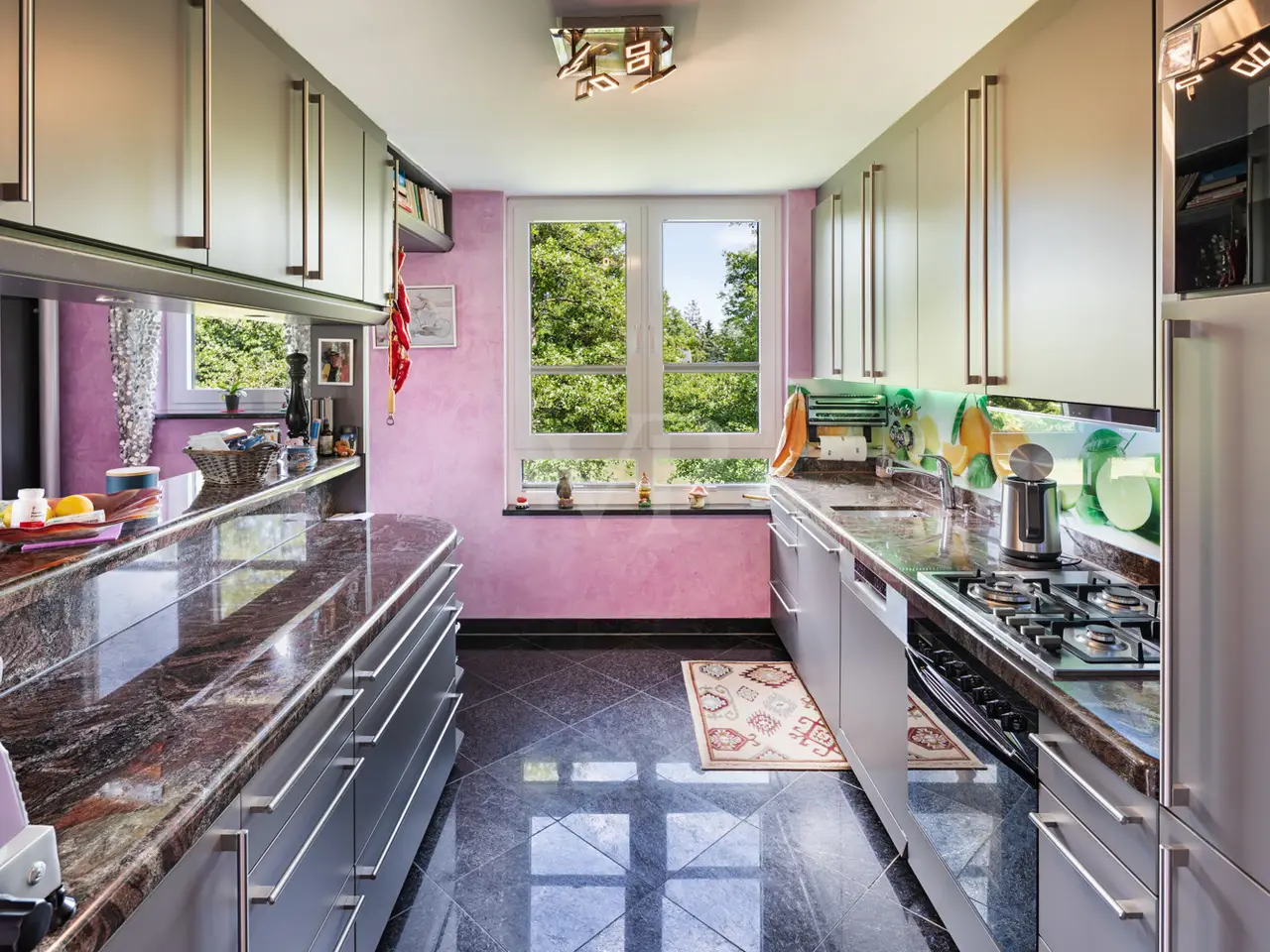 This exceptional maisonette with approx. 222 m² of living space is situated in a quiet and sought-after location in Obermenzing, directly on the Nymphenburg Canal. Built in 1986, the property impresses with its generous room layout, high-quality fittings and versatile usage options. The open-plan living and dining area creates a generous sense of space with flowing transitions. The stylishly integrated fitted kitchen blends harmoniously into the overall picture. From here, you can access the sunny south-west-facing terrace, which offers a wonderful view of the greenery. Uniformly laid black granite floors lend the entire apartment a timeless elegance and underline the high-quality standard of the property. On the first floor, in addition to the living area, there are several bedrooms and offices as well as two bathrooms. The upper living level offers further, generously proportioned rooms that can be used flexibly as bedrooms, work or hobby areas. An additional air space enhances the open and airy architecture, while a further bathroom completes the comfort of this level. A special feature of this property is its location directly on the Nymphenburg Canal. The immediate proximity to the water and the prestigious surroundings lend the property an exceptional quality of living. According to the declaration of division, it is possible to separate the property into two independent units. This makes the apartment suitable as a spacious family home, for multi-generational living or for a combination of living and working under one roof. The apartment is ready for immediate occupancy. * We will be happy to answer any further questions you may have at any time!