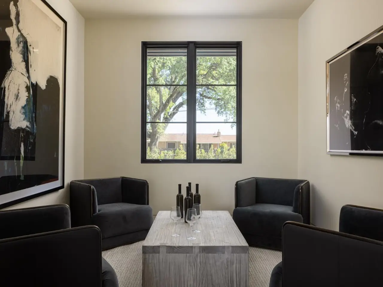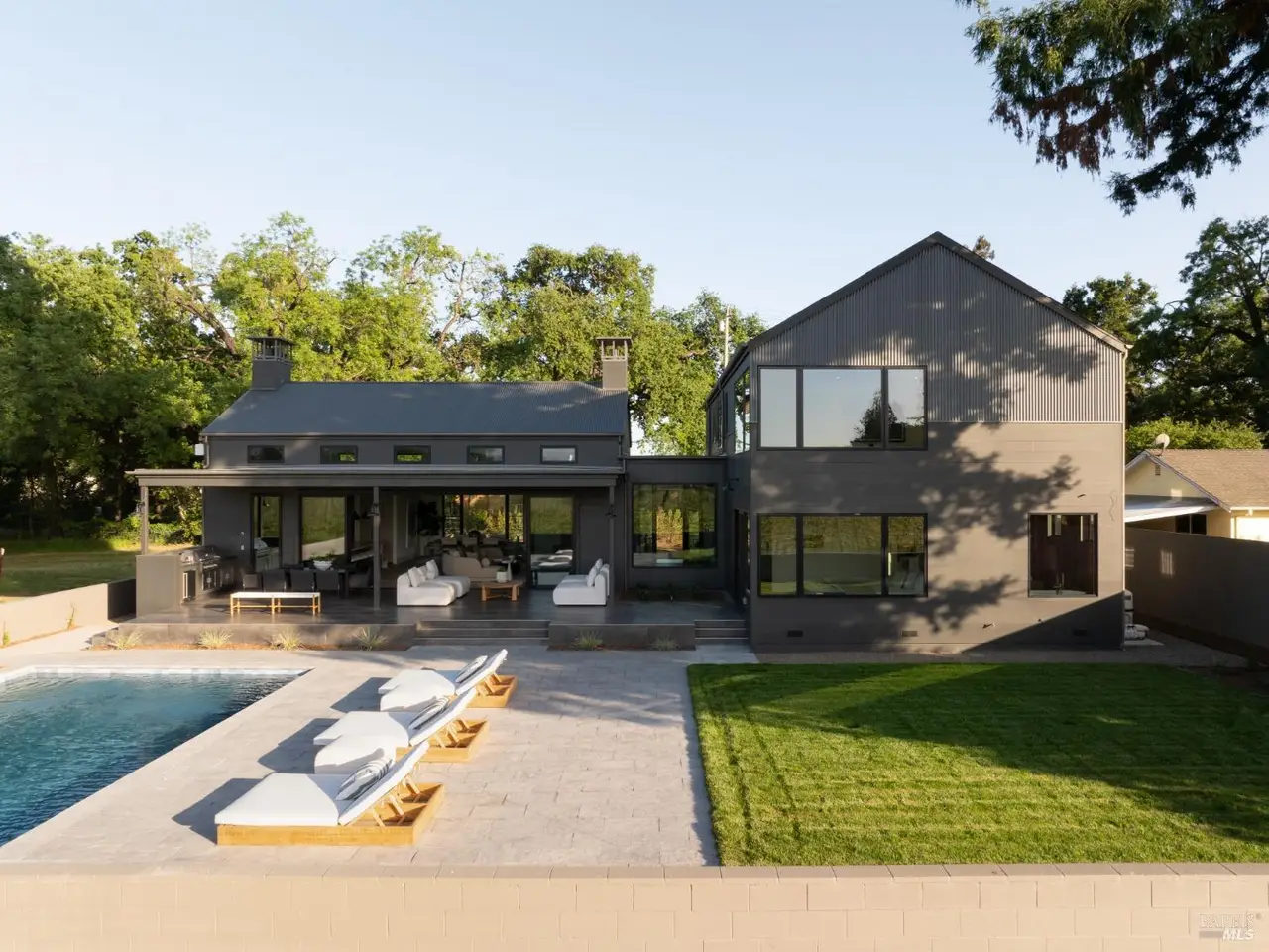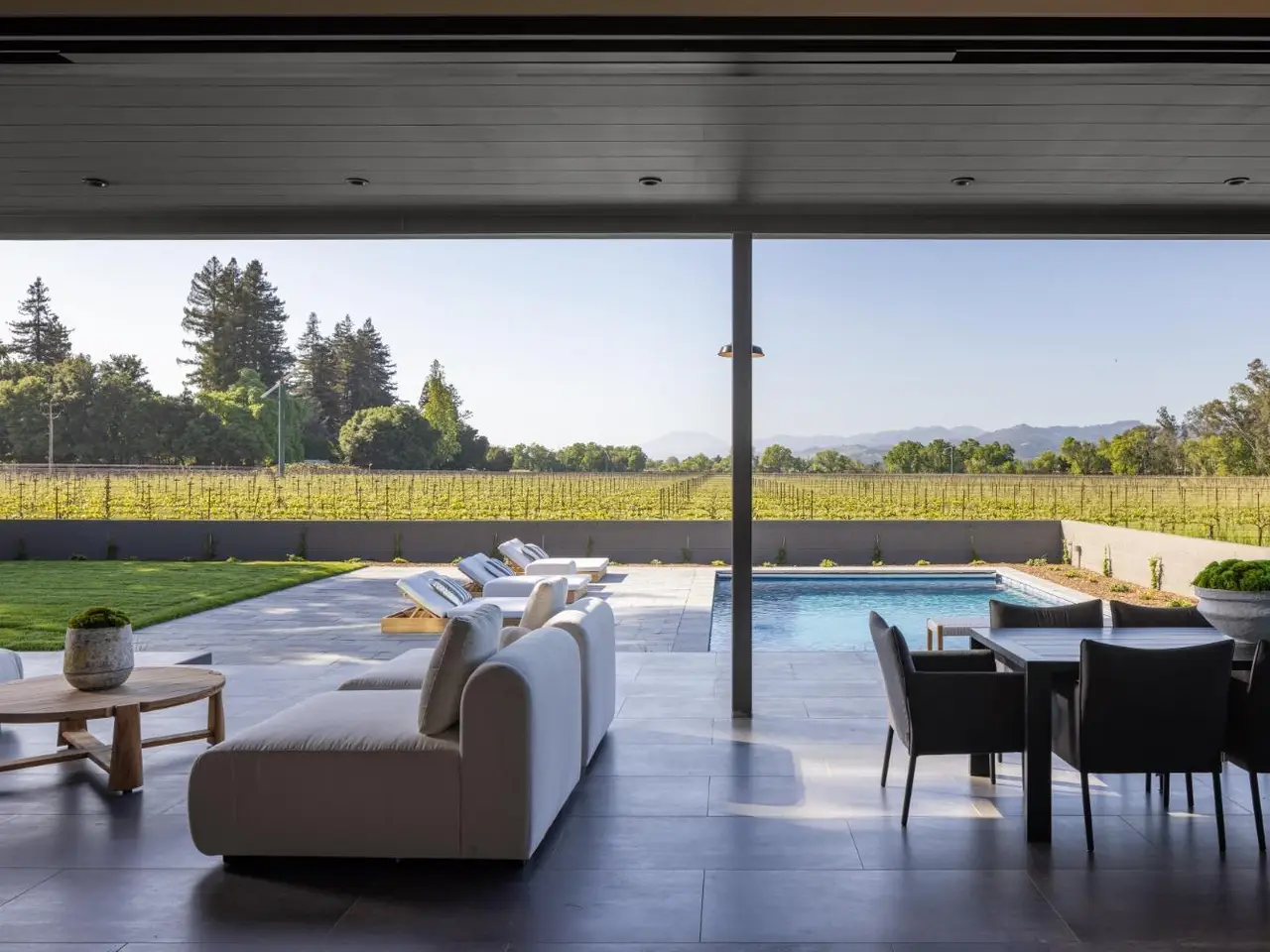 In one of Napa Valley's most iconic winegrowing regions, this distinctive Rutherford property captures panoramic vineyard views and a profound sense of seclusion. Encompassing approximately 0.33 acres and surrounded by premium Cabernet Sauvignon vines, it occupies a rare position within the heart of the renowned Rutherford AVA. The residence is a bold yet refined interpretation of agrarian design, blending rustic materials with contemporary formvertical and horizontal siding, corrugated metal accents, and crisp, clean lines define its striking silhouette. The residence features three thoughtfully designed bedrooms, including a tranquil primary suite on the main level that offers comfort and privacy. At the heart of the home, a dramatic great room with vaulted ceilings, transom windows, and an expansive wall of sliding glass doors opens to a covered loggia, creating a seamless connection between indoors and out. Just steps from the main kitchen, a fully equipped outdoor kitchen enhances the ease of alfresco dining and entertaining. The terrace unfolds to a sun-drenched pool bordered by low garden walls, manicured lawn, and generous lounge spaceall set against unobstructed views of surrounding vineyards. This property embodies the elegance and ease of Napa Valley living.