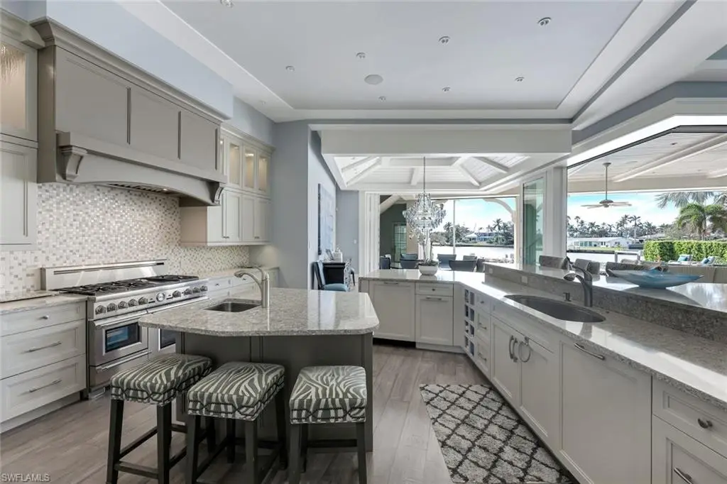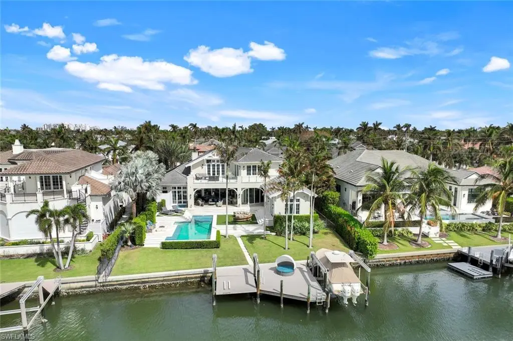 Live in casual elegance in this beautiful custom bay front home in The Moorings, timelessly designed by Harrell & Company Architects on just under a private + acre premier southern exposure lot. This private oasis has been professionally decorated with a coastal flair. Watch the dolphins and eagles on Hurricane Harbor from the great room's floor to ceiling windows with zero corner sliding doors for seamless indoor-outdoor living and entertaining. Upgrades galorea soaring back lit quartz accent wall, cathedral ceilings with beautiful mill work; each ceiling a masterpiece, an indoor/outdoor bar, perfect for entertaining. There is a private elevator, Lutron lighting, two laundry rooms, two powder rooms and three car garages. The kitchen will delight your inner chef with professional grade appliances, gas six burner range, two dishwashers, walk in pantry and Miele built-in coffee machine. The first-floor master suite features a large walk-in closet with a dressing area and laundry room, private outdoor shower and a lovely view of the bay and the spa with waterfall. The study doubles as a guest bedroom, two queen-size Murphy beds, the second-floor hosts 2 additional bedrooms and baths, wet bar, family room loft and bayfront deck with a firepit. Overlooking the pool and bay you will find the cabana with bedroom and bath. The travertine lanai features a covered dining and living areas with wet bar, TV, grilling area, retractable screens, and shutters. The sparkling pool and spa are located on the terraced lawn featuring a firepit, several seating areas leading to the bay front deck with boat and jet ski lifts. Built in 2016 using the highest quality materials by D. Garrett Construction at a high elevation, this home has never been damaged by hurricane or storm surge. For your peace of mind there is a security system with cameras, high impact glass windows & doors, all at a high and dry elevation. This house is a true showplace. The Moorings is conveniently located west of 41 in the City of Naples and features a private residence Beach Club. Two miles from 5th Avenue and all that Naples has to offer. Location, Luxury and Beauty!