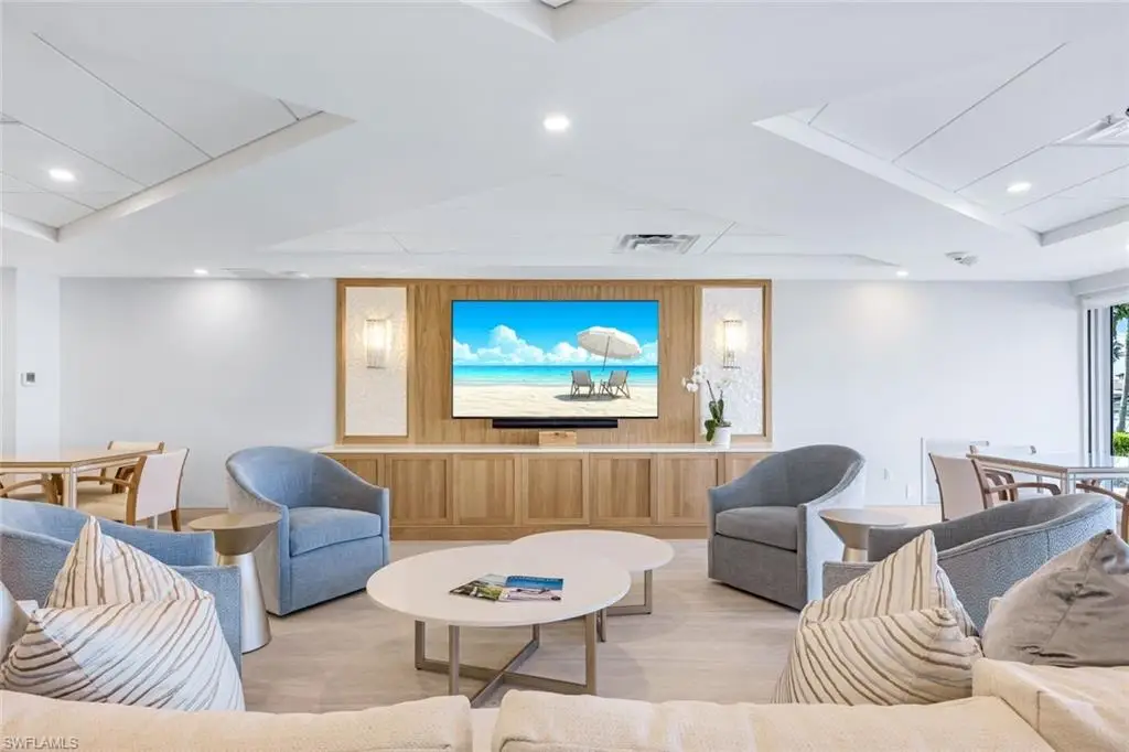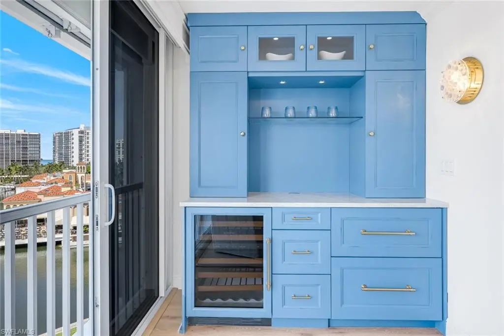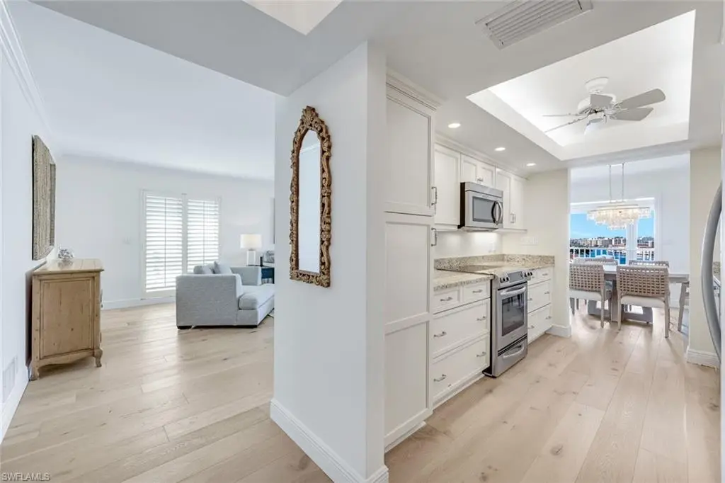 Experience breathtaking, wide views of Venetian Bay, with glimpses of the Gulf, from this beautifully renovated sixth-floor end unit, perfectly situated next to The Village Shops on Venetian Bay. Offering 3 bedrooms, 2 bathrooms, and 1,948 sqft of living space, the residence features a generous open living area with large walls of glass showcasing the view. The interior has been thoughtfully updated with wide-plank white oak flooring, fresh paint, stylish new light fixtures, and a custom-built-in bar with a Sub-Zero wine cooler. Both bathrooms are finished with new cabinetry, elegant tilework, updated plumbing, and the primary includes a Toto toilet. Additional upgrades include a new water heater, impact glass windows with hurricane shutters, and electric shades. Enjoy captivating southwest bay views, colorful sunsets over the Gulf, and an unbeatable location just a short stroll to Park Shore Beach Park. Residents have access to a bayside pool with chickee hut and grills, creating the perfect setting for Naples waterfront living at its finest.