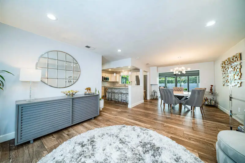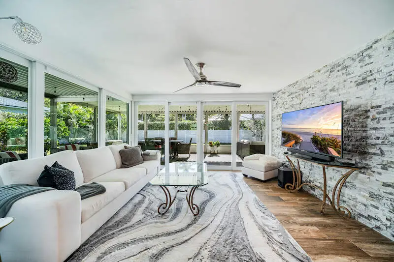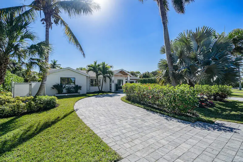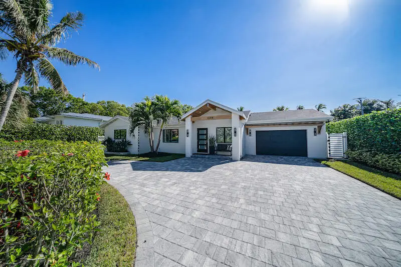 Gorgeous curb appeal!! This absolutely charming 3-bedroom, 2-bath ranch-style home in the desirable Lake Park neighborhood boasts stunning curb appeal with a freshly painted white exterior, bold black trim, main roof is asphalt shingles, metal lanai roof, and tasteful wood detailing accents. The inviting front porch, new light fixtures, and paver driveway with governors circle driveway for extra cars enhance the welcoming aesthetic. The beautifully landscaped yard is framed by newer white PVC privacy fencing and a gated rear yard. Decorative metal rain gutter downspouts add a touch of sophistication, creating a Santa Barbara-inspired exterior that feels crisp and contemporary. Inside, the open-concept layout is modernized with seamless "wood-look" tile plank flooring throughout, the kitchen features lighter creamy cabinetry, a tiled backsplash, breakfast bar, and high-end appliances including a WOLF electric cooktop and oven, BOSCH dishwasher, and French door refrigerator/freezer. The owner's suite offers an en-suite bath and dual closets, while the guest suite opens to a paver patio overlooking the private backyard. The renovated guest bathroom includes white tiled shower walls accented with mosaic bands, a floating double-sink vanity, and extra storage. A glass-enclosed family room with tile plank floors, a stone accent wall, and a ceiling fan provides additional living space, while the screen-enclosed porch with epoxy flooring and string lights is perfect for relaxing or entertaining. The oversized 1.5 garage features built-in storage rack and the enclosed laundry room is equipped with Samsung front-loading washer and dryer. With its lushly landscaped and private backyard, proximity to top-rated schools, trendy restaurants, and Naples' sunny beaches, this home offers a perfect blend of classic charm and modern living in a highly sought-after walking community.