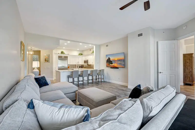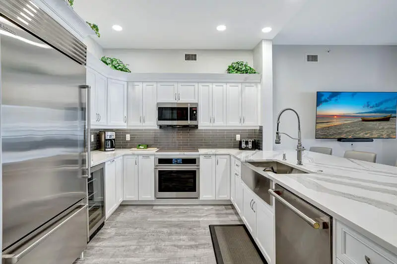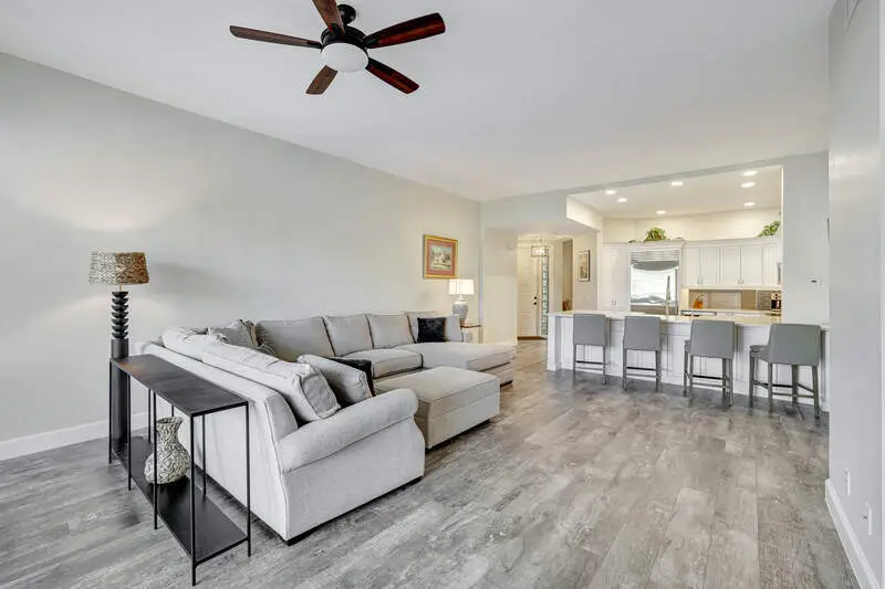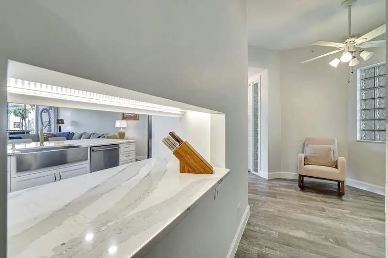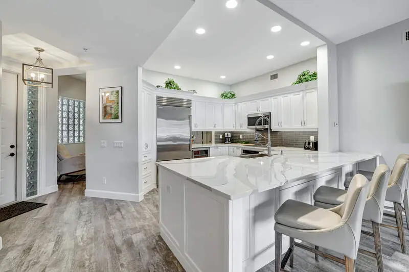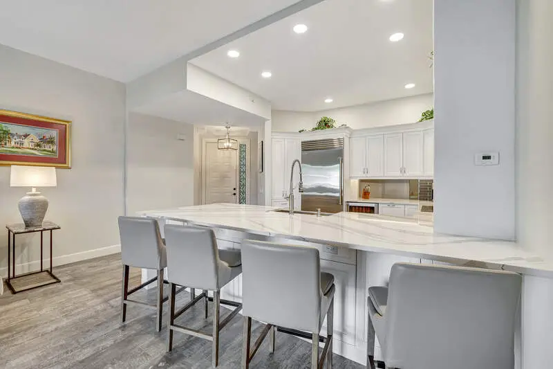 This COMPLETELY RENOVATED residence in the prestigious Pelican Bay community of Breakwater offers the ultimate in luxury coastal living. Thoughtfully redesigned with HIGH-END finishes throughout, including custom cabinetry, luxury flooring, designer tile, and stunning countertops, no expense was spared. The kitchen and living spaces are outfitted with state-of-the-art appliances, blending style and function seamlessly. Bright, open, and coastal, this home is move-in ready for its new owner. The sought-after floor plan features 3 bedrooms + den, 2 baths, high ceilings, an oversized 2-car garage, and convenient elevator access. Enjoy sparkling long lake views from the oversized lanai, perfect for relaxing or entertaining. Breakwater has also been beautifully updated with new roofs, exterior painting, lighting, and signage, along with a fully renovated clubhouse featuring a heated resort-style pool, spa, fitness room, and professional on-site management. This PET-FRIENDLY community with no weight restrictions is one of the most welcoming in Pelican Bay. Living in Pelican Bay means world-class amenities at your doorstep: private beach access with beachfront dining, beach attendants, sailboats and kayaks, a top-tier fitness center, a lakeside wellness studio/spa, two tennis facilities, and pickleball courts coming soon. All just minutes from Waterside Shops, Mercato, and Artis-Naples. Come home to one of Naples' most coveted communities and experience coastal living at its finest.