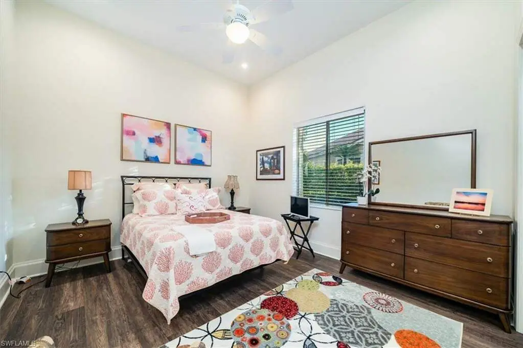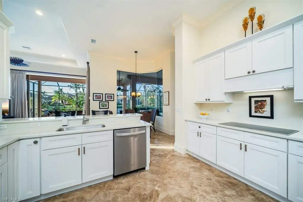 Nestled behind the gates of the prestigious Vineyards Country Club, this custom-built residence is a rare gem that showcases exceptional craftsmanship, thoughtful design, and a host of luxury upgrades that set it apart. December 2023 NEW ROOF!! Nestled behind the gates of the prestigious Vineyards Country Club, this custom-built residence is a rare gem that showcases exceptional craftsmanship, thoughtful design, and a host of luxury upgrades that set it apart. Designed by a discerning builder for personal use, the home offers numerous high-end extras not commonly found, including soaring ceilings that create a grand sense of space and scale, extensive custom millwork, and refined architectural details throughout. From the moment you arrive, the curb appeal is striking-with a stately governor's paver driveway, side-entry 3-car garage, and lush, mature landscaping enhanced by fresh mulch, all situated on a quiet, oversized cul-de-sac lot offering unmatched privacy and picturesque lake views. Inside, the elegant marble-floored foyer opens to a gracious living room with coffered ceilings and seamless flow to the expansive screened lanai, ideal for indoor-outdoor living. The home's layout is both functional and inviting, with formal and casual dining areas, an updated white kitchen with solid-surface countertops, a breakfast bar, and a glass-enclosed breakfast room bathed in natural light. The oversized family room and outdoor summer kitchen make entertaining effortless. Each guest suite is a private retreat, with luxury vinyl "wood look" flooring, custom double closets, and individual bath access that have been remodeled and updated. The owner's wing is a sanctuary, offering two walk-in closets, lanai access, and a spa-inspired bathroom with a walk-through shower and dual vanities. An additional flexible space serves as a fourth bedroom or office, and the third garage bay has been transformed into an air-conditioned bonus room, ideal as a game room, gym, or "mancave." A prime location within one of Naples' most established and amenity-rich communities, this residence is the perfect blend of elegance, comfort, and thoughtful upgrades.