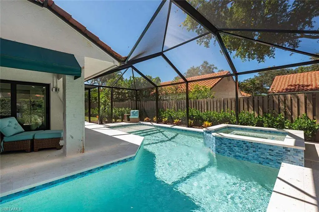One of the rare homes in Beachwalk to feature its own private pool; this brand-new pool and spa were just completed, offering a turnkey outdoor retreat. The sparkling pool and elevated spa are framed by sleek, modern tilework and surrounded by a spacious travertine deck, perfect for sunbathing, entertaining, or enjoying a quiet morning coffee offering your own private oasis. The home has been reimagined with timeless updates, elegance exudes from every corner of this completely remastered residence! Upon entering, the great room is a sprawling space with wood-grain tile dressing the floors, a raised vaulted ceiling, and hurricane impact sliders that give way to the serene outdoor living environs. Open to the living space that features an electric fireplace with a shiplap facade, the kitchen would fit a discerning chef with its double-thick white quartz counter tops, an oversized waterfall island with breakfast seating, custom cabinetry, and Viking appliances. Sheathed in pearl-like white tile with intricate detailing from floor to ceiling, the primary bathroom perfectly complements the private primary bedroom with a large soaking tub, walk in shower, and updated countertops/cabinetry. Additionally encompassed with this residence are two guest bedrooms, one with private entry and plumbed to host a future kitchen, a well-appointed bathroom, in-home laundry and a plethora of additional features. Beachwalk is ideally nestled a stone's throw to Naples' sugar sand coastline, as well as the fine dining and shopping found at Mercato and Waterside Shop.