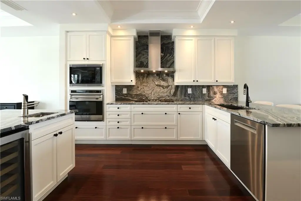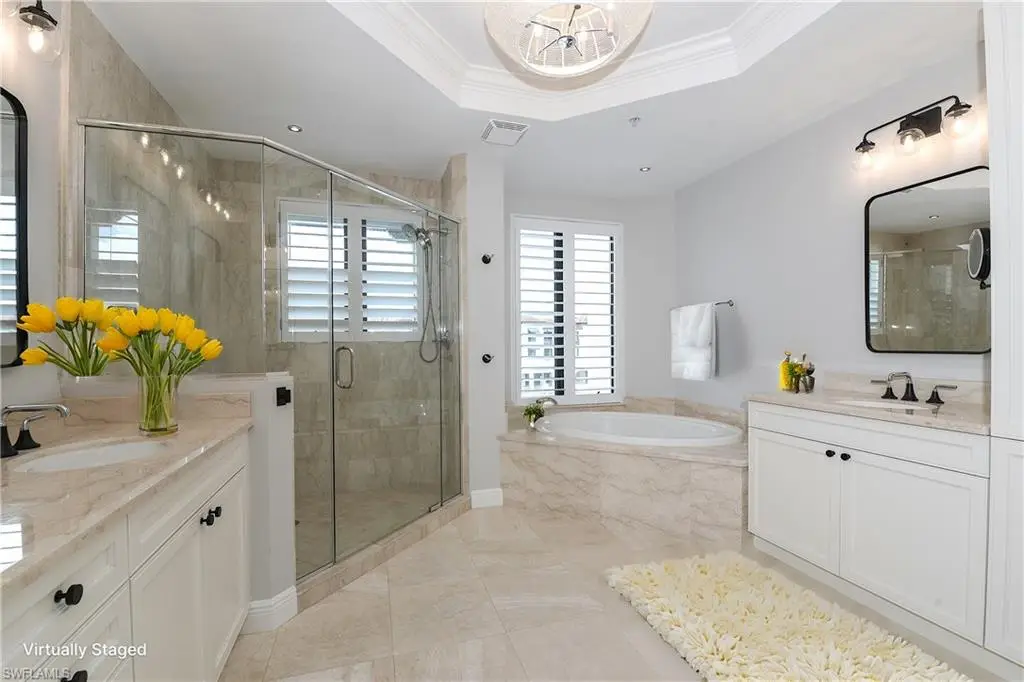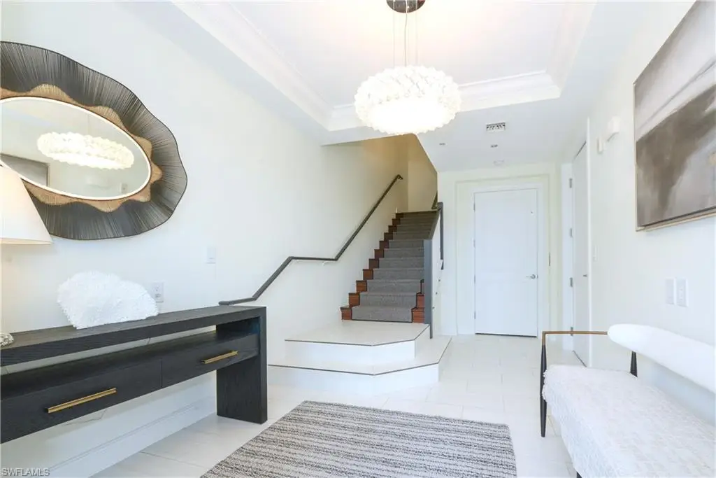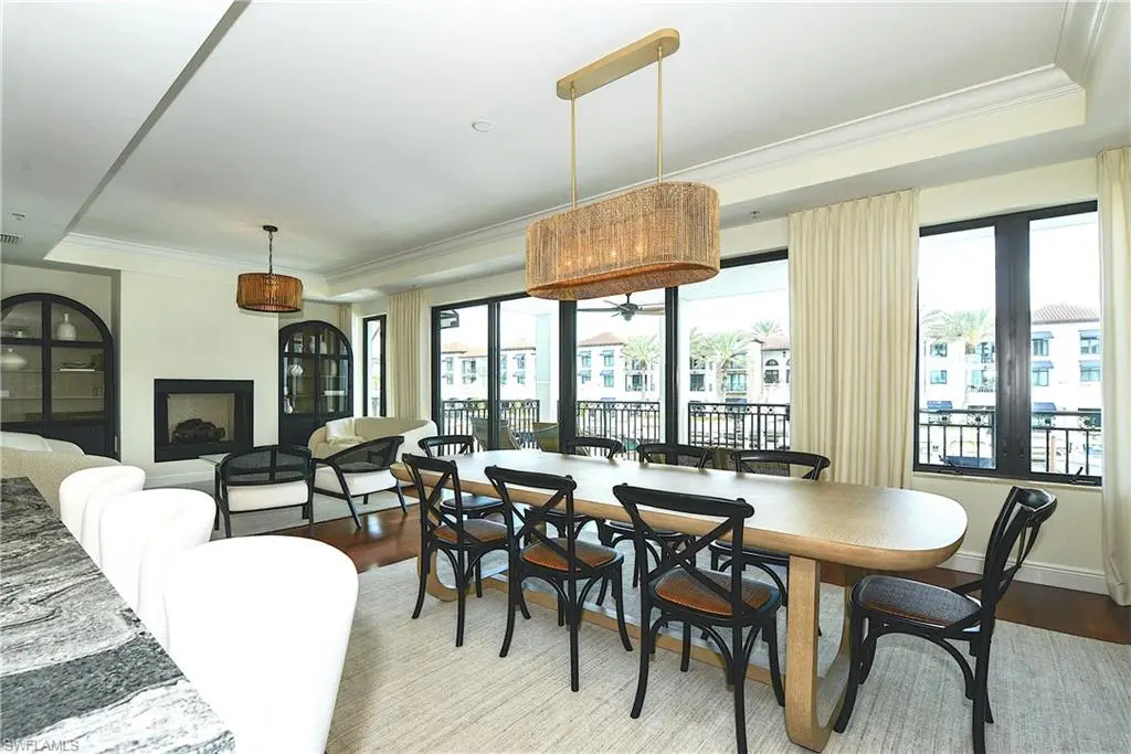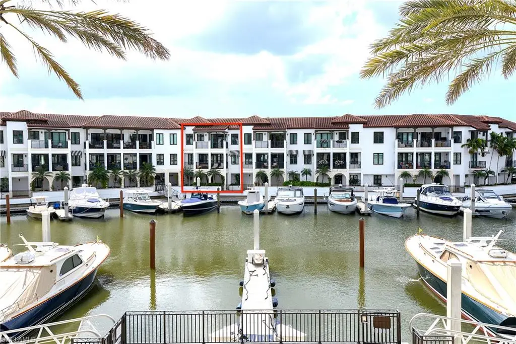 Indulge in the pinnacle of luxury waterfront living at Naples Bay Resort, where this exquisite 3-bedroom plus den, 4-bath condo offers an unparalleled blend of sophistication, comfort, and exclusivity. Perfectly positioned within one of Naples' most sought-after gated communities, this residence boasts breathtaking marina and water views from five private balconies, capturing the essence of resort-style living. Step inside to find an expansive, light-filled interior, meticulously designed with refined finishes and upscale details throughout. The open-concept living and dining areas are framed by floor-to-ceiling windows, allowing natural light to cascade across elegant flooring and custom millwork. The gourmet kitchen is a chef's dream, complete with top-of-the-line appliances, custom cabinetry, and sleek quartz countertops, making it both a functional workspace and a stylish focal point for entertaining. A private elevator leads to the luxurious primary suite, a serene retreat offering a spa-like en-suite bath, oversized walk-in closets, and a private balcony with tranquil water views - perfect for enjoying morning coffee or an evening sunset. The split floor plan ensures privacy for guests, with generously sized secondary bedrooms, each featuring en-suite baths and private balconies. The den provides an ideal space for a home office, media room, or exercise room, offering flexibility to suit your lifestyle. Beyond the impeccable interiors, this residence includes a spacious two-car garage, a rarity in resort living, and is offered partially furnished, allowing for an effortless transition into a luxury lifestyle. Ownership includes prestigious membership to the Naples Bay Club, providing access to a private members' club with world-class amenities and multiple dining options offering exquisite waterfront cuisine. Enjoy the state-of-the-art tennis facility with an on-site pro and Har-Tru tennis courts, five resort-style pools and a lazy river, and on-site boat rentals with direct access to the Gulf of Mexico. All of this is set just moments from Fifth Avenue South's premier shopping, fine dining, and entertainment, as well as Naples' stunning white-sand beaches. Offering the perfect balance of luxury, privacy, and breathtaking views, this rare waterfront retreat is an opportunity not to be missed.