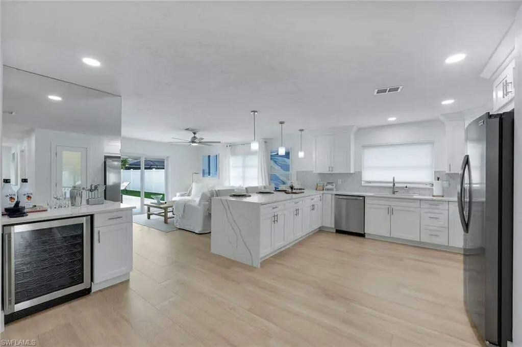 UPDATE----NEW OUTDOOR OVERHANG WITH KITCHEN IS NOW COMPLETED! Dream investment opportunity with proven rental history awaits with this fully remodeled 3-bedroom, 2-bathroom home in Naples Park and all the upgrades you've been searching for. Offered turnkey and fully furnished with brand-new furniture throughout, this residence is move-in or rent-out ready, delivering immediate returns for investors. Inside, the open-concept layout is designed for modern living and entertaining. The gourmet kitchen with upgraded countertops and hardware, an eat-in breakfast bar, and an adjacent bar with a wine cooler seamlessly blends with the living room. From there, the living space flows effortlessly through sliding doors to the resort-style backyard, making indoor-outdoor living a breeze. The resort-style backyard is a private oasis designed for relaxation and entertaining. It features a brand-new heated saltwater pool, new 12X30 overhang with outdoor kitchen, low-maintenance turf grass, and new vinyl fencing, creating the ultimate outdoor living space. Whether you envision lounging poolside or hosting gatherings, this backyard is ready to impress. Plans for a stylish overhang off in the rear of the home by the pool will add even more charm to this luxurious retreat. The upgrades continue with a new recreational space in the garage. This versatile area is perfect for a home gym, game room, or additional entertainment space, offering endless possibilities to customize the home to suit your lifestyle. Situated in the highly desirable X-500 flood zone, the property requires no flood insurance, offering peace of mind and cost savings. Located just over a mile from Vanderbilt Beach and Wiggins Pass and within walking distance of Mercato, where fine dining, luxury shopping, and vibrant nightlife await, the location is truly unbeatable. With no HOA or rental restrictions, this property offers unmatched flexibility for homeowners and investors alike. Whether you're seeking a lucrative rental property, a tranquil vacation retreat, or your forever home in paradise, this Naples Park gem has it all!