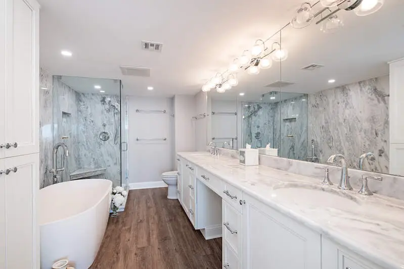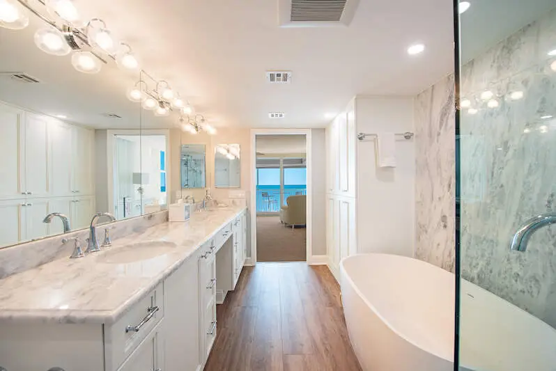 • Luxurious quartzite and marble countertops in all bathrooms