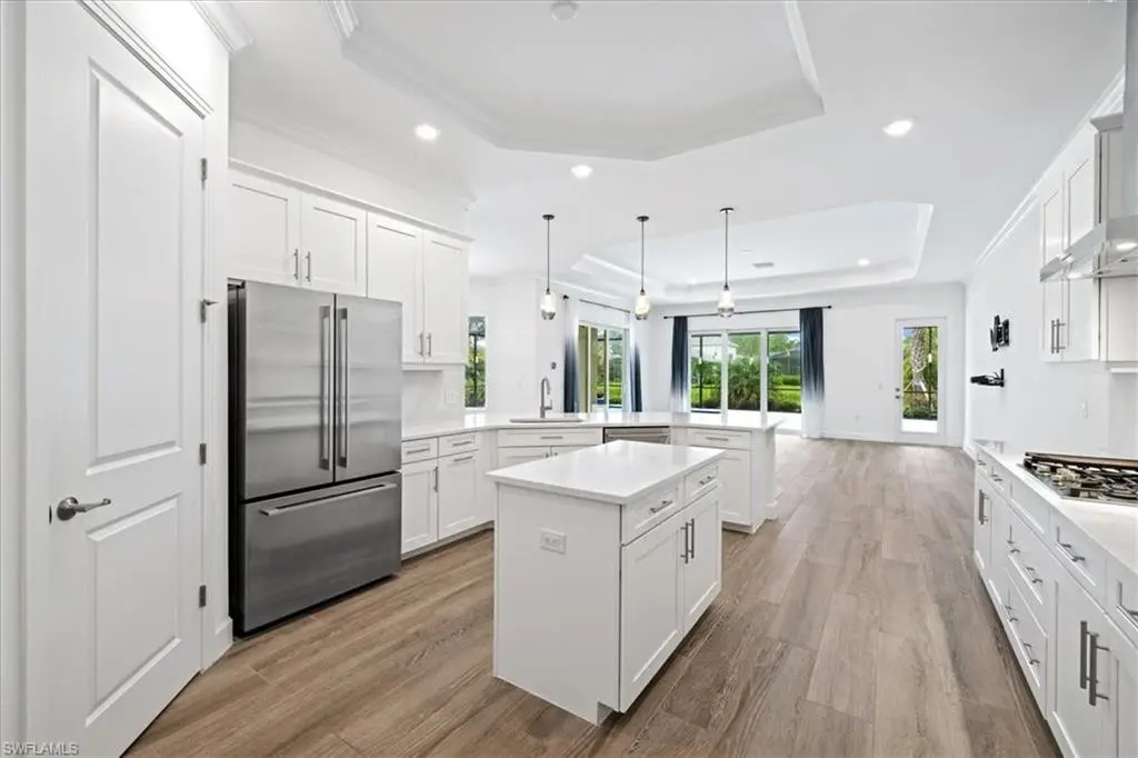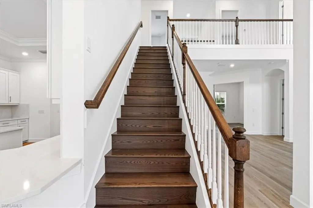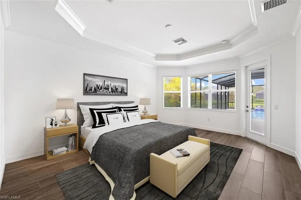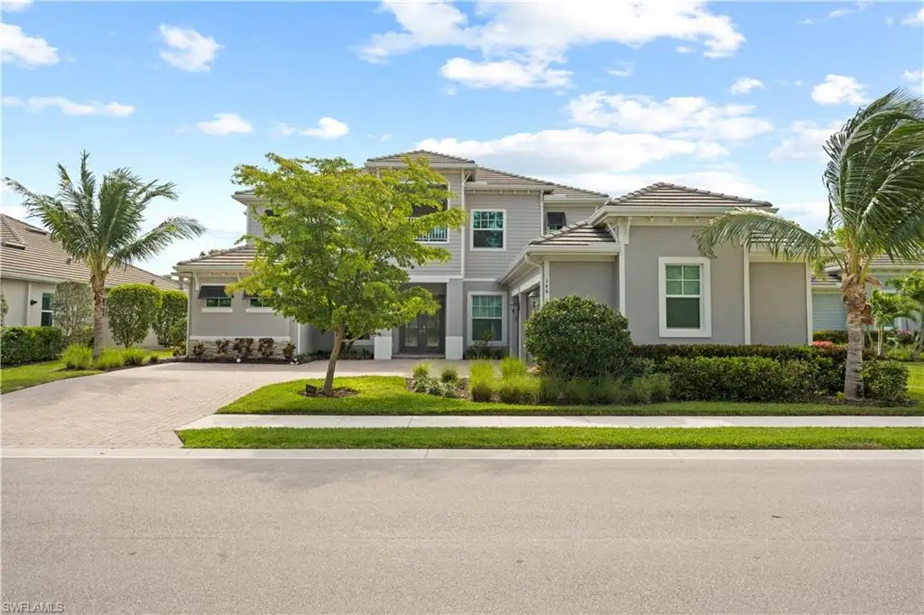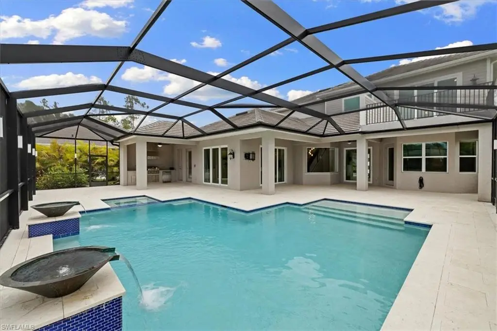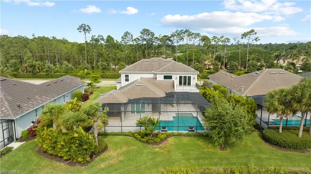 Located in the exclusive, gated community of Sereno Grove, this 2020 estate combines luxury with functionality across its 3,500 sq. ft. of space. The home features 4 bedrooms, 5 bathrooms, a den, a climate-controlled wine room for 1,800 bottles, an upstairs media room, heated pool and spa, a 3-car garage, and extensive patio space with an outdoor kitchen. High ceilings and natural light welcome you, with a design that seamlessly connects the living areas to a chef's kitchen, offering views of the pool and the evening skies. The master suite on the first floor includes a large bathroom, lanai access, and ample closet space. Upstairs, there are 3 bedrooms, 2 bathrooms, and a bonus room with a wine fridge and balcony overlooking the pool. This estate is ideal for those seeking proximity to North NaplesÆ beaches and dining, emphasizing both luxury and practicality for a discerning family. Sereno Grove is a centrally located community with low HOA fees.