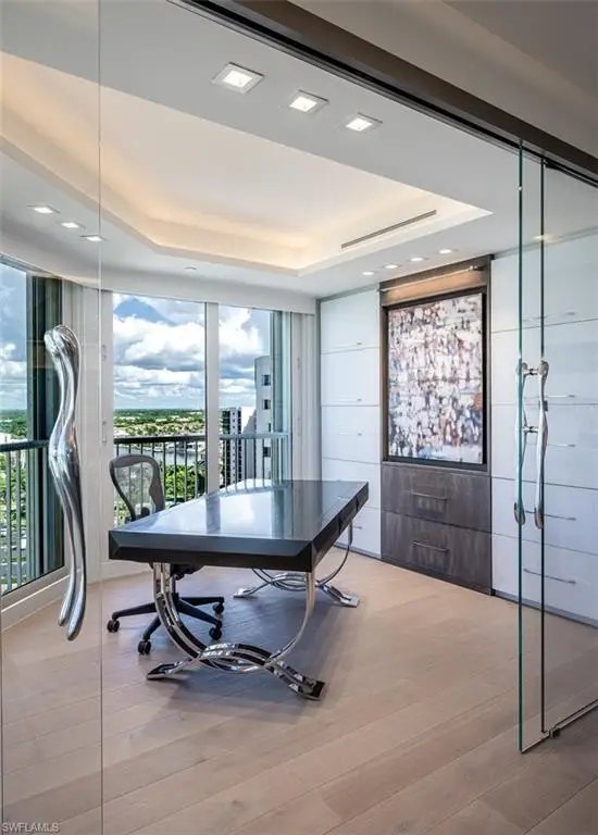A Modern Gulfside Masterpiece in Park Shore Experience the pinnacle of coastal sophistication in this reimagined penthouse residence, perfectly poised along the pristine white sands of the Gulf of Mexico. Every detail of this architectural showpiece was meticulously curated to reflect contemporary elegance and effortless luxury. From the moment you enter, sweeping walls of glass reveal panoramic vistas of turquoise waters and dazzling sunsets, while at night, the glittering city lights of Naples create an enchanting backdrop. The open living, dining, and kitchen areas flow seamlessly together, forming a grand entertaining space bathed in natural light. Thoughtfully designed interiors feature imported Carrera marble, quartzite surfaces, and bespoke finishes that embody modern refinement. A glass-enclosed study provides a serene retreat with commanding views of both the Gulf and Venetian Bay, while dual wet bars elevate the art of entertaining. Smart home technology and custom lighting panels allow for effortless ambiance control throughout. Offered fully furnished, this residence showcases curated artwork and custom furnishings from leading local artisans. Located within one of Park Shore's most coveted beachfront addresses, residents enjoy world-class amenities including a 24-hour staffed lobby, two guest suites, a Gulf-front heated pool and spa, fitness center, club room, billiards, library, and tennis courts. Two dedicated garage spaces complete this exceptional offering. Just minutes from Old Naples, Venetian Village, and the area's finest dining and shopping, this extraordinary penthouse redefines luxury beachfront living - where modern design meets the timeless beauty of the Gulf.