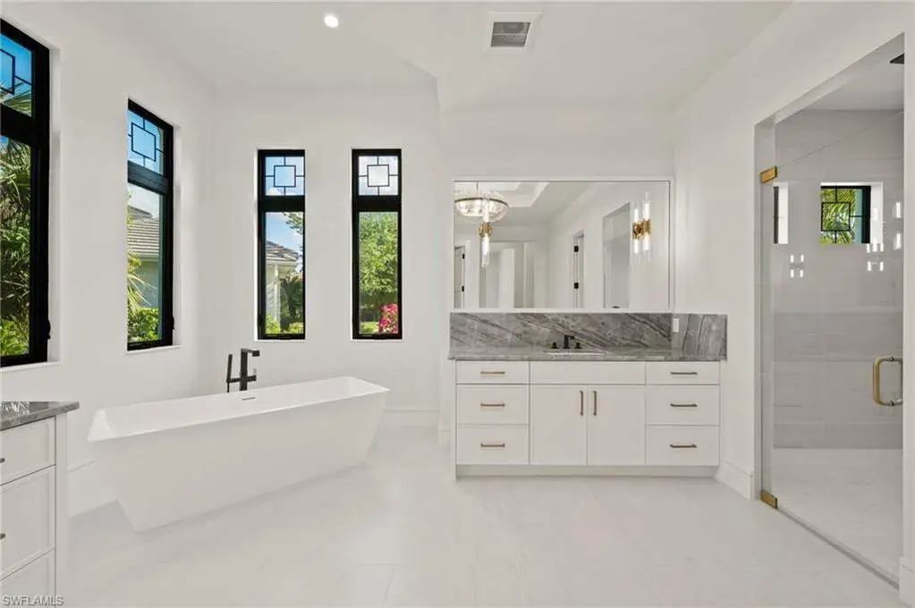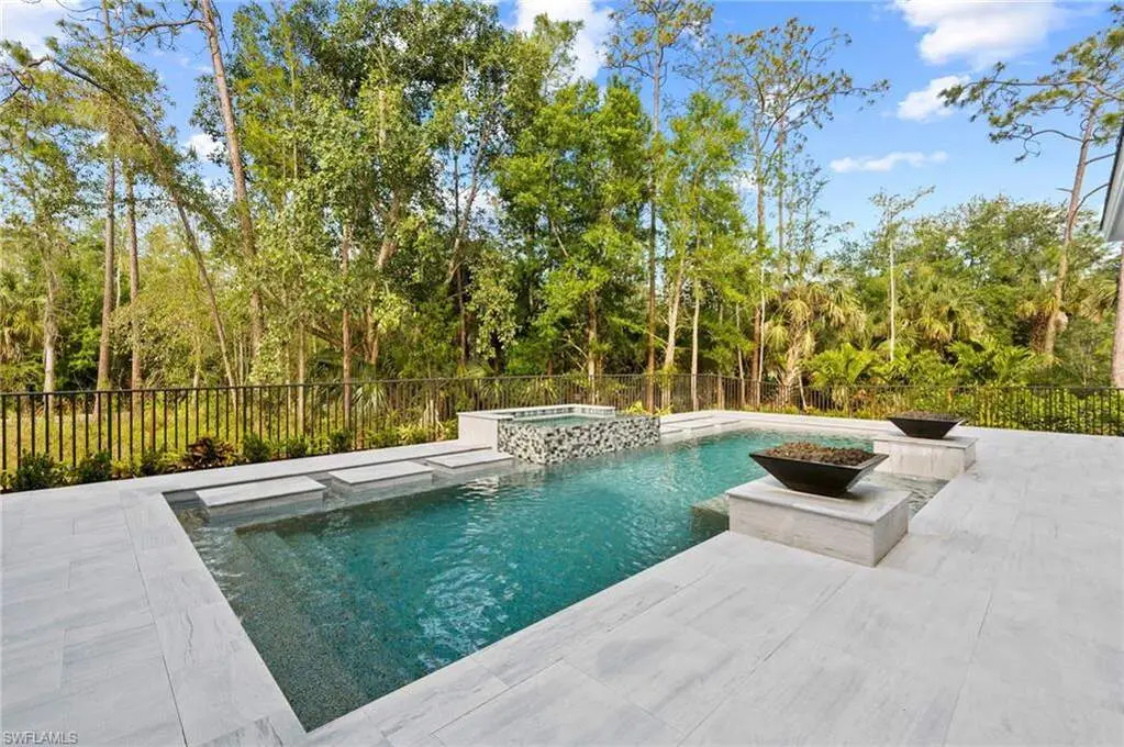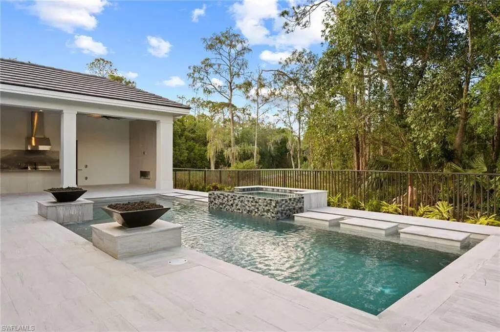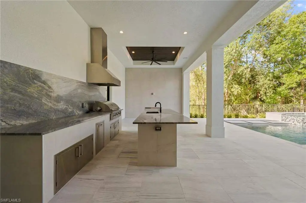 TRANSFERABLE GOLF MEMBERSHIP AVAILABLE! Skip the golf wait list and enjoy an immediate golf membership with only a transfer fee. Be the first to live in this New Construction home built by "Florida Lifestyle" and enjoy privacy at the end of a cul de sac while still having a golf course view. The split floor plan features four en suite bedrooms and the zen-like primary suite offers large custom walk-in closets and a spa-style bath with large soaking tub, custom walk-in shower with multiple shower heads, dual vanities, and two separate water closets. The adjacent study is anchored by a custom shiplap wall and provides access to the lanai while the open concept of the main area of the house flows from the gathering room with coffered ceilings and custom lighting, into both the kitchen and dining room. An elegant, mirrored wall in the dining area is a perfect aesthetic and the gourmet kitchen makes entertaining a snap with dual ovens, Thermador appliances, and an ample breakfast bar. Expanding the kitchen's efficiency is a magnificent butler's pantry fully equipped with a second dishwasher, sink, microwave, wine refrigerator, a large walk-in pantry, and plenty of storage. Hurricane-rated sliding doors open to a spacious covered lanai featuring an outdoor kitchen and fireplace. Relax beside the gorgeous pool, lounge on the sun shelf, soak in the spa, and enjoy the tranquil water and fire features. Amenity-rich Quail West, a hidden gem in North Naples, holds the exclusive Platinum Club status which is the pinnacle of recognition for Private Clubs around the world recognizing the top 1% globally. The world-class amenities include two championship golf courses, elegant clubhouse with a variety of dining options, a racquet sports complex, bocce courts, state-of-the-art fitness center, full-service salon/spa and unending activities for every interest.