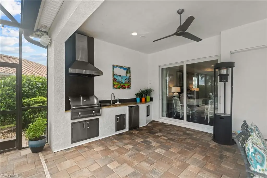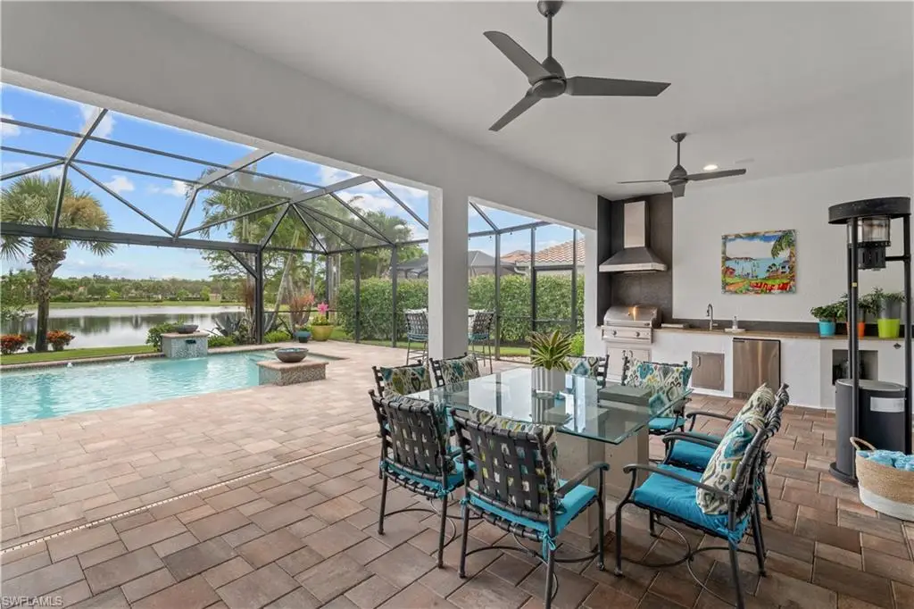 Welcome to this stunning, light-filled and ever so popular "Windsor" floorplan home, featuring 4 bedrooms plus den, 3 full baths, and a spacious 3-car garage. Nestled on an oversized, pie shaped lot with an extra long driveway, this home offers a wide-open Great Room layout that’s perfect for entertaining and everyday living. As you step inside, you’ll be greeted by a bright and airy atmosphere, highlighted by zero-corner pocketing sliding glass doors to the lanai that seamlessly connect the indoor and outdoor living spaces. The sliding doors lead to the expansive lanai, where you'll find an outdoor kitchen and an oversized electric and solar heated salt water pool with picture window screen cage overlooking the lake – your personal oasis. The chef’s kitchen is a dream, complete with raised panel cabinetry, KitchenAid appliances including wall oven, convection microwave, and beverage cooler. The large eat-in kitchen area offers the perfect spot to gather and enjoy meals with family and friends. Retreat to the luxurious primary suite, which boasts a tray ceiling, a spacious bath featuring a soaking tub & walk in shower, and two spacious walk-in closets with built-in cabinetry. For those wine enthusiasts, the custom climate controlled walk in wine room will be the envy of your family and friends. Storm ready with HURRICANE IMPACT WINDOWS/DOORS! Enjoy boating, golf, tennis, pickleball, bocce, a tiki bar, restaurant, poolside food and drink service, a fitness center, and social activities. The recently renovated $18M Lake Lodge & Beach Club offers over 500 acres of navigable lakes, boat slips available for lease, and a private 18-hole golf course (full golf memberships available/optional). In addition, The Quarry Golf Club offers a variety of membership opportunities. Designed in 2007 by the world-renowned architectural team of Dr. Michael Hurdzan and Dana Fry, this Par 72 championship course delivers a truly exceptional golf experience framed by breathtaking views. Water comes into play on every hole, creating both beauty and challenge, while the thoughtful design ensures an engaging round for golfers of all skill levels. With five sets of tees and a distinctive layout from hole to hole, this course offers endless variety—inviting you to enjoy the challenge again and again.Don’t miss the chance to experience a lifestyle like no other in The Quarry – schedule your private showing today!