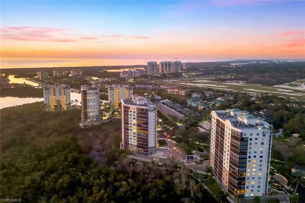 Introducing a sanctuary of luxury living in this prestigious Cove Towers condominium overlooking Turkey Bay with sunset views looking out to the Gulf of Mexico. Located in the highly coveted 01 corner stack where only 3 other end units have been sold over the last 10 years. This gorgeous property epitomizes the pinnacle of elegance and sophistication with private elevator entry opening to your grand salon with wrap around balcony and includes 3 bedrooms and 3.5 baths. Cove Towers is a gated enclave within a gated community, and residents will revel in the exclusivity of the private Calypso Club. Boasting a heated lap pool, a cabana adorned with a fireplace & grills, media/entertainment room, a fitness room, onsite management, and guest suites. This haven offers an active resort lifestyle all located just steps from the residence. The meticulously designed kitchen will be a cook's dream and features top-of-the-line Cafe appliances including an Advantium that offers convection, microwave and halogen cooking, professional French door wall oven, induction cooktop, GE Monogram wine chiller & recently updated granite countertops with breakfast bar all set against the backdrop of newly updated wide plank engineered wood flooring. You'll appreciate attractive and updated lighting throughout the home as well as elegant plantation shutters that offer a coastal modern feel. The master suite offers balcony access and features a serene view of the gulf in addition to an in-suite bath with soaking tub & shower as well as 2 walk in closets. Guests can enjoy both spacious guest bedrooms with in-suite baths and shared balcony with views of the newly developed Kinsale Golf Club. Residents have the option to join Tarpon Cove Yacht & Tennis Club which is located within the community and offers tennis, dining, clubhouse, resort style pool and boat taxi to Naples gorgeous white sand beaches. Embracing captivating views of Turkey Bay and the Gulf of Mexico, this home is the epitome of luxury living.