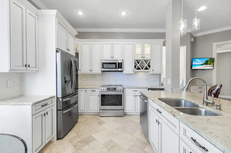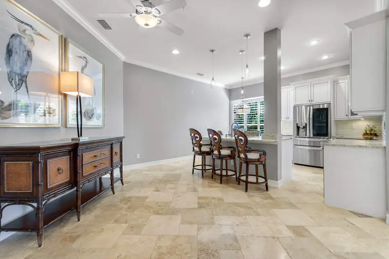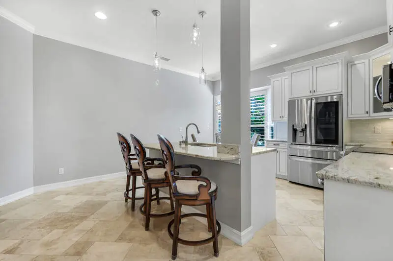 Welcome to our wonderfully appointed and spacious second floor "Versailles" floor plan in highly desirable Les Chateaux. Some of the many features of the 3 bedroom, 2 bathroom residence include travertine tile throughout the main living areas, rich wood flooring in the bedrooms and living room, and brand-new washer and dryer. Beautifully updated kitchen offers new appliances, soft close / pull out cabinets, granite counters and stylish mosaic backsplash. Modernized bathrooms with marble counters and shower in Master and granite in second. Plantation shutters add timeless charm while custom closets provide smart and stylish storage solutions. Enjoy comfortable evenings on the private screened lanai nestled amongst mature landscaping. Your convenient, private 2 car garage has epoxy flooring and a flexible Inspired wall storage system. Les Chateaux offers its residents their own community room with swimming pool, spa and lounging area. Pelican Marsh is a splendid, amenity rich North Naples country club community and is conveniently located to the best in shopping, dining and beaches.