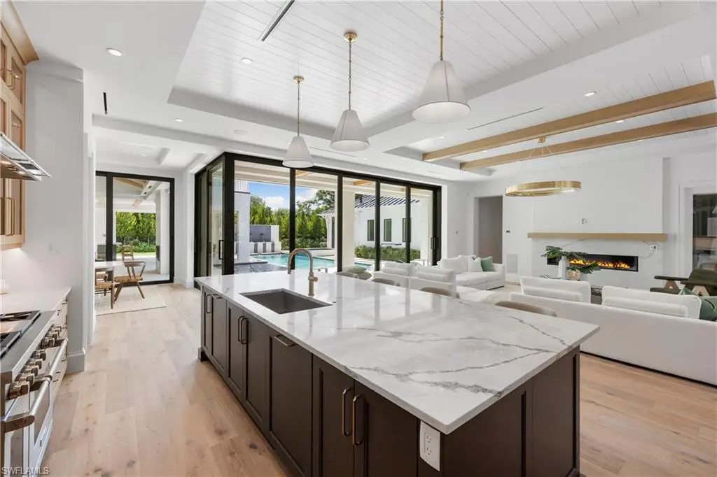 Newly constructed, never lived in and move-in ready, ideally situated on an oversized premium corner lot, this luxurious new-construction residence embodies the spirit of Naples living. Designed by MHK in collaboration with Waterside Builders and Diana Horsley Interiors, the spectacular light-filled six-bedroom + den home flows gracefully from one engaging space to another. Finished to the highest standard, the open floor plan with voluminous ceilings features multiple fireplaces, European oak floors, Ruben Sorhegui tile, quartz counters, elevator, and generator. Chef's kitchen offers Sub-Zero, Wolf and Miele appliances, large center island and generous butler's pantry with additional storage and appliances. A full wall of pocketing glass sliding doors leads to spacious outdoor covered living areas, including an outdoor lounge, dining area, summer kitchen, half bath, and heated pool and spa with western exposure. First-floor primary retreat includes substantial dual walk-in closets and a spa-like ensuite bath with separate water closets. Bonus room, wet bar, balcony, laundry and five additional en-suite bedrooms, including a cabana/VIP suite with private entry, provide comfortable accommodations for guests on the second level. In close proximity to 5th Avenue S, Third Street S and sugar sand beaches, this home represents a rare opportunity to enjoy the best Naples has to offer.