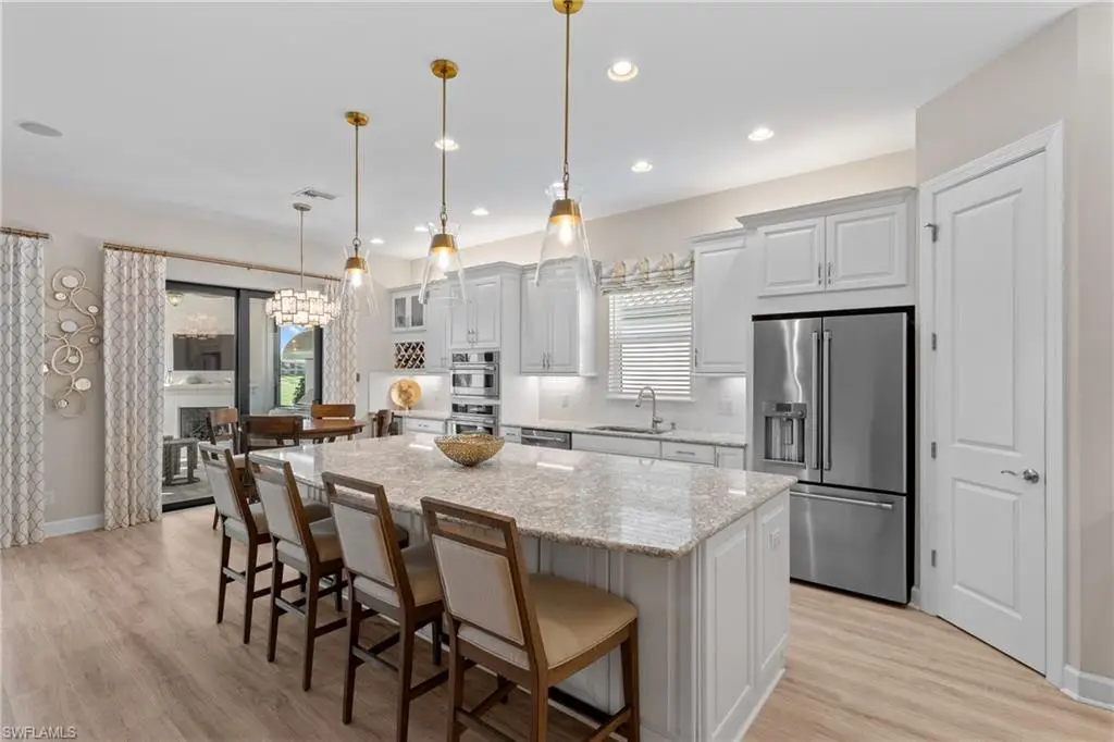 LIVE A VACATION LIFESTYLE IN ESPLANADE! FULL GOLF MEMBERSHIP INCLUDED! Built in 2020, this immaculate expanded "Lazio" offers sunrise views overlooking the 16th fairway & lake and offers a spacious floorplan consisting of three Bedrooms plus Den, three Full Baths, extended two car garage, and nearly 2400 sq ft under air. An open great room style floorplan with two sets of sliding glass doors to the extended covered lanai complete with outdoor kitchen and gas fireplace make this the perfect home for entertaining. Catch some sun around the GAS heated salt water pool (with auto fill) and raised spa enclosed with a picture window screen cage highlighting this home's unobstructed view. A long list of special features include: HURRICANE IMPACT WINDOWS/DOORS; ELECTRIC ROLL DOWN HURRICANE SCREENS on the lanai; expanded kitchen with additional level V cabinetry, Cambria quartz countertops, over/under cabinet lighting, and pantry with custom shelving; GE Cafe appliances including wine cooler, GAS cooktop, wall oven, wall convection microwave, and French door refrigerator; Expanded primary & front guest bedrooms with bay windows; Primary suite walk in closet with custom shelving/drawers including center storage island; Luxurious baths complete with quartz countertops, upgraded tile, Level V cabinetry, upgraded toilets, frameless shower enclosures, and upgraded "Voss" shower fixtures including primary bath rain shower & hand held; hurricane impact front door with matching sidelights; SONOS in-ceilings speakers; special order chandeliers/light fixtures throughout; extended garage with built-in storage cabinets, ceiling racks, & attic access pull down stairs; spacious Laundry Room with cabinetry; crown molding; tankless GAS hot water heater; 8' solid core doors/10' ceilings; extensive landscaping with landscaping lighting; and more! Esplanade Golf & Country Club of North Naples is a true "Lifestyle Community" with something for everyone: resort pool complete with cabanas & poolside "Bahama Bar"; tennis; pickleball; bocce; Koquina Day Spa; fitness center; dog parks; 14 miles of bike/walking trails; 18 hole private golf course; 15,000 Sq Ft clubhouse featuring restaurant, bar, wine tasting room, wine lockers, & Starbucks style cafe! All of Esplanade's amenities, property landscaping/irrigation, and golf membership dues total just $3,412/quarter! No additional fees/memberships required! Add this home and Esplanade Golf & Country Club to your must see list today!