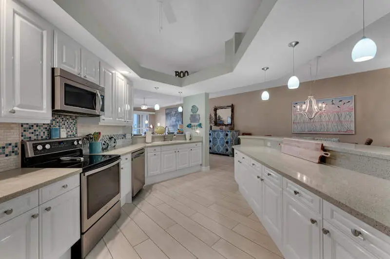 Welcome to this spectacular, beachy waterfront property in the heart of North Naples. This stylish first floor (second level) residence offers a coastal vibe and boasts stunning bay and gulf views from huge east and west facing lanais, perfect for catching both sunrise and sunset! The wide bay view overlooks three intersecting canals. The upgraded master faces the bay with huge separation from the two guest en-suite bedrooms that face the gulf. The den is hidden discreetly down the hallway from the primary bedroom. The interior features upgraded appliances, new flooring, renovated primary bath and beautiful kitchen counter tops. Also decorator shutters and electric storm shutters for added peace of mind. Amenities include a pool, two tiki huts, under building parking and extra storage for beach chairs making it a true waterfront paradise. Located across from the beach (public beach access across the street,) walking distance to La Playa and close to both the Ritz Carlton and Mercato, this home combines luxury and convenience for the Ultimate Naples Lifestyle!