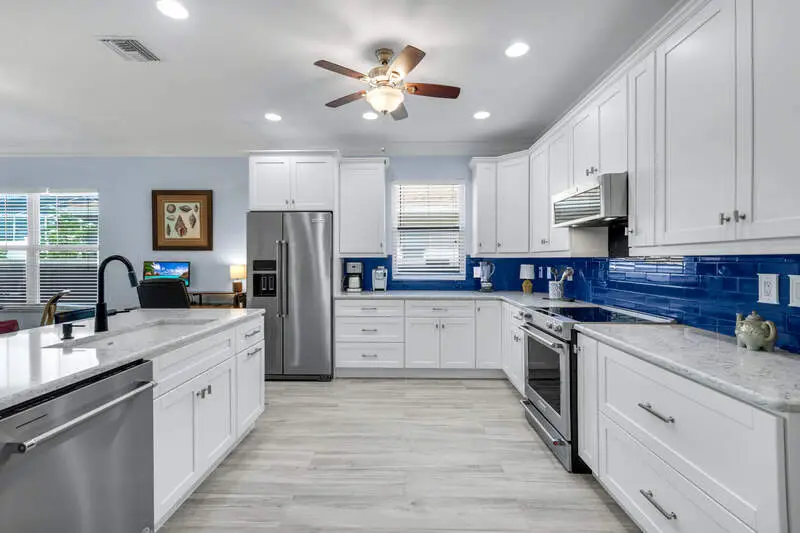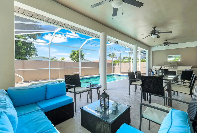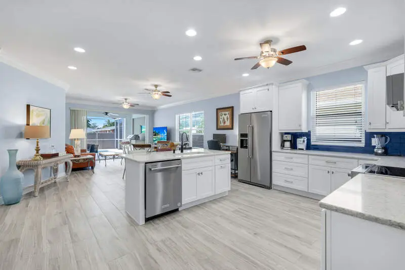 Beautifully renovated and fully furnished rare 4 bedroom, 3 bath pool home with preferred southern exposure for a sunny pool all day! This spacious single-family residence offers amazing 2,400+ sq ft of open concept living with high ceilings enhanced by new porcelain plank flooring through out! The updated stylish white kitchen Cabintery features striking subway tile backsplash and quartz countertops and island ideal for entertaining. New roof, new impact windows, new hurricane garage door, and new HVAC Pump. Freshly painted inside and the exterior was sealed and also painted complete with new gutters & down spouts. All the bathrooms were updated with new cabinets, shower & glass bathtub doors and plumbing. Enjoy the private outdoor area with beautifully resurfaced pool with new pool heater & pump, screened expansive lanai, and privacy wall for quiet relaxation. Located west of 41, just blocks to white sugar sand at Vanderbilt Beach, Mercato, and plethora of fine and casual dining, shopping, and entertainment. Move in ready or perfect for use as a high-demand seasonal rental. No HOA. Don't miss this incredible opportunity to own in Naples' most desirable non-HOA neighborhood and located in flood zone X with no flood insurance required!