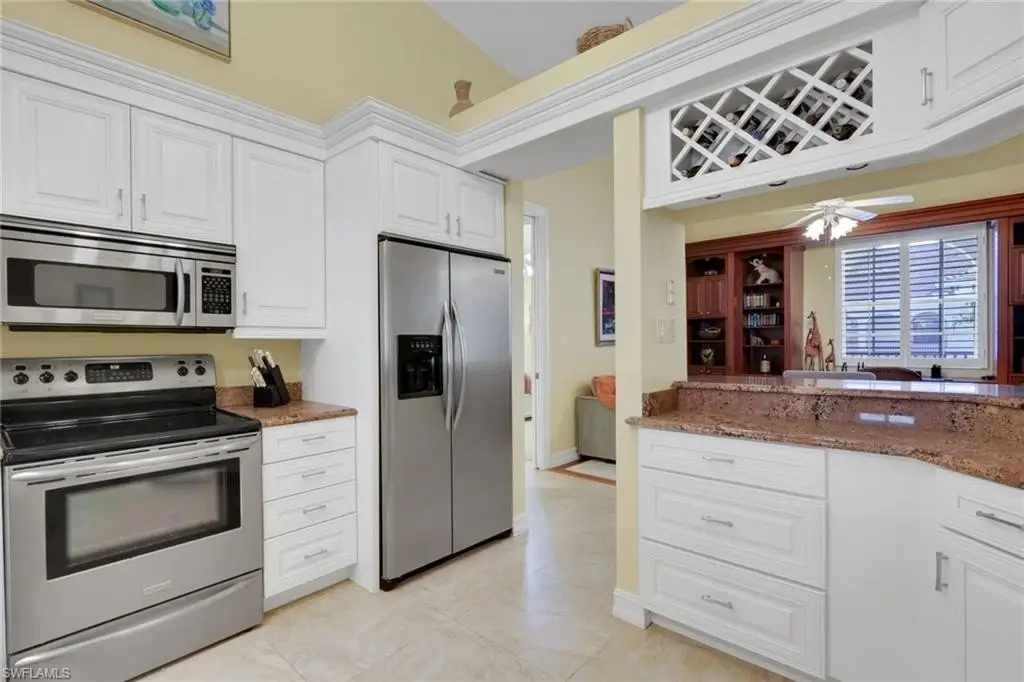 Top-floor living in Breakwater at Pelican Bay where volume ceilings, privacy and light all come together. This spacious 3rd-floor residence lives like a single-family home with an open great-room plan and peaceful treetop /water views from the fully enclosed lanai. Wide sliding doors allow you to open the space and flow right from the living room onto the outdoor area, effectively creating one large indoor/outdoor room for relaxing or entertaining. The bright white kitchen features rich granite counters, stainless appliances, abundant cabinetry and a long breakfast bar that keeps you connected to the dining and living areas. A built-in wine rack / serving area adds extra storage and a convenient spot for coffee, bar setup or buffet service. A separate den with custom floor-to-ceiling built-ins is the perfect home office, library or media room, easily converted to a sleeping area when extra company shows up as the couch can be converted to double bed. Additionally, could be easily converted to a full 3 bedroom by just adding an extra wall, as it has been done in many similar units in Breakwater. Wood and tile flooring in the main living spaces, neutral finishes and well-maintained interiors make this home easy to enjoy from day one or personalize to your taste. Breakwater is one of Pelican Bay’s newer low-density enclaves, tucked in a lush setting yet just minutes to Mercato, Waterside Shops and Artis–Naples. Per the association, windows and sliding doors are in the process of being upgraded to impact-resistant for added peace of mind (buyer to verify details and timeline). Ownership includes access to all Pelican Bay amenities: private beach access via tram, beachfront dining, fitness, tennis, walking paths and a full calendar of social activities. Available furnished or unfurnished and ready for you to enjoy the season in paradise.