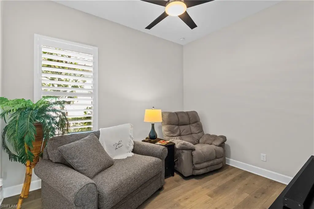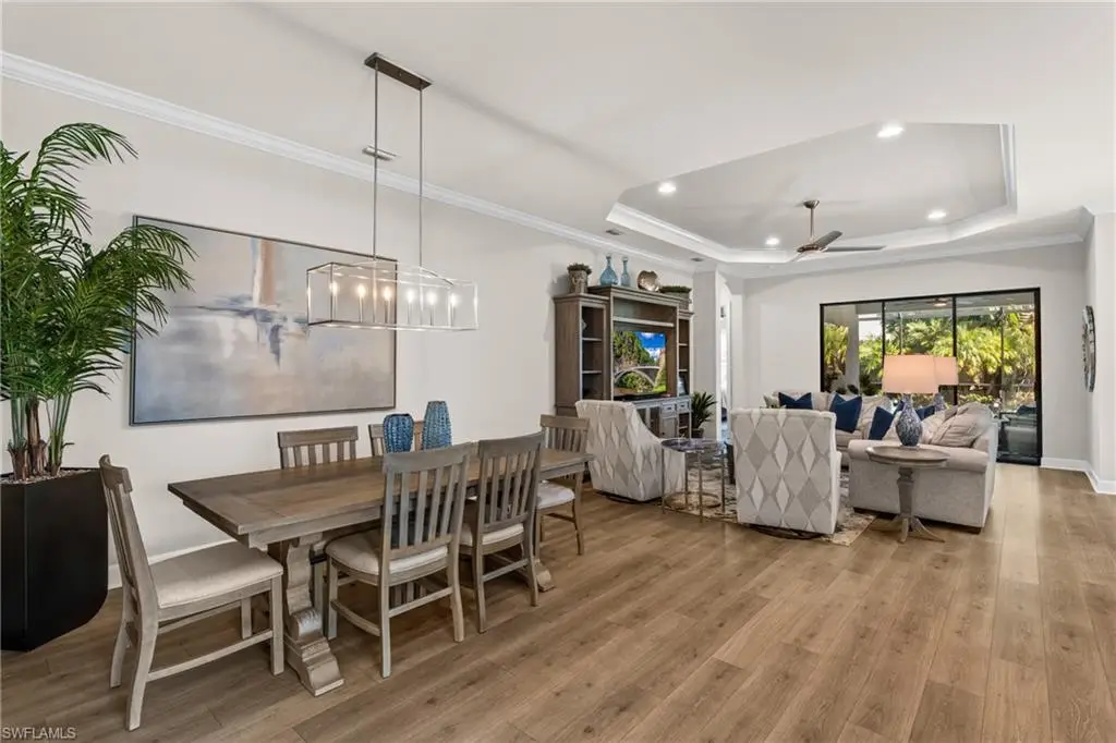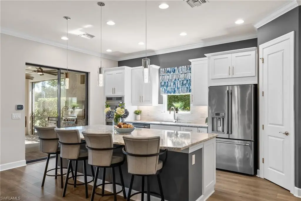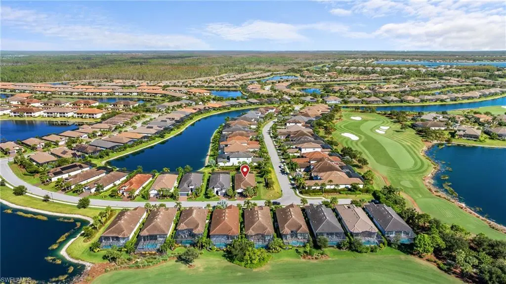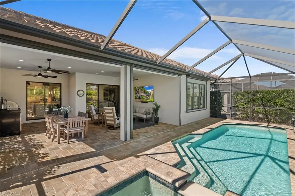 LIVE A VACATION LIFESTYLE IN ESPLANADE! FULL GOLF MEMBERSHIP INCLUDED! This lovingly cared for Lazio is situated on a private corner lot surrounded by lush and mature landscaping including speciality palms and colorful plantings which are even illuminated at night - giving this home a tropical oasis feel. Inside, you will find an open great room style floorplan with 3 bedrooms plus den, 3 full baths (all with walk in showers), and almost 2300 sq ft of living space. From the moment you walk in the door, you are greeted with wood floors that flow throughout the entire home and two sets of sliding glass doors to the extended lanai complete with custom outdoor kitchen, GAS heated salt water pool with raised spa, and motorized roll down hurricane shutters. The kitchen is the heart of the home and features shaker style cabinetry, Cambria quartz countertops, pantry with custom shelving, and GE Cafe appliances including a GAS cooktop, wall oven, and additional beverage cooler. This home is totally storm ready with a WHOLE HOUSE GENERATOR and roll down hurricane shutters on all windows and lanai openings. Other fine appointments include: plantation shutters on all windows; primary suite walk in closet with custom shelving/drawers including island; hurricane impact front door with matching sidelights; air conditioned extended garage with custom cabinets & epoxy floor; spacious Laundry Room with upgraded LG washer/dryer and cabinetry; crown molding; upgraded light fixtures and fans throughout; frameless shower enclosures in all bathrooms; tankless GAS hot water heater; insulated interior walls; 8' doors/10' ceilings; extensive professionally enhanced landscaping with professional landscaping lighting; and more! Esplanade Golf & Country Club of North Naples offers a true Lifestyle Community with world-class amenities, including a resort pool with cabanas and the popular Bahama Bar, tennis, pickleball, bocce, a 14-mile network of bike/walking trails, and an 18-hole private golf course. The impressive 15,000 Sq Ft clubhouse features a restaurant, bar, wine-tasting room, wine lockers, and a Starbucks-style cafe. Best of all, the property's landscaping, irrigation, golf membership, and all community amenities are covered under a quarterly fee of just $3,412 - no additional fees or memberships required! Don't miss your opportunity to own this exceptional home in one of Naples' most sought-after communities. Schedule your tour of this stunning home and Esplanade Golf & Country Club today! COMING SOON TO ESPLANADE (2026): Fully renovated and expanded poolside Bahama Bar; expanded outdoor bar at the Barrel House; expanded golf practice range; and an AIR CONDITIONED INDOOR PICKLEBALL COMPLEX with four indoor courts.