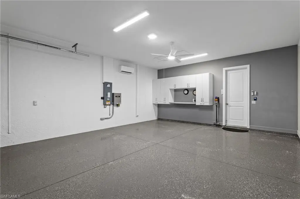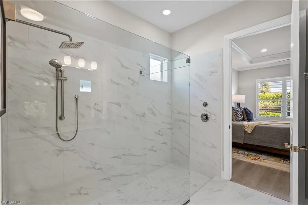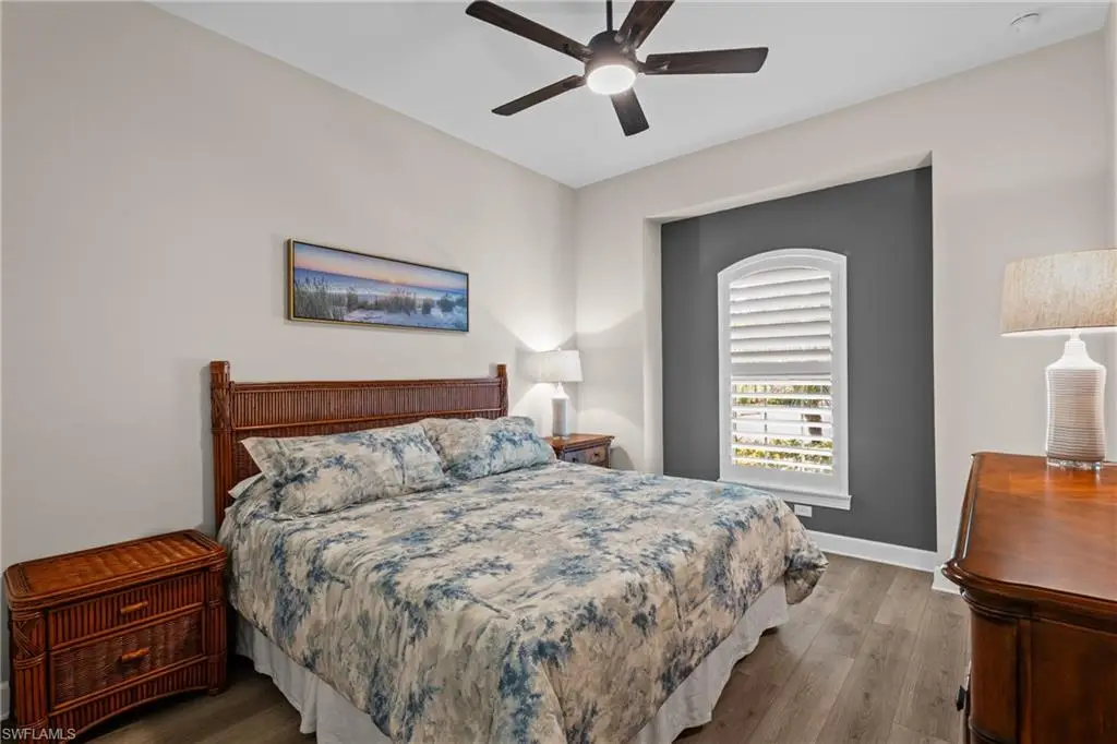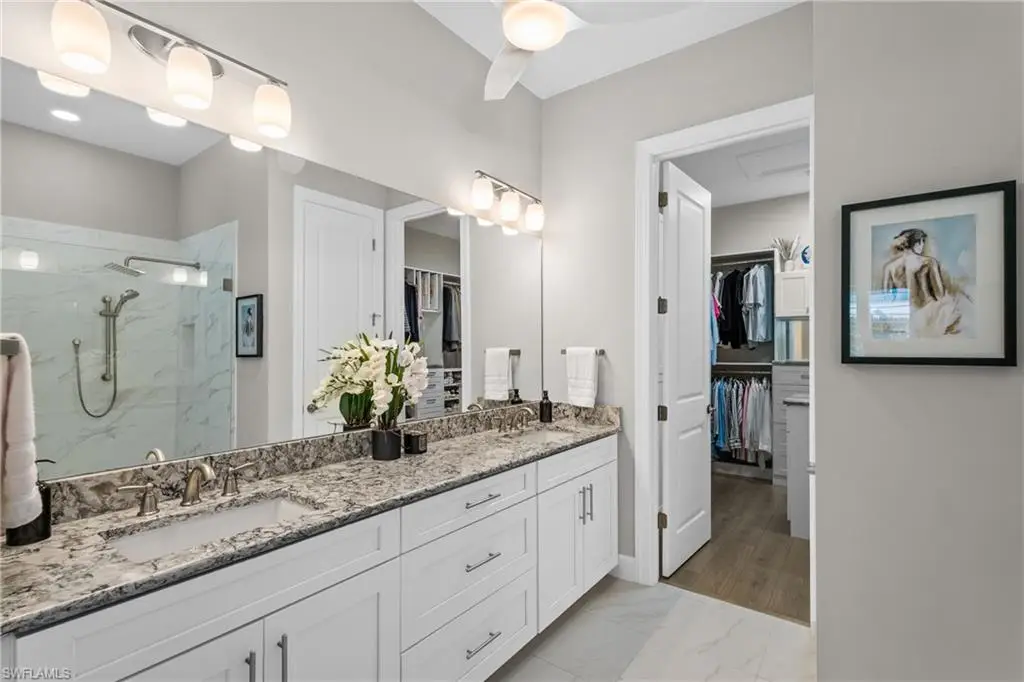 LIVE A VACATION LIFESTYLE IN ESPLANADE! FULL GOLF MEMBERSHIP INCLUDED! This lovingly cared for Lazio is situated on a private corner lot surrounded by lush and mature landscaping including speciality palms and colorful plantings which are even illuminated at night - giving this home a tropical oasis feel. Inside, you will find an open great room style floorplan with 3 bedrooms plus den, 3 full baths (all with walk in showers), and almost 2300 sq ft of living space. From the moment you walk in the door, you are greeted with wood floors that flow throughout the entire home and two sets of sliding glass doors to the extended lanai complete with custom outdoor kitchen, GAS heated salt water pool with raised spa, and motorized roll down hurricane shutters. The kitchen is the heart of the home and features shaker style cabinetry, Cambria quartz countertops, pantry with custom shelving, and GE Cafe appliances including a GAS cooktop, wall oven, and additional beverage cooler. This home is totally storm ready with a WHOLE HOUSE GENERATOR and roll down hurricane shutters on all windows and lanai openings. Other fine appointments include: plantation shutters on all windows; primary suite walk in closet with custom shelving/drawers including island; hurricane impact front door with matching sidelights; air conditioned extended garage with custom cabinets & epoxy floor; spacious Laundry Room with upgraded LG washer/dryer and cabinetry; crown molding; upgraded light fixtures and fans throughout; frameless shower enclosures in all bathrooms; tankless GAS hot water heater; insulated interior walls; 8' doors/10' ceilings; extensive professionally enhanced landscaping with professional landscaping lighting; and more! Esplanade Golf & Country Club of North Naples offers a true Lifestyle Community with world-class amenities, including a resort pool with cabanas and the popular Bahama Bar, tennis, pickleball, bocce, a 14-mile network of bike/walking trails, and an 18-hole private golf course. The impressive 15,000 Sq Ft clubhouse features a restaurant, bar, wine-tasting room, wine lockers, and a Starbucks-style cafe. Best of all, the property's landscaping, irrigation, golf membership, and all community amenities are covered under a quarterly fee of just $3,412 - no additional fees or memberships required! Don't miss your opportunity to own this exceptional home in one of Naples' most sought-after communities. Schedule your tour of this stunning home and Esplanade Golf & Country Club today! COMING SOON TO ESPLANADE (2026): Fully renovated and expanded poolside Bahama Bar; expanded outdoor bar at the Barrel House; expanded golf practice range; and an AIR CONDITIONED INDOOR PICKLEBALL COMPLEX with four indoor courts.