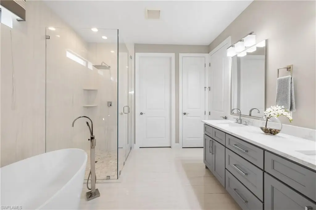 A true showpiece of modern luxury, this one of a kind Pinnacle model in Greyhawk has been reimagined through more than $400,000 in high end designer renovations, creating a residence that is as sophisticated as it is effortlessly livable. Every inch of the home has been thoughtfully curated with top tier materials, refined craftsmanship, and timeless design. The all-new custom kitchen serves as the heart of the home, showcasing Thermador appliances, 48" shaker cabinetry, dual pantries with pullout inserts, quartz countertops and backsplash, a waterfall island, and a Galley sink and faucet system, a chef's dream. The great room impresses with a stacked stone feature wall, custom built-ins and LED lit floating shelving, all opening through zero corner impact sliders to a breathtaking outdoor oasis. The expansive lanai features travertine flooring, a full outdoor kitchen, StormSmart hurricane screens, and a heated saltwater pool with LED fountain lighting, all overlooking tranquil sunset water and golf views. Inside, elegant details abound including custom wood accents, coffered ceilings, designer lighting, remote controlled window treatments, and upgraded finishes throughout. The primary suite offers a California Closets system with integrated lighting and a fully renovated spa bath clad in Italian Bianco Dolomite porcelain tile with quartz countertops, a freestanding soaking tub, and a seamless glass shower. Each bathroom and the laundry room have been upgraded with quartz surfaces, upgraded fixtures, and modern tilework. Additional upgrades include a whole house Generac generator, air and water filtration systems, new impact glass windows and doors, Nest smart thermostats, and a comprehensive ADT security system with outdoor cameras. The extended four foot garage is finished with epoxy floors, quartz topped cabinetry, and insulated doors with attic ventilation. Perfectly positioned on one of the community's most private lots with no homes in front or behind, this property offers unmatched serenity and style. Greyhawk residents enjoy resort-style amenities including a lagoon pool and spa, tennis and pickleball courts, fitness center, full-service restaurant and bar, and a social golf membership to The Golf Club of the Everglades. This home is a masterclass in design and craftsmanship, one of the finest offerings ever presented in Greyhawk.