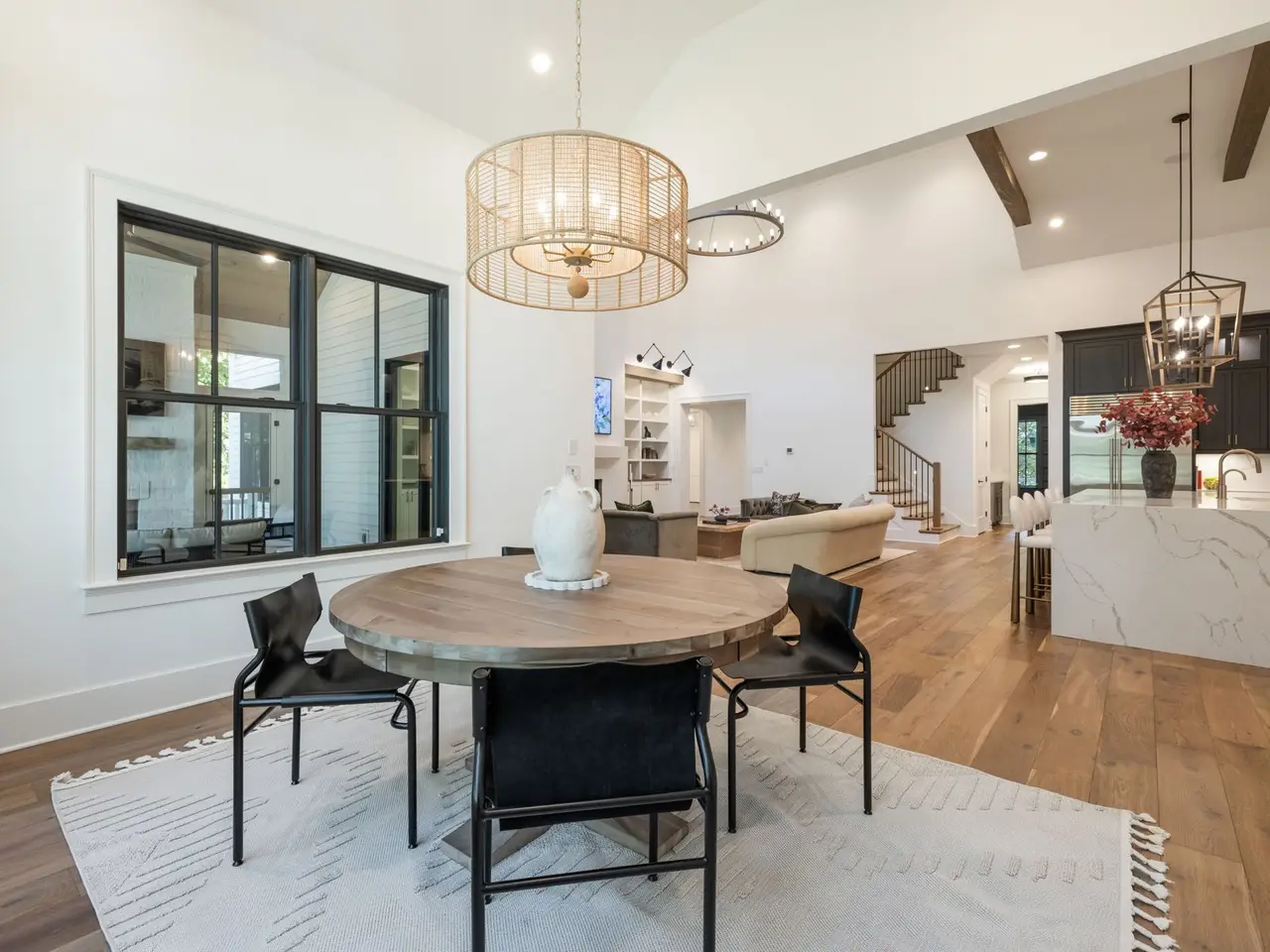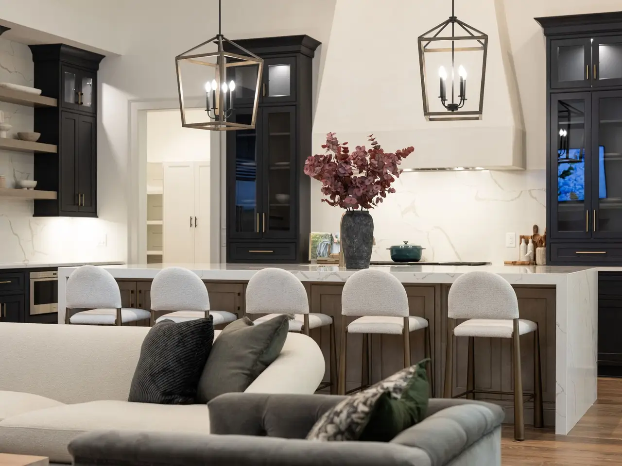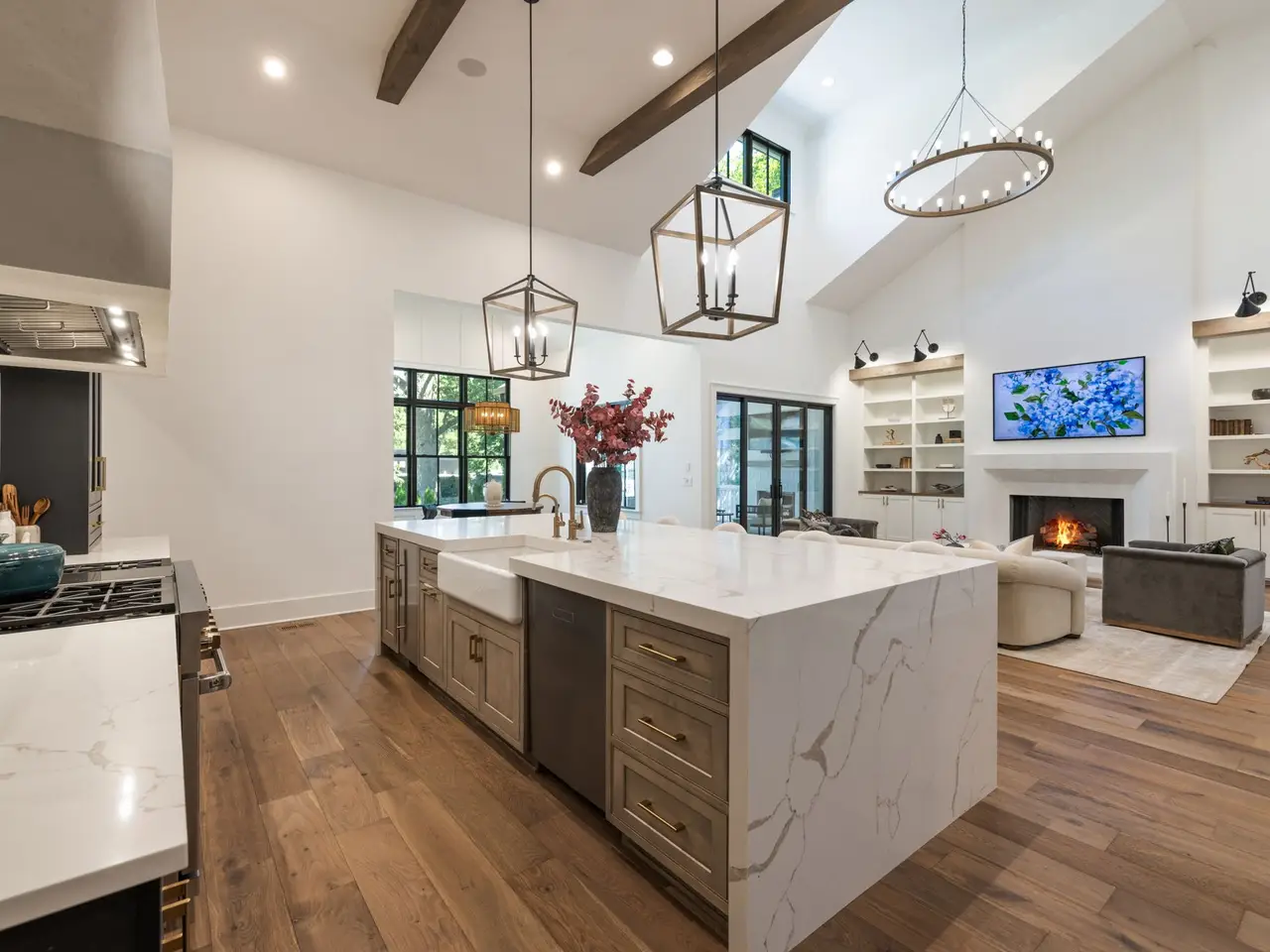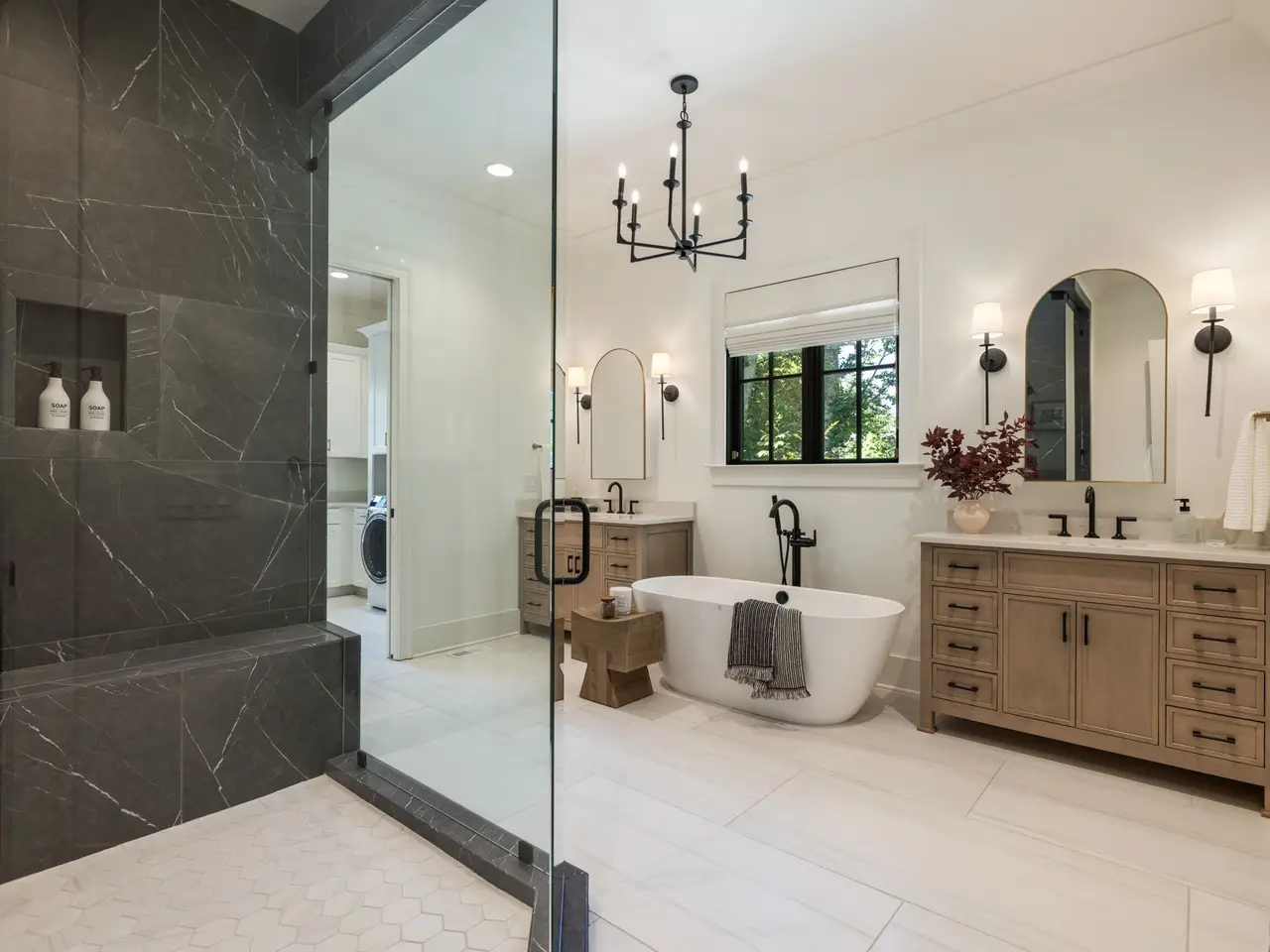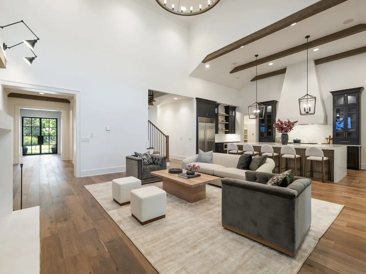 Luxury living meets unbeatable location in this stunning home, just a short drive from the heart of downtown Nashville. Beyond the double glass-paneled front doors, you're welcomed into an elegant entry foyer that flows seamlessly into the formal dining room, complete with accent walls and a show-stopping chandelier. A private vaulted office with custom cabinetry provides the perfect work-from-home retreat, while the open-concept floor plan centers around a soaring two-story great room. Here, custom built-in cabinets, open shelving, and a gas fireplace create a warm yet sophisticated gathering space. The gourmet kitchen is a chef's dream, showcasing a waterfall-edge island, wooden ceiling beams, Wolf appliances, a wet bar, beverage center, and an oversized pantry with abundant shelving and room for a second refrigerator. A light-filled breakfast room connects the living and dining areas, making entertaining effortless. The main-level primary suite is a true retreat with high ceilings, designer accent walls, double vanities, a soaking tub, a floor-to-ceiling tile shower with rain head and built-in bench, and a spacious walk-in closet with custom shelving that conveniently connects to the laundry room. Two additional bedrooms and a full bath complete the main level. Upstairs, you'll find a second laundry room, a generous bonus room with its own wet bar and beverage center, three well appointed bedrooms with en suite baths and walk-in-closets, plus an additional entertaining space that could serve as a media room, playroom, second office, or even an extra bedroom--offering endless possibilities to suit your needs. Step outside to the screened back porch overlooking a private, fenced yard with concrete paver patio--ideal for both relaxation and entertaining. A gated driveway and three-car garage complete this incredible property.