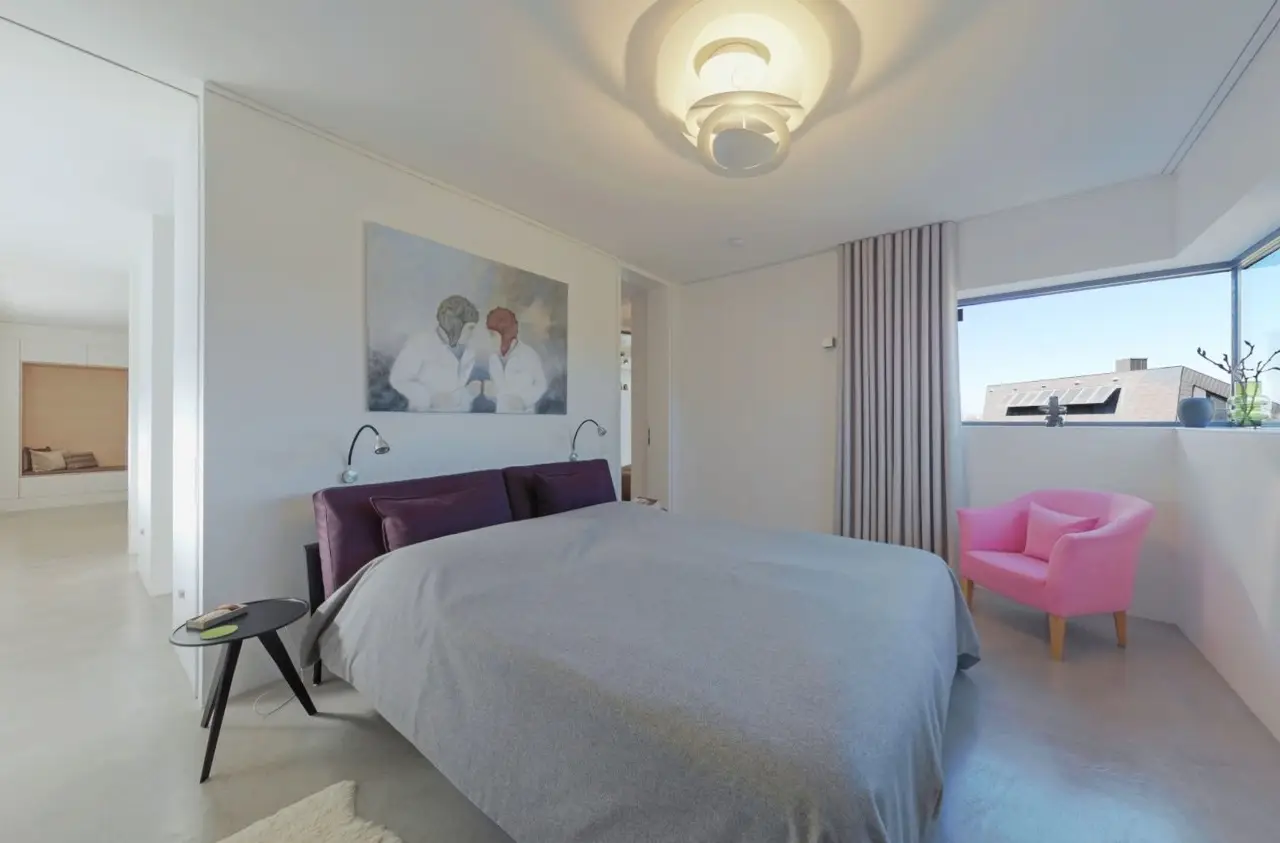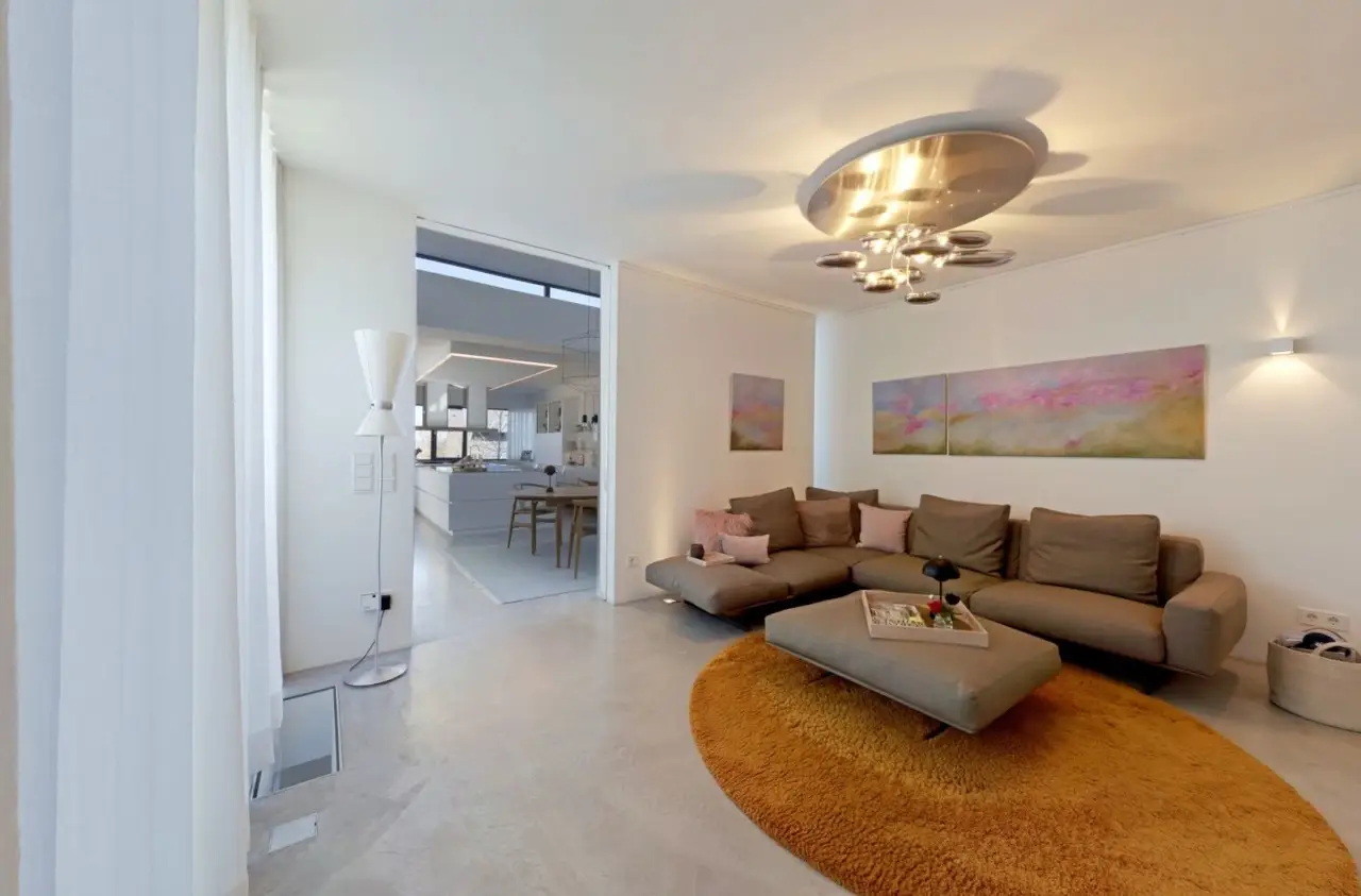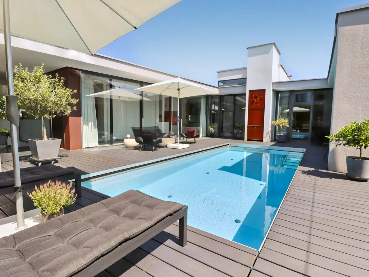 Property with a "conscience" A spacious and luxuriously furnished villa is for sale, which was built in 2006/2007 and has been extensively optimized time and again. It is technically and qualitatively up to date and ready to move into. As soon as you enter the house, you immediately get a feeling of lightness, openness and privacy. This is created by the atrium design combined with extensive window areas, which ensure a natural flood of light and room heights that are extraordinarily generous by local standards (dining area up to 3580 mm, remaining ground floor 2640 mm). Embedded in the "U" of the Atrium house on the ground floor is the beautiful pool surrounded by a large terrace area, which can also be variably extended by a walk-on cover. This is complemented by an integrated barbecue station and an adjacent pond. On the garden level, there is a further terrace area along the living room and bedrooms as well as a beautiful large green area with trees, which offers space for children to play and run around. Last but not least, the attractive kitchen with dining area should be mentioned as the focal point of the house, which invites you to enjoy cooking for yourself as well as "cooking up" with guests. It blends in exceptionally harmoniously with the overall living concept and is superbly equipped. This area is spacious and open to the dining area. A closed fireplace, glazed on two sides, rounds off the overall picture and creates a feel-good atmosphere. The directly adjoining living room can be directly integrated or separated by a floor-to-ceiling sliding door (inside the wall). The entire house is generously equipped with high-quality built-in wardrobes on both the ground floor and the garden level. The plot area is 700 m2. The clever integration of the house into the gentle slope, the garden-side window façade open to nature and the optimal garden design create a unique connection with the directly adjacent natural surroundings. The garden was designed in collaboration with a garden architect. The garden is equipped with a modern, fully automatic irrigation and sprinkler system for all beds and lawns as well as a lighting system controlled by motion detectors. Interested? We would be happy to provide you with a detailed exposé with further information on request. We would be happy to arrange a viewing and present this outstanding property to you in person. Get in touch with us!