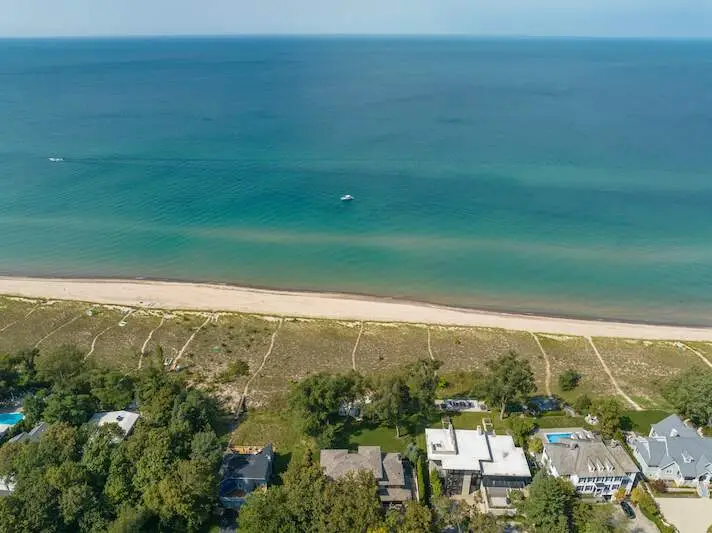 Perched along the shores of Lake Michigan within the exclusive Riviera Association, this 5-bed, 5.5 bath home epitomizes the elegance & timelessness of Lakefront contemporary architecture. Designed in 2013 by the renowned architects Perkins, Pryde & Kennedy & completed in 2015, this 5,000+ sq ft home masterfully represents a modified Prairie Style design full of modern luxury & stunning natural surroundings. Exquisite hardwood floors infuse warmth into every room. Expansive glass walls offer panoramic views of Lake Michigan, seamlessly connecting the indoor & outdoor spaces. The open and light-filled design allows residents to fully immerse themselves in the tranquil landscape. Featuring five spacious bedrooms and five and a half beautifully appointed baths. Each ensuite bedroom is thoughtfully designed to provide comfort & a sense of serenity. The living areas are characterized by their openness, flooded with natural light, and offering breathtaking vistas of the lake. Enjoy the all-level elevator for convenience; private lakefront office; lush green lawn with plenty of room for a pool; spacious decks; Elan Smart Home system; beach cabana for relaxing by the shore & easy access to the private association beach via a low bluff. For the discerning buyer who desires more than just a home, this work of art captures the essence of Lakefront Contemporary design while offering modern luxury.