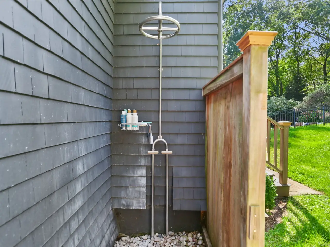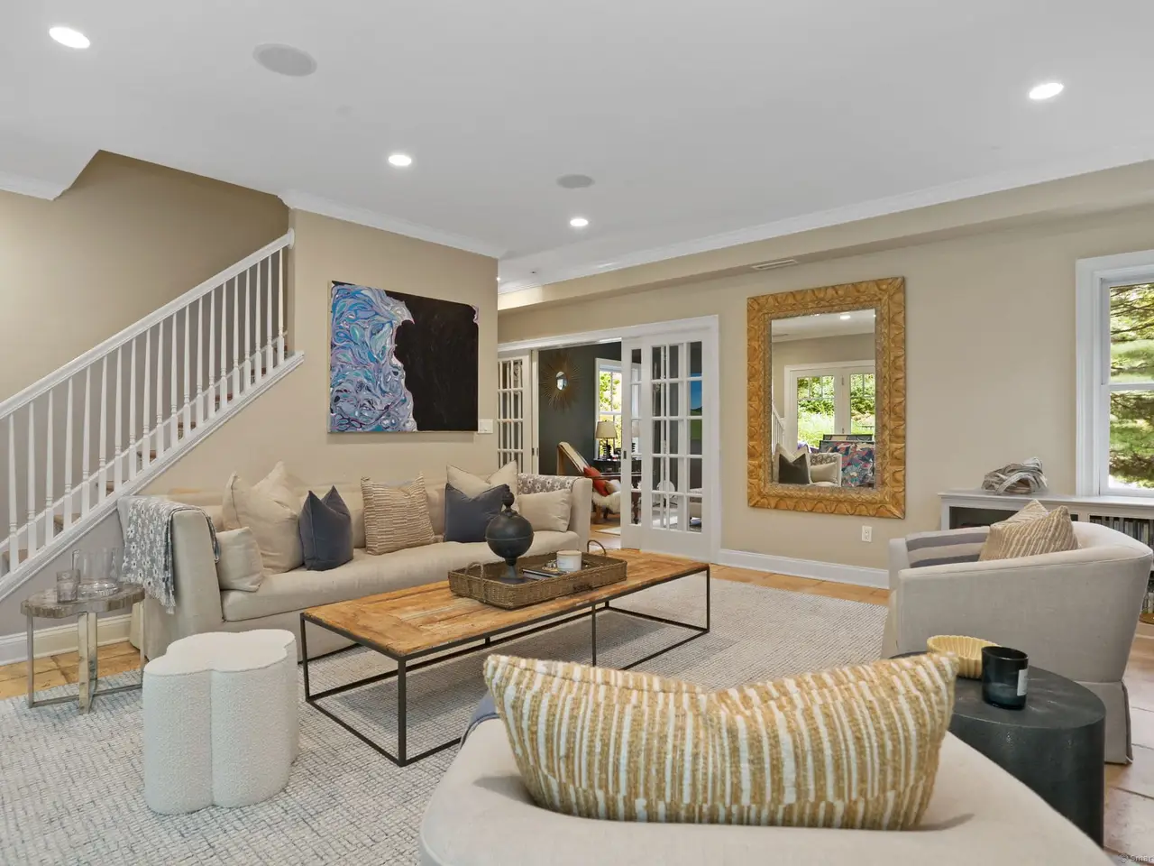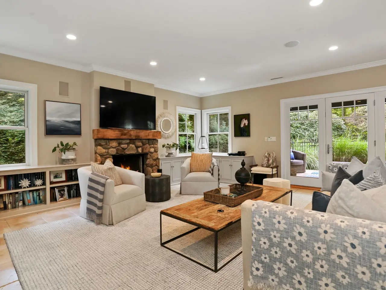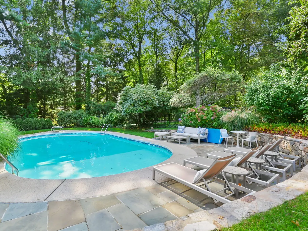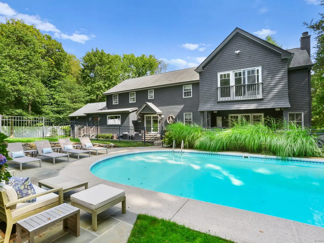 Located in the highly sought-after Behind the Y neighborhood, this expanded and beautifully renovated 5-bedroom Colonial is truly move-in ready. Sited on 1.25 acres of flat, open land, the home offers three finished levels of thoughtfully designed living space. The renovated chef's kitchen features a breakfast bar, eat-in dining area, and opens seamlessly to the family room with custom built-ins-perfect for modern living and entertaining. The impressive addition boasts 9 ft ceilings, a vaulted great room with a striking fieldstone fireplace, a private study, and a stylish wet bar. French doors lead to a covered porch overlooking the professionally landscaped pool and terrace. The spacious primary suite includes two walk-in closets and a spa-like bath. Enjoy the perfect blend of indoor and outdoor living-all with sidewalks to town, Waveny Park, the YMCA, and top-rated schools.