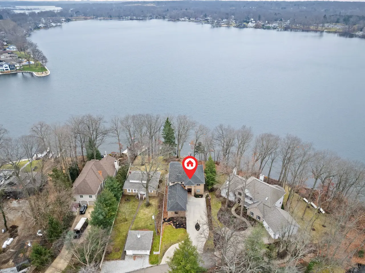 Point Comfort lakefront - panoramic water views - private dock - prime peninsula location on main chain of Portage Lakes. Entry foyer offers views to the lake, new entry door 2022. Great room with wall of windows featuring stunning water views, floor-to-ceiling fireplace encased in natural stone (2022), two story ceilings, and new carpet 2022. Immaculate home featuring numerous recent updates including new roof June 2023 and gorgeous exterior lighting. The kitchen is a chef's and entertainer's dream, opens to a great room/dining area and features stainless KitchenAid appliances 2022, large center island, breakfast bar, and dining area with water views, walk-in pantry adjoins kitchen. Relax and enjoy the views year-round in the four-seasons room with new slider (2022) to lakefront backyard. The expansive owners retreat located on the second-floor features stunning water views, expansive walk-in closet with dressing mirror and secondary walk-in closet. French door from owner’s retreat leads to a private office with extensive built-in cabinetry and beautiful views. Owner's en suite includes a spa tub, separate shower, dual sinks, separate makeup/vanity area. First floor bedroom has a private bathroom, walk-in closet and main floor flex space adjacent to kitchen perfect for your home hub, office, playroom etc. The laundry room located on the main floor provides an abundance of cabinetry, folding table, laundry chute, and utility sink. The third bedroom includes a private bathroom and walk-in closet. The oversized three-car garage offers an abundance of additional storage, direct access to the basement storage area, man door, hot and cold water, drains and finished drywall. Custom brick residence, circular driveway and an abundance of parking. Above ground living area approximately 3,397 square feet, per owner from building plans and approximately 1,200 square feet of partially finished (unfinished drywall) basement area, rough plumbed for half bath and ready for your personal touches/finishes.