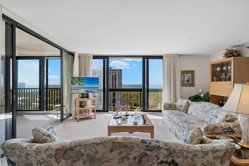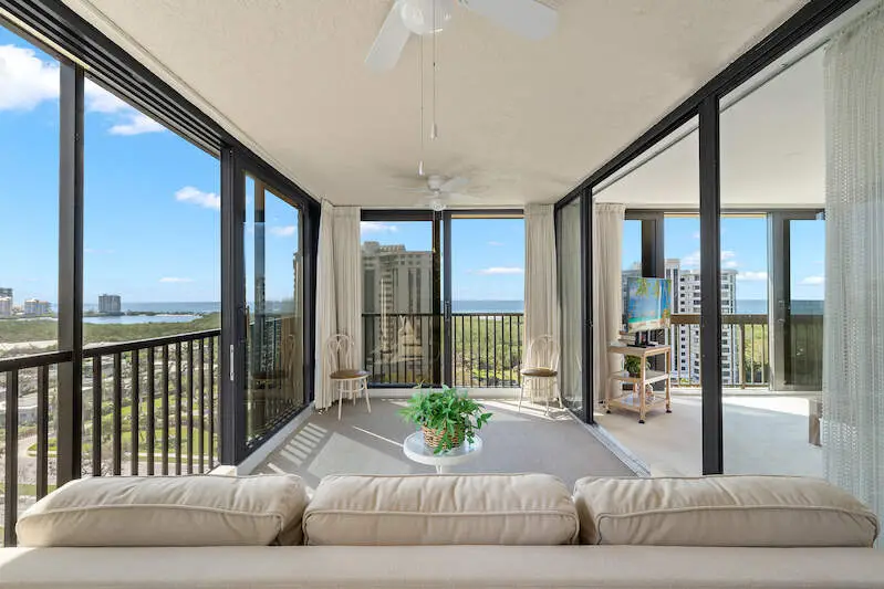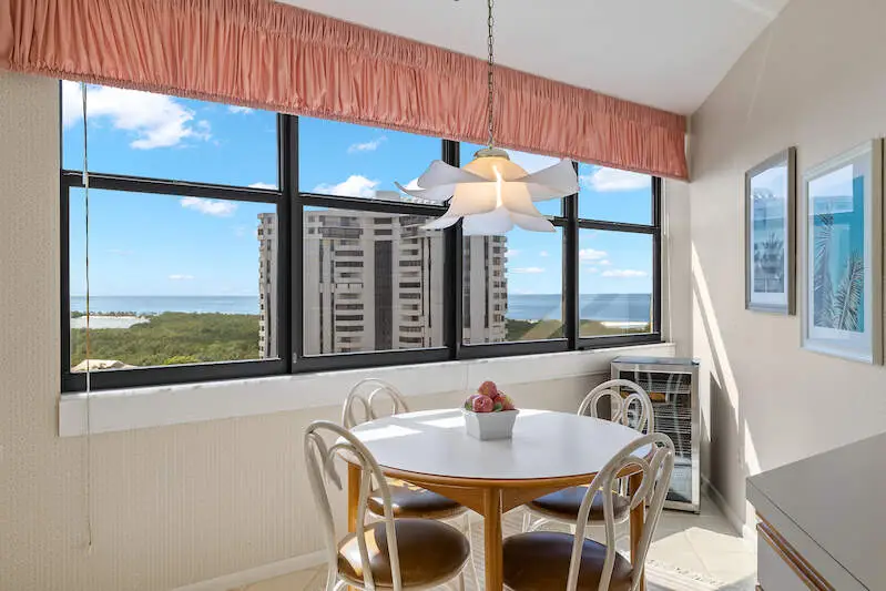 Welcome to this desirable 12th-floor condo in the highly sought-after Chateaumere community of Pelican Bay, where breathtaking panoramic southwest views of Clam Pass, the Gulf of Mexico, and mesmerizing sunsets with twinkling lights of downtown Naples await you. This stunning 2-bedroom, 2-bathroom fully furnished unit with a spacious enclosed lanai is truly a paradise in the sky. The open-concept floor plan ensures a seamless flow from room to room, enhancing comfort and convenience. The living area is bathed in natural light, thanks to large impact-resistant windows and sliding glass doors that frame extraordinary views. The eat-in kitchen boasts full views of the white sand beaches, making every meal a scenic delight. The spacious Master Suite is a tranquil oasis, featuring an en-suite bathroom with a double vanity and a walk-in shower. The guest bedroom and hall bath provide additional comfort for visitors. Residents of Chateaumere Royale enjoy access to 3 swimming pools, a fitness center, 3 guest suites, bike storage rooms, and a community room with a full kitchen and pool table, along with all the amenities of Pelican Bay. Pelican Bay offers tram service to 2 private beach clubs equipped with chairs umbrellas and kayaks, as well as 2 private restaurants open for lunch and dinner. The club features 18 tennis courts, another fitness center, and even yoga on the beach. Chateaumere is set on nearly 10 acres and is conveniently located less than 2 miles from Artis Fine Arts Theatre and Waterside Shops with fine dining and shopping. Centrally located near Mercato, Whole Foods, Fresh Market, and much more! Easy access to downtown Naples, renowned for its fine dining, shopping, and beautiful beaches.This condo comes with a rental with income.