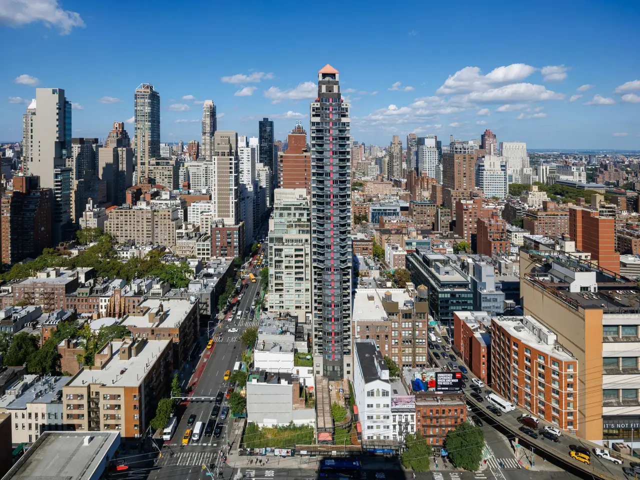 A Published Masterpiece in the Sky  Perched on the coveted northeast corner of the 35th floor, this residence is offered for the first time since its masterful designer renovation by Sarah Zames & Colin Stief of General Assembly. Reimagined with a clean material palette, the home balances refined architecture with effortless livability.  Walls of glass frame panoramic views across the ever-changing East Side skyline, creating a home of many moods and scenes. With balconies on both sides of the apartment, the vistas can be enjoyed from the outdoors as well. As Dezeen observed in its feature on the residence, the architects sought "a balance between the feeling of being in the air, while being grounded by the weight of the building."  The custom kitchen is anchored by a concrete waterfall island with a built-in wine fridge and microwave drawer. Light wood cabinetry frames the Thermador suite, including a 6-burner gas cooktop and oven, Sapphire Glow dishwasher, and refrigerator with Open Door Assist- just a gentle touch opens the door, the ultimate luxury detail.  Windows line the kitchen, filling the space with light and lively city views, turning daily routines into moments of enjoyment. Honed Caesarstone counters and a sophisticated ceramic tile backsplash complete the modern design, while built-in shelving offers a stylish home for barware, vases, and everyday essentials.  The primary suite offers a serene retreat, complete with two closets plus a 14-foot walk in by California Closets. Pocket doors provide quiet separation, while custom millwork introduces floating bedside tables and subtle ledges for art or keepsakes. A unique architectural opening filters natural light between the bedroom and bath, elevating both spaces.   The ensuite is finished with a travertine vanity, soaking tub, Japanese washlet, matte black fixtures, and richly hued vertical tile, a striking marriage of warmth and refinement.  The second bedroom includes a generous closet and is enclosed by a sliding panel of reeded glass, a purposeful design choice that allows natural light to filter through while maintaining privacy. This thoughtful detail makes the room ideal not only as a bedroom but also as a home office or den. The other full bath features a stall shower, midnight cabinetry, travertine vanity, brass fixtures, and a Japanese washlet.  Additional thoughtful details include discreet TV wall behind sliding door, built-in entry storage, motorized shades, Lutron-controlled lighting, anti-UV window films, and split AC units in the bedrooms.  The Landmark is a full-service luxury building offering a modern lobby, landscaped roof deck, garage with Zipcar, and on-floor washer/dryer access. Two dogs or cats are welcome per apartment!