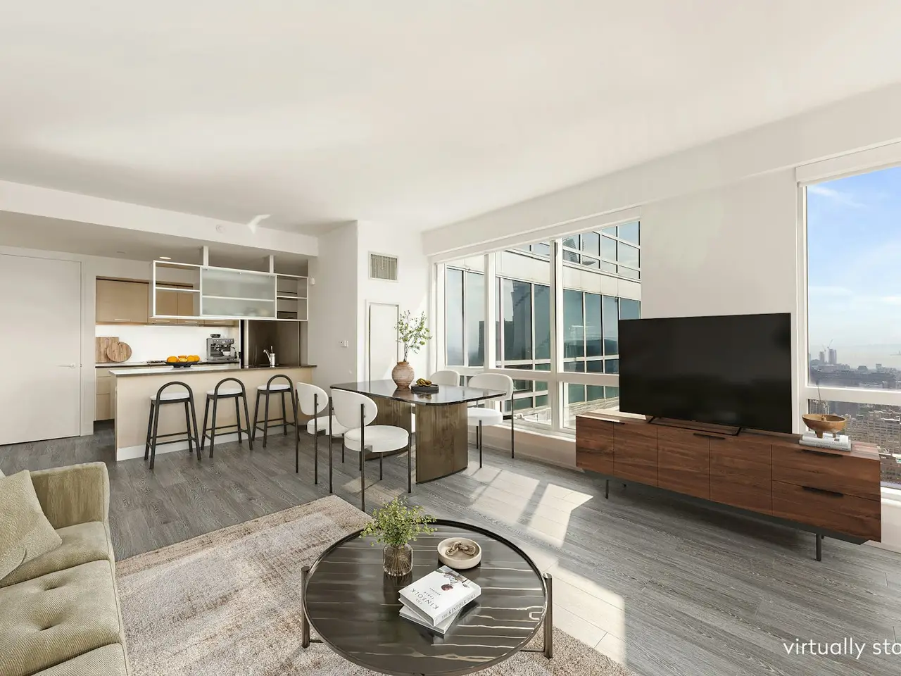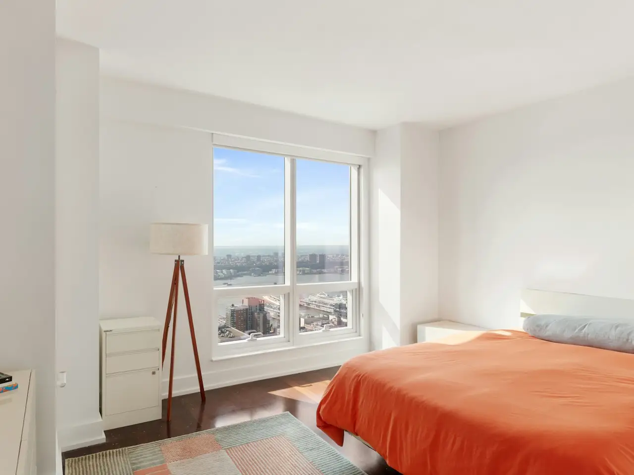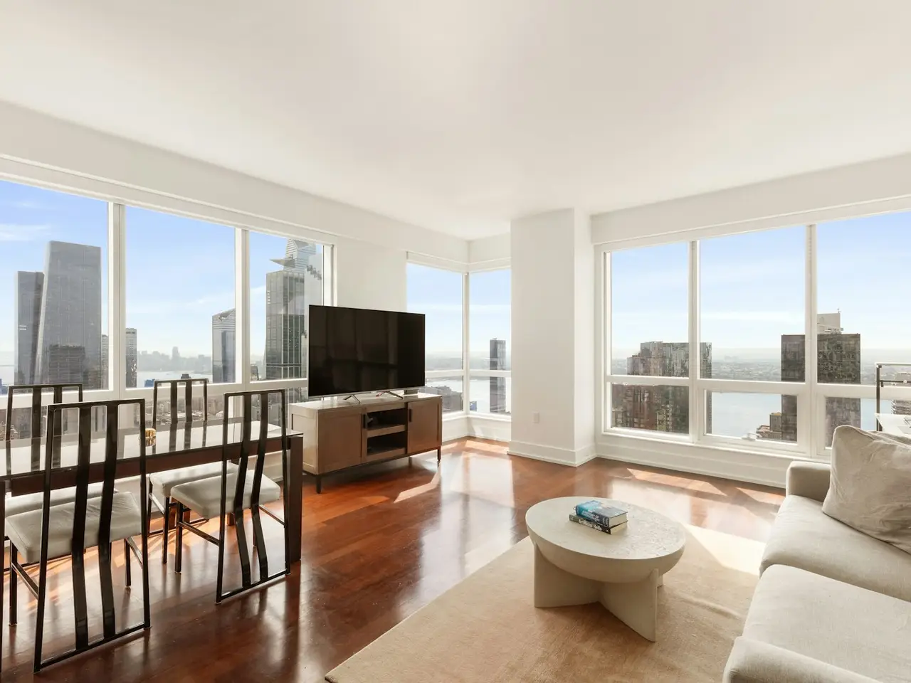 Floor-to-ceiling windows with panoramic city and river views